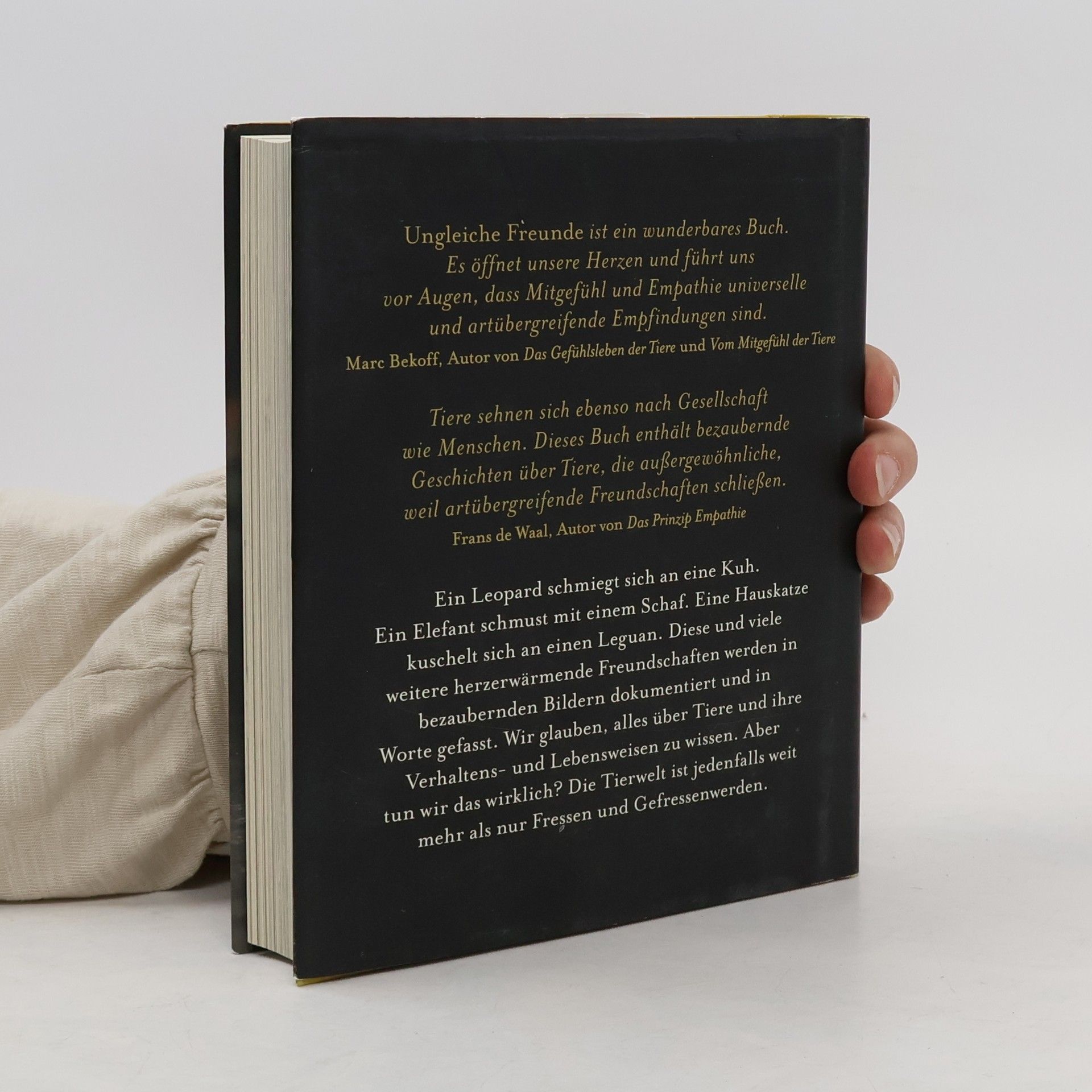 Ungleiche Freunde ist ein wunderbares Buch. Wenn wir die großartigen Lebewesen, mit denen wir unseren Planeten teilen, mit offenen Augen und Herzen wahrnehmen, erkennen wir, dass Mitgefühl und Empathie universelle und artübergreifende Empfindungen sind.Marc Bekoff, Autor von Das Gefühlsleben der Tiere und Vom Mitgefühl der Tiere.Tiere sehnen sich ebenso nach Gesellschaft wie Menschen. Dieses Buch enthält bezaubernde Geschichten über Tiere, die außergewöhnliche, weil artübergreifende Freundschaften schließen. Frans de Waal, Autor von Das Prinzip Empathie Ein Leopard schmiegt sich an eine Kuh. Ein Elefant schmust mit einem Schaf. Eine Hauskatze kuschelt sich an einen Leguan. Diese und viele weitere herzerwärmende Freundschaften werden in bezaubernden Bildern und Geschichten dokumentiert. Wir glauben, alles über Tiere und ihre Verhaltens- und Lebensweisen zu wissen. Aber tun wir das wirklich? Die Tierwelt ist jedenfalls viel mehr ist als nur Fressen und Gefressenwerden.