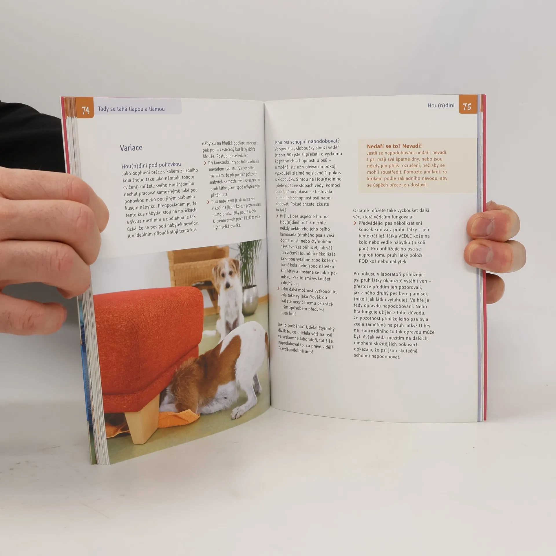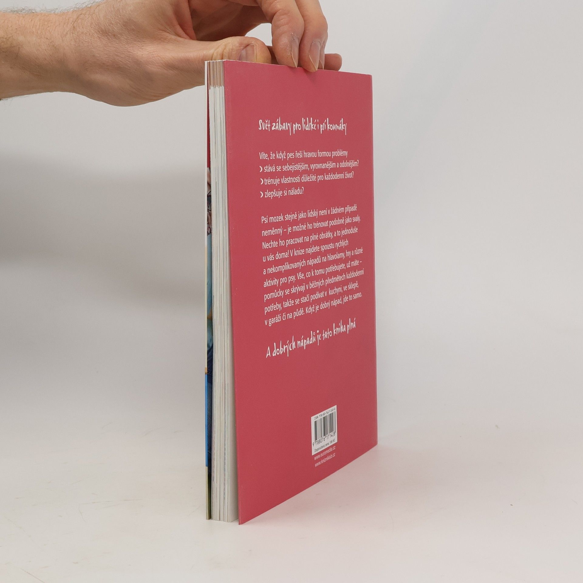 Kniha nabízí řadu praktických návodů, jak důkladně procvičit šedou kůru mozkovou vašeho čtyřnohého kamaráda. A nemusíte nic kupovat: pomůcky pro nekonečnou zábavu s hlavolamy už máte doma. Skrývají se v předmětech každodenní potřeby v kuchyni, ve sklepě, v garáži a na půdě a čekají jen na nápad, jak je použít. Bohatě ilustrovaná publikace uvádí množství originálních her, při kterých pes musí použít tlapu, čenich a do velké míry zapojit i hlavu. Aby se dostal k pamlsku nebo oblíbené hračce, nezbývá mu než přijít na kloub různým mechanismům: například ovládat kousek rourky, zkusit štěstí ve hrách s kloboučky na různých podložkách, vytáhnout psí udici nebo – v pravém smyslu slova – myslet za roh... Vítejte v dílně na hlavolamy.
