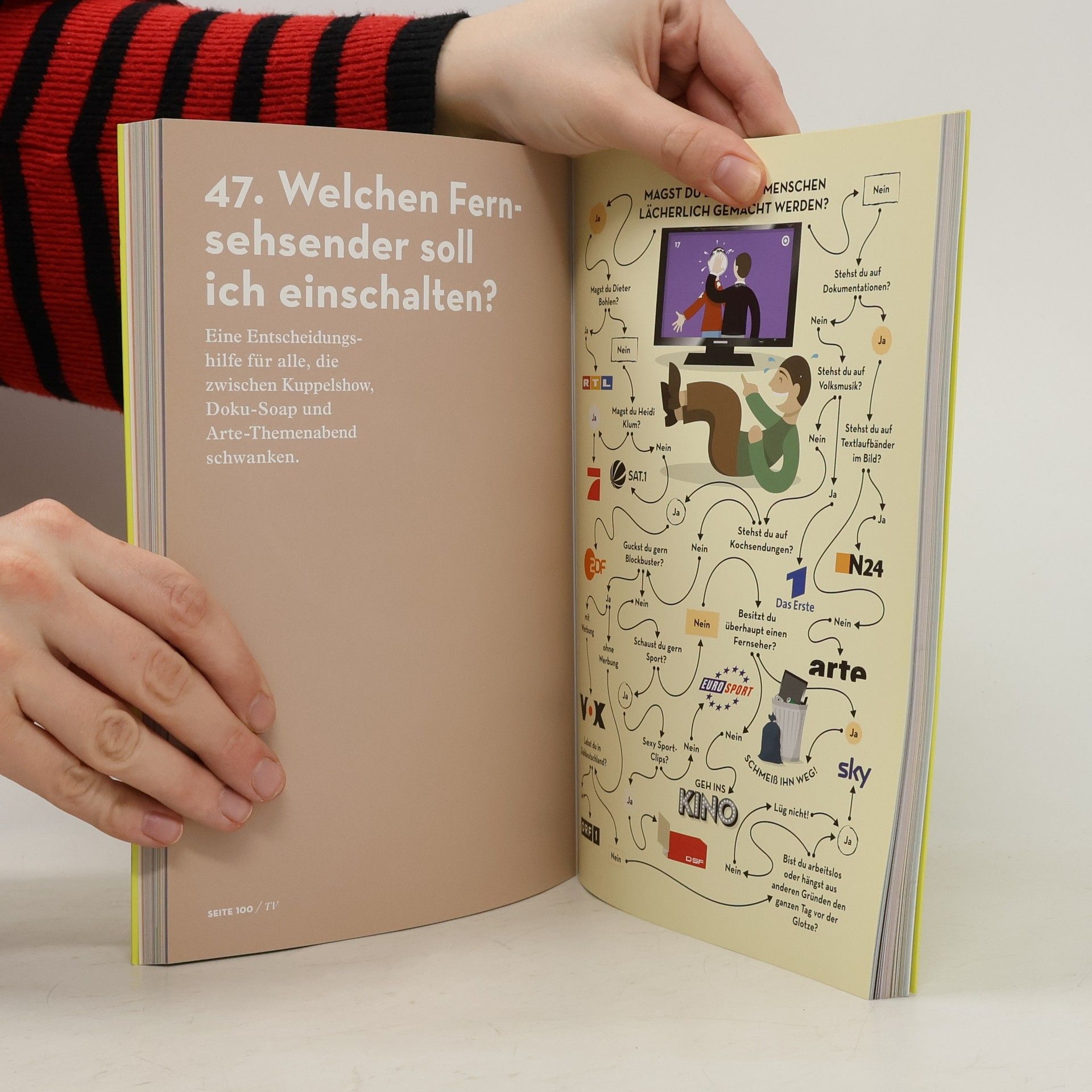 Hast du Lust auf das verrückteste Buch des Jahres? Nein? Vielleicht? Oder doch lieber ja? Heike Kottmann, die Erfinderin der NEON-Rubrik „Entscheidungsbäume“ präsentiert die lustigsten, aberwitzigsten und lebenswichtigsten Entscheidungen, denen man sich tagtäglich stellen muss: Soll ich aufstehen oder lieber liegen bleiben? Heimgehen oder noch ein Bier trinken? Und überhaupt: Welches Tattoo passt zu mir? In einem rasanten Frage-Antwort-Spiel gelangt garantiert jeder zu einer Entscheidung. Zum Lachen, Ausprobieren, Spaß haben!