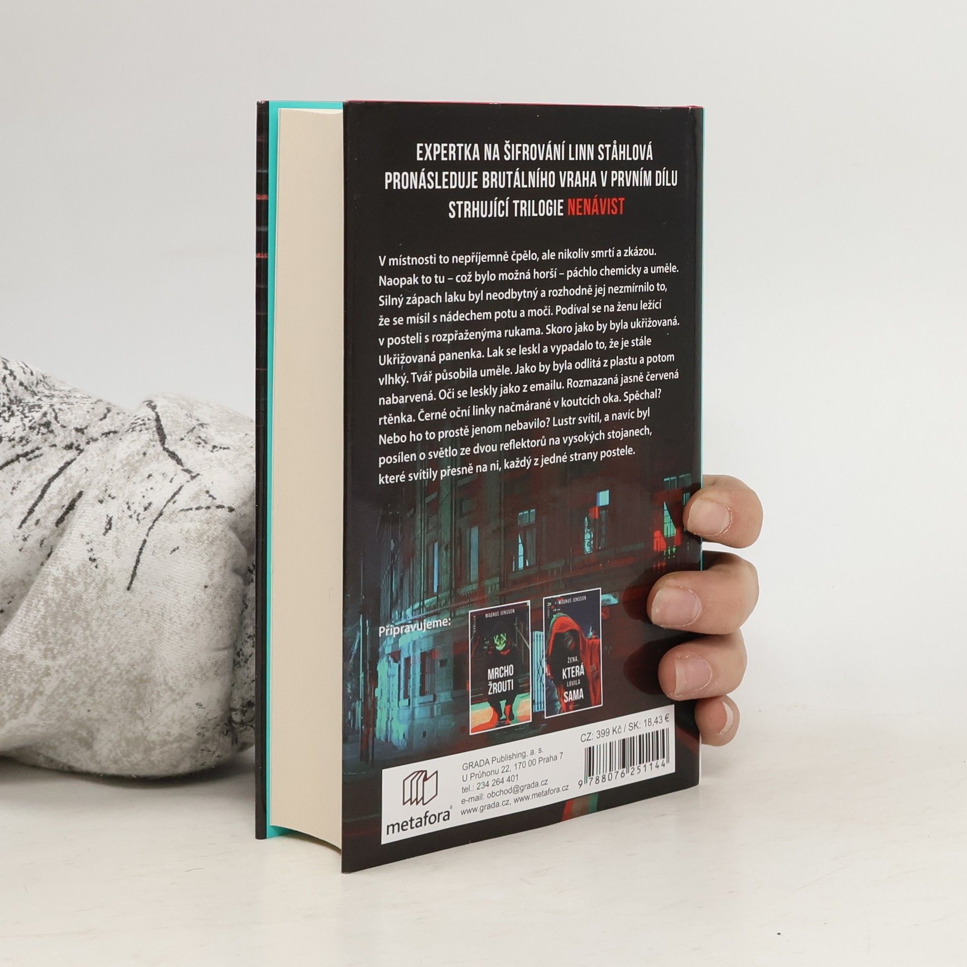 Nenávist se probouzí... Expertka na šifrování Linn Ståhlová pronásleduje brutálního vraha v prvním dílu strhující trilogie NENÁVIST. Ve Stockholmu někdo zabíjí ženy. Těla za sebou zanechává naaranžovaná jako porcelánové panenky. Detektivové Rickard Stenlander a Erik Svensson osloví s žádostí o pomoc při vyšetřování expertku na počítače a kryptologii Linn Ståhlovou. Má to ale háček – Linn je bývalou členkou Antifašistické akce, organizace vedené na černé listině švédské tajné služby, v minulosti byla souzena za zločiny proti národní bezpečnosti a vůči spolupráci s policií proto zaujímá dost skeptický postoj. Hodiny ale tikají, a jestli má nesourodý tým zastavit sériového vraha, musí jít osobní problémy stranou. Zatímco se pátrání naplno rozbíhá, Linniny aktivity upoutají pozornost pravicových extrémistů, kteří mají s Linn z dřívějška nevyřízené účty. Mezi vyšetřovateli roste nedůvěra a podezření, že ne všichni sledují stejný cíl, a minulost dohání Linn způsobem, jakým to nejméně čeká.