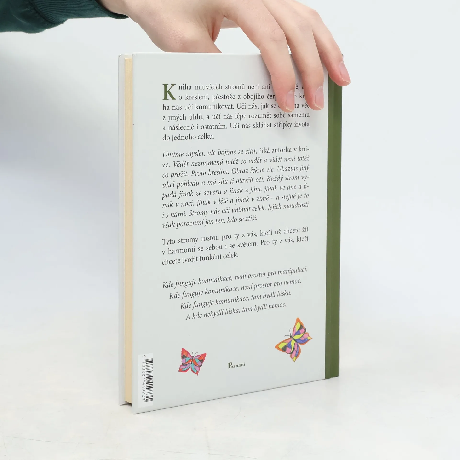 Kniha mluvících stromů není ani o přírodě, ani o kreslení, přestože z obojího čerpá. Tato kniha nás učí komunikovat. Učí nás, jak se dívat na věc z jiných úhlů, a učí nás lépe rozumět sobě samému a následně i ostatním. Učí nás skládat střípky života do jednoho celku. Umíme myslet, ale bojíme se cítit, říká autorka v knize. Vědět neznamená totéž co vidět a vidět není totéž co prožít. Proto kreslím. Obraz řekne víc. Ukazuje jiný úhel pohledu a má sílu ti otevřít oči. Každý strom vypadá jinak ze severu a jinak z jihu, jinak ve dne a jinak v noci, jinak v létě a jinak v zimě – a stejné je to i s námi. Stromy nás učí vnímat celek. Jejich moudrosti však porozumí jen ten, kdo se ztiší. Tyto stromy rostou pro ty z vás, kteří už chcete žít v harmonii se sebou i se světem. Pro ty z vás, kteří chcete tvořit funkční celek. Kde funguje komunikace, není prostor pro manipulaci. Kde funguje komunikace, není prostor pro nemoc. Kde funguje komunikace, tam bydlí láska. A kde nebydlí láska, tam bydlí nemoc.