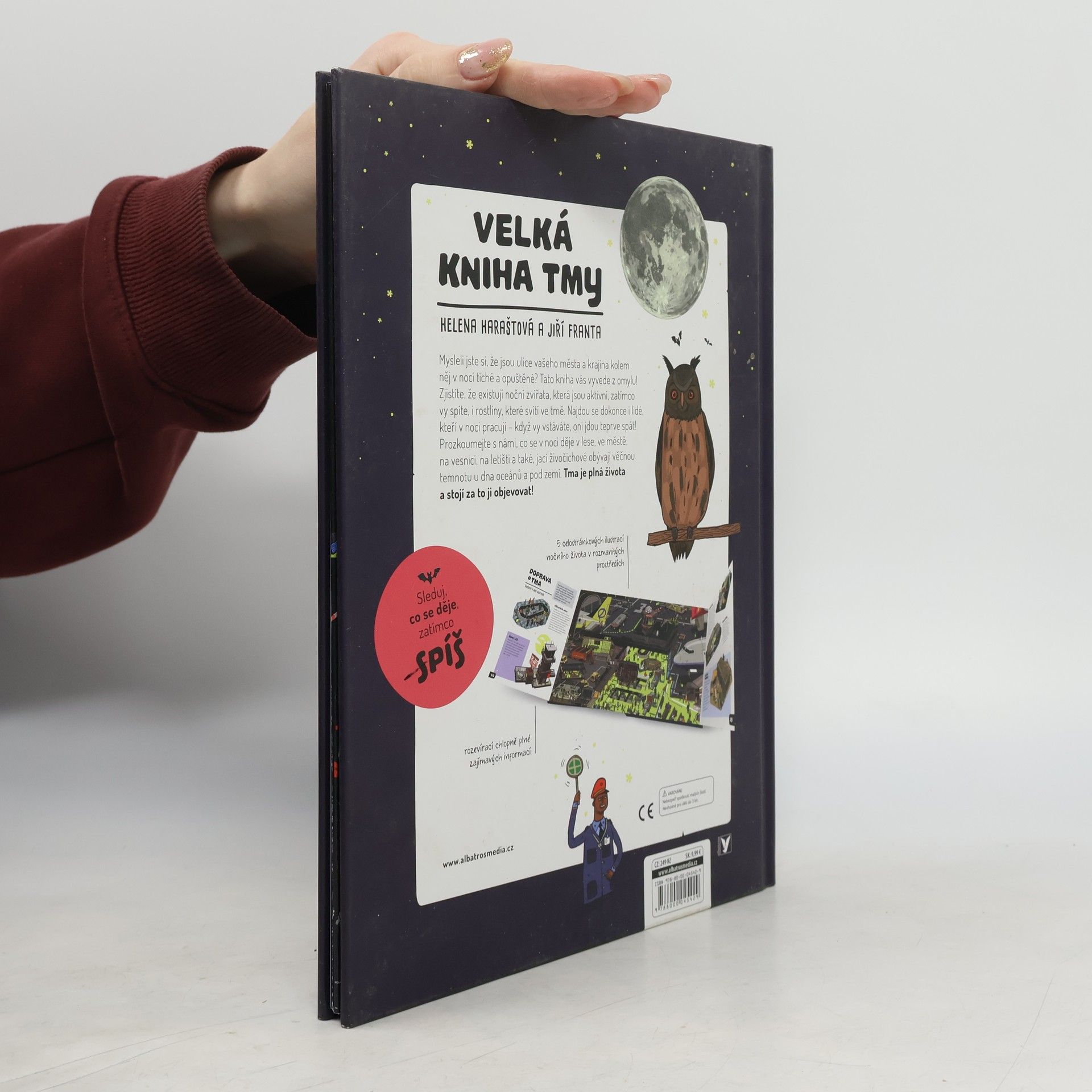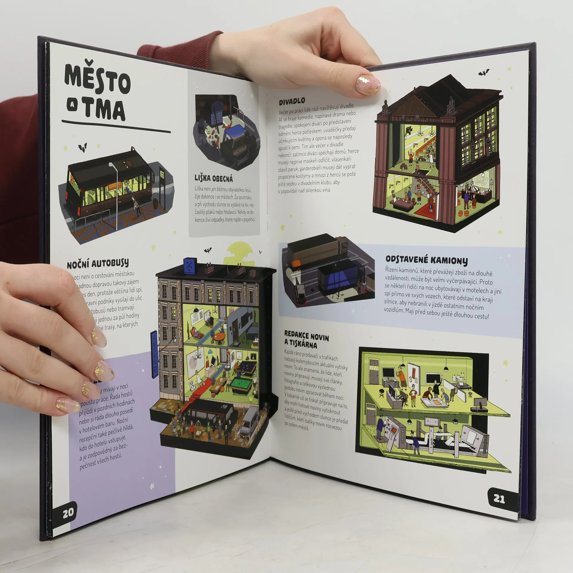 Mysleli jste si, že jsou ulice vašeho města a krajina kolem něj v noci tiché a opuštěné? Tato kniha vás vyvede z omylu! Zjistíte, že existují noční zvířata, která jsou aktivní, zatímco vy spíte, i rostliny, které svítí ve tmě. Najdou se dokonce i lidé, kteří v noci pracují – když vy vstáváte, oni jdou teprve spát! Prozkoumejte s námi, co se v noci děje v lese, ve městě, na vesnici, na letišti a také, jací živočichové obývají věčnou temnotu u dna oceánů a pod zemí. Tma je plná života a stojí za to ji objevovat!