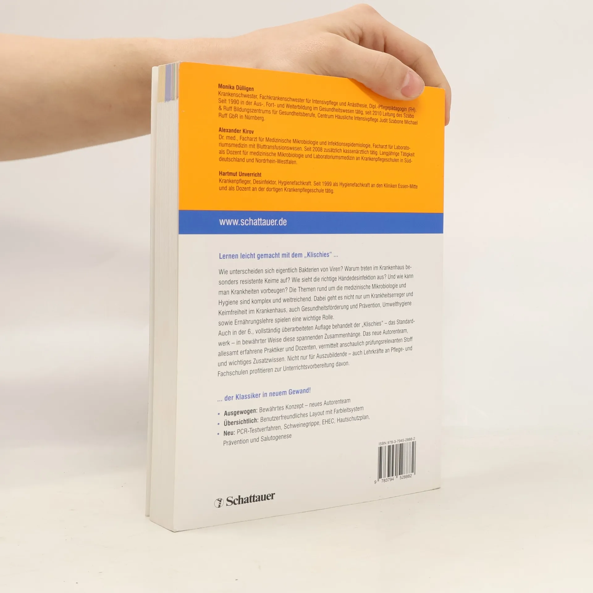 Lernen leicht gemacht mit dem „Klischies“ ... Wie unterscheiden sich eigentlich Bakterien von Viren? Warum treten im Krankenhaus besonders resistente Keime auf? Wie sieht die richtige Händedesinfektion aus? Und wie kann man Krankheiten vorbeugen? Die Themen rund um die medizinische Mikrobiologie und Hygiene sind komplex und weitreichend. Dabei geht es nicht nur um Krankheitserreger und Keimfreiheit im Krankenhaus, auch Gesundheitsförderung und Prävention, Umwelthygiene sowie Ernährungslehre spielen eine wichtige Rolle. Auch in der 6., vollständig überarbeiteten Auflage behandelt der „Klischies“ – das Standardwerk – in bewährter Weise diese spannenden Zusammenhänge. Das neue Autorenteam, allesamt erfahrene Praktiker und Dozenten, vermittelt anschaulich prüfungsrelevanten Stoff und wichtiges Zusatzwissen. Nicht nur für Auszubildende – auch Lehrkräfte an Pflege- und Fachschulen profitieren zur Unterrichtsvorbereitung davon. ... der Klassiker in neuem Gewand!