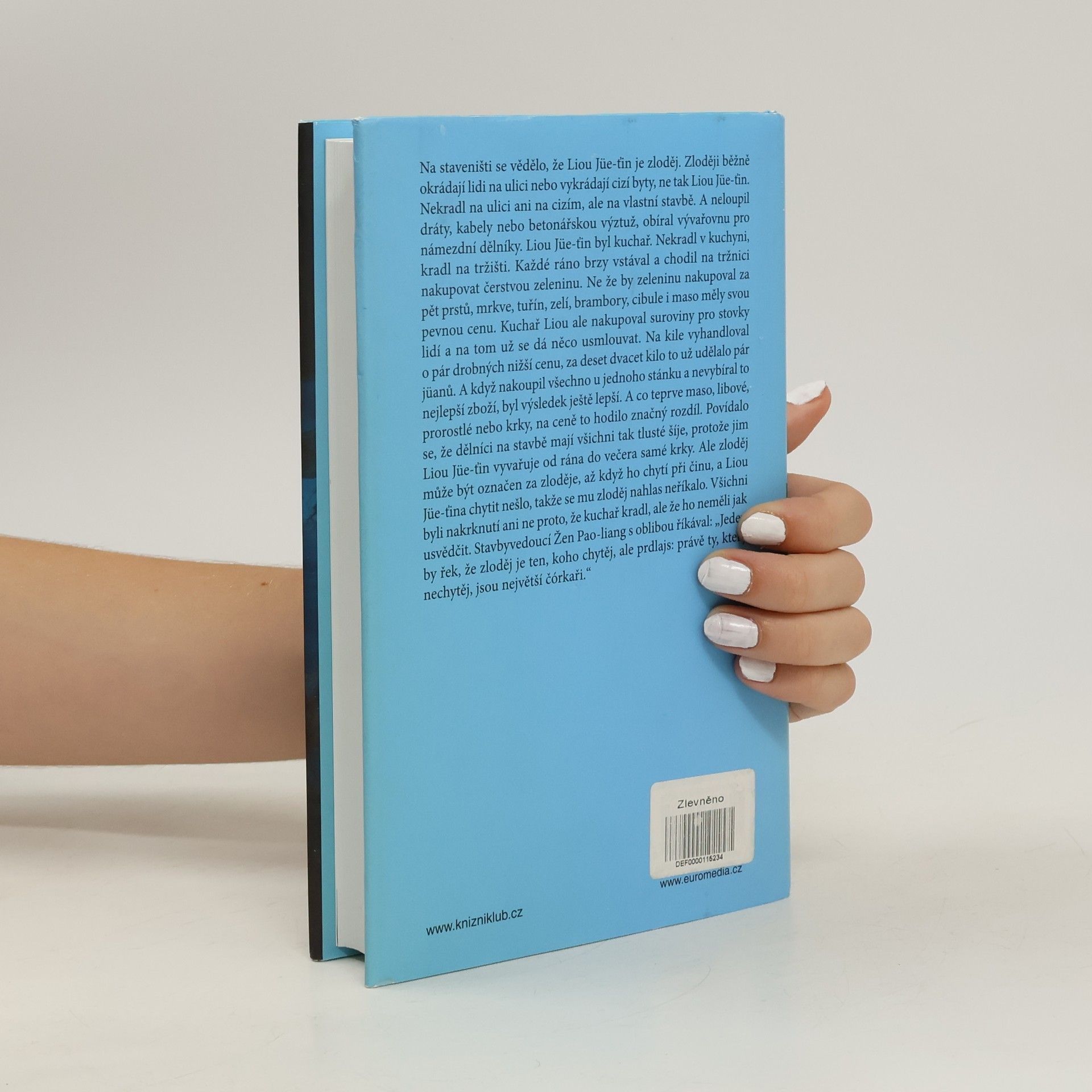 Kuchař se jmenuje Liou Jüe-ťin. Přijde o svou ledvinku. Pustí se do hledání, a jak hledá, najde cizí kabelku. Ta však ukrývá tajemství nebezpečné pro pár vysoce postavených. Začíná hon na kuchaře Liou Jüe-ťina. Tady už jde do tuhého. Když se ovečka nevědomky ocitne uprostřed vlčí smečky, bývá z toho pořádná mela. Román s přitažlivým názvem Kuchař, chmaták a realitní magnát je podobná fraška jako Manžela jsem nezabila, autorova první česky vydaná kniha. Je ale pestřejší, hutnější a možná i humornější.