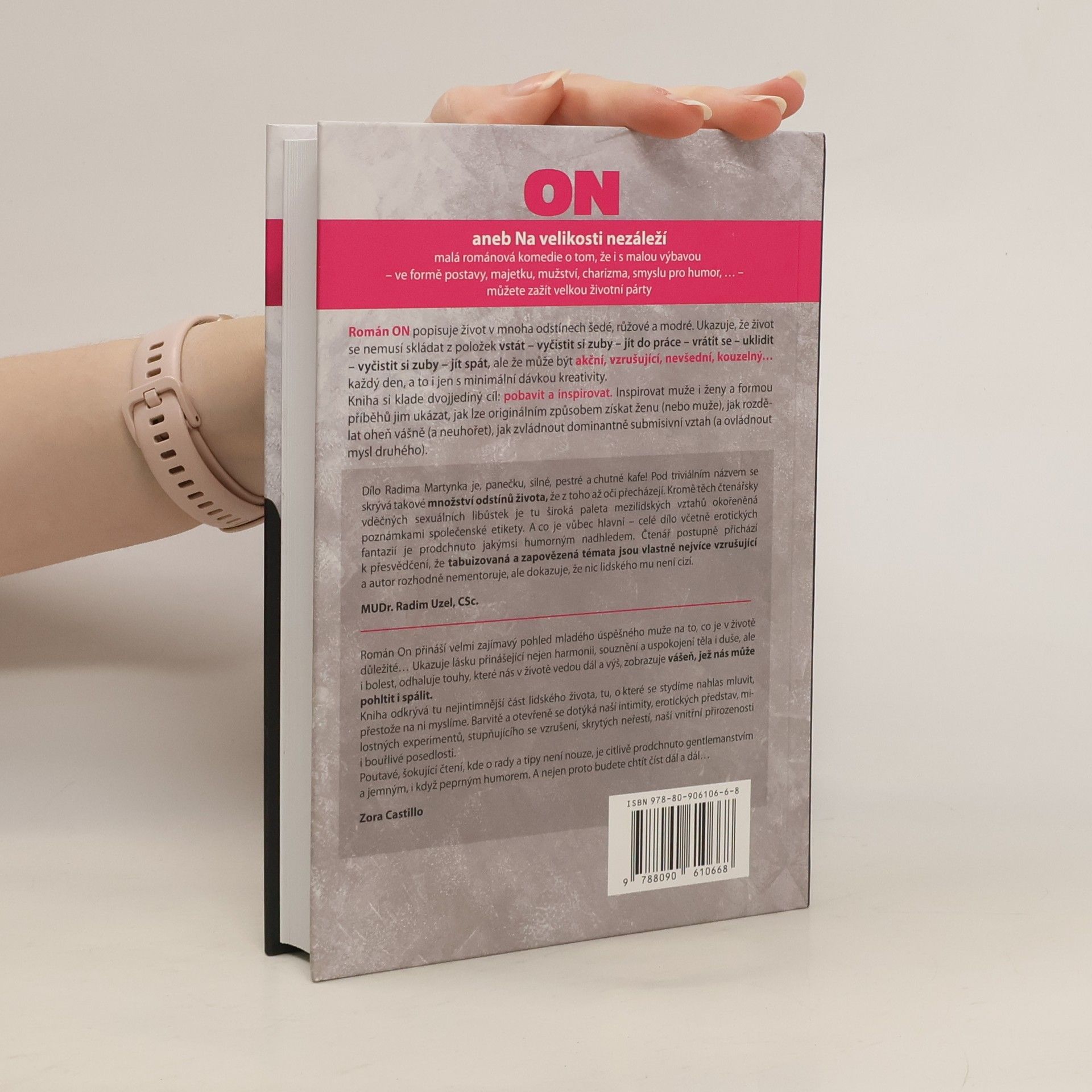 Román On s podtitulkem Na velikosti nezáleží je malá románová komedie o tom, že i s malou výbavou – ve formě postavy, majetku, mužství, charizma, smyslu pro humor, … – můžete zažít velkou životní párty. Román popisuje život v mnoha odstínech šedé, růžové a modré. Ukazuje, že život se nemusí skládat z položek vstát – vyčistit si zuby – jít do práce – vrátit se – uklidit – vyčistit si zuby – jít spát, ale že může být akční, vzrušující, nevšední, kouzelný… každý den, a to i jen s minimální dávkou kreativity. Kniha si klade dvojjediný cíl: pobavit a inspirovat (ne zrovna v tomto pořadí). Inspirovat muže i ženy a formou příběhů jim ukázat, jak lze originálním způsobem získat ženu (nebo muže), jak rozdělat oheň vášně (a neuhořet), jak zvládnout dominantně submisivní vztah (a ovládnout mysl druhého). Oproti trilogii Padesát odstínů šedi/temnoty/svobody se román On zaměřuje na dalších devětačtyřicet odstínů sexuálního života, proto inspiraci v něm najdou začátečníci i pokročilí.
