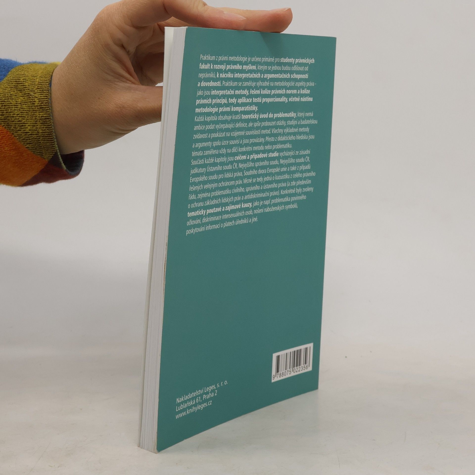Praktikum z právní metodologie je určeno primárně pro studenty právnických fakult, aby rozvíjeli právní myšlení, které je odliší od neprávníků, a aby si osvojili interpretační a argumentační dovednosti. Zaměřuje se na metodologické aspekty práva, jako jsou interpretační metody, řešení kolizí právních norem a principů, včetně testů proporcionality a metodologie právní komparatistiky. Každá kapitola obsahuje teoretický úvod, který stimuluje otázky a badatelskou zvídavost, a ukazuje vzájemné souvislosti metod. Témata se soustředí na konkrétní metody nebo problematiky, přičemž všechny výkladové metody a argumenty jsou úzce provázány. Součástí kapitol jsou cvičení a případové studie vycházející z judikatury Ústavního soudu ČR, Nejvyššího správního soudu, Nejvyššího soudu ČR, Evropského soudu pro lidská práva a Soudního dvora Evropské unie, stejně jako z případů řešených veřejným ochráncem práv. Tato kazuistika pokrývá široké spektrum právního řádu, zejména civilní, správní a ústavní právo, se zaměřením na ochranu základních lidských práv a antidiskriminační právo. Zvoleny byly tematicky zajímavé kauzy, jako je problematika povinného očkování, diskriminace intersexuálních osob, nošení náboženských symbolů a poskytování informací o platech úředníků.