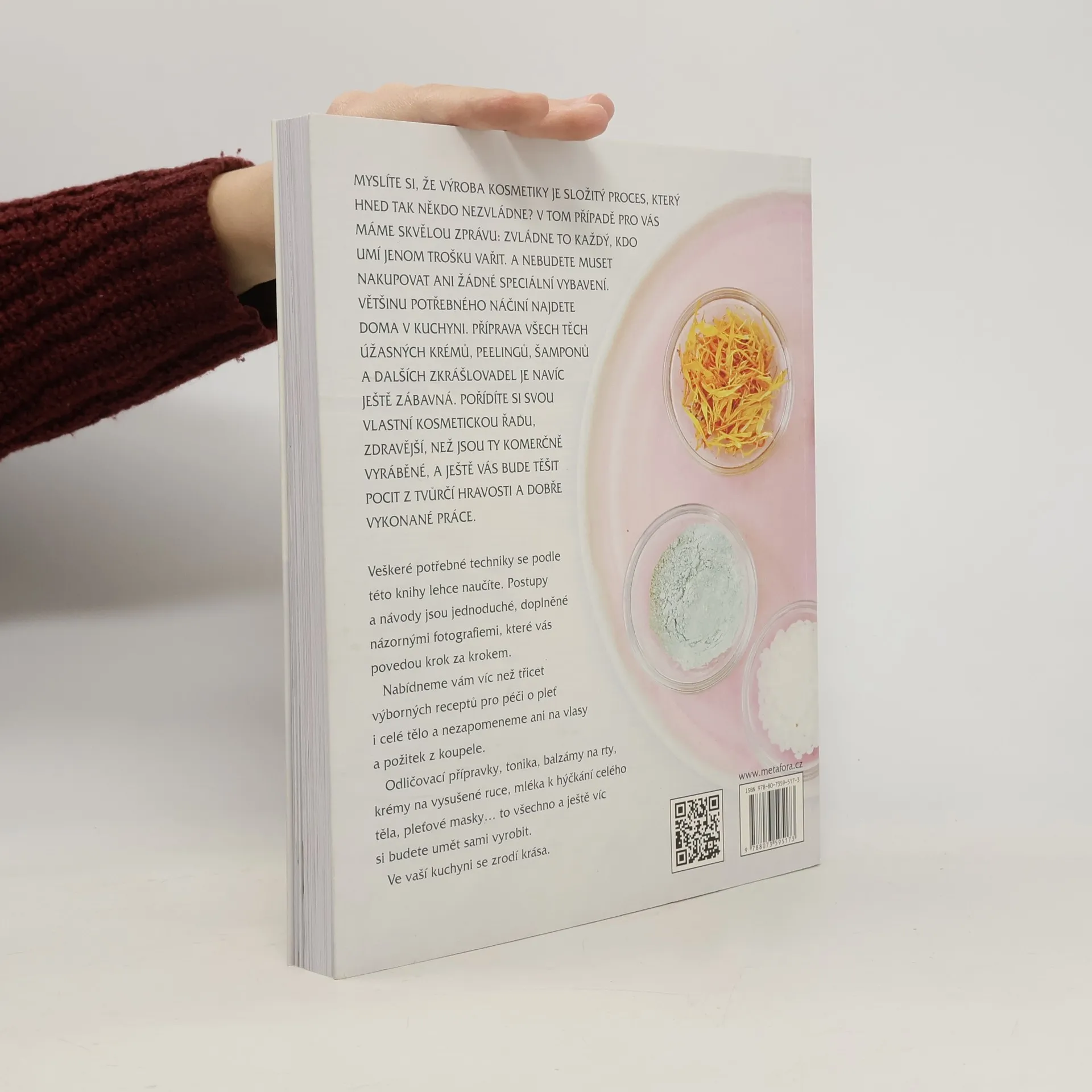 Myslíte si, že výroba kosmetiky je složitý proces, který hned tak někdo nezvládne? Máme pro vás tedy skvělou zprávu: Zvládne to každý, kdo umí jenom trošku vařit. Nemusíte nakupovat žádné speciální vybavení, většinu potřebného najdete doma v kuchyni. S pomocí této knihy si sami vyrobíte vlastní kosmetickou řadu, od peelingů, po krémy, šampony a další kosmetické přípravky, z čistě přírodních materiálů. Navíc zjistíte, že výroba vlastní kosmetiky je především zábavná. V knize naleznete více než třicet výborných receptů na výrobky pro péči o pleť i celé tělo, nezapomeneme ani na vlasy či požitek z koupele. Postupy a návody jsou jednoduché, doplněné názornými fotografiemi, které vás povedou krok za krokem a poradí i s možnými výrobními obtížemi. Odličovací přípravky, tonika, balzámy na rty, krémy na vysušené ruce, mléka k hýčkání celého těla, pleťové masky… to všechno a ještě víc si budete umět vyrobit. Přímo ve vaší kuchyni se zrodí krása.