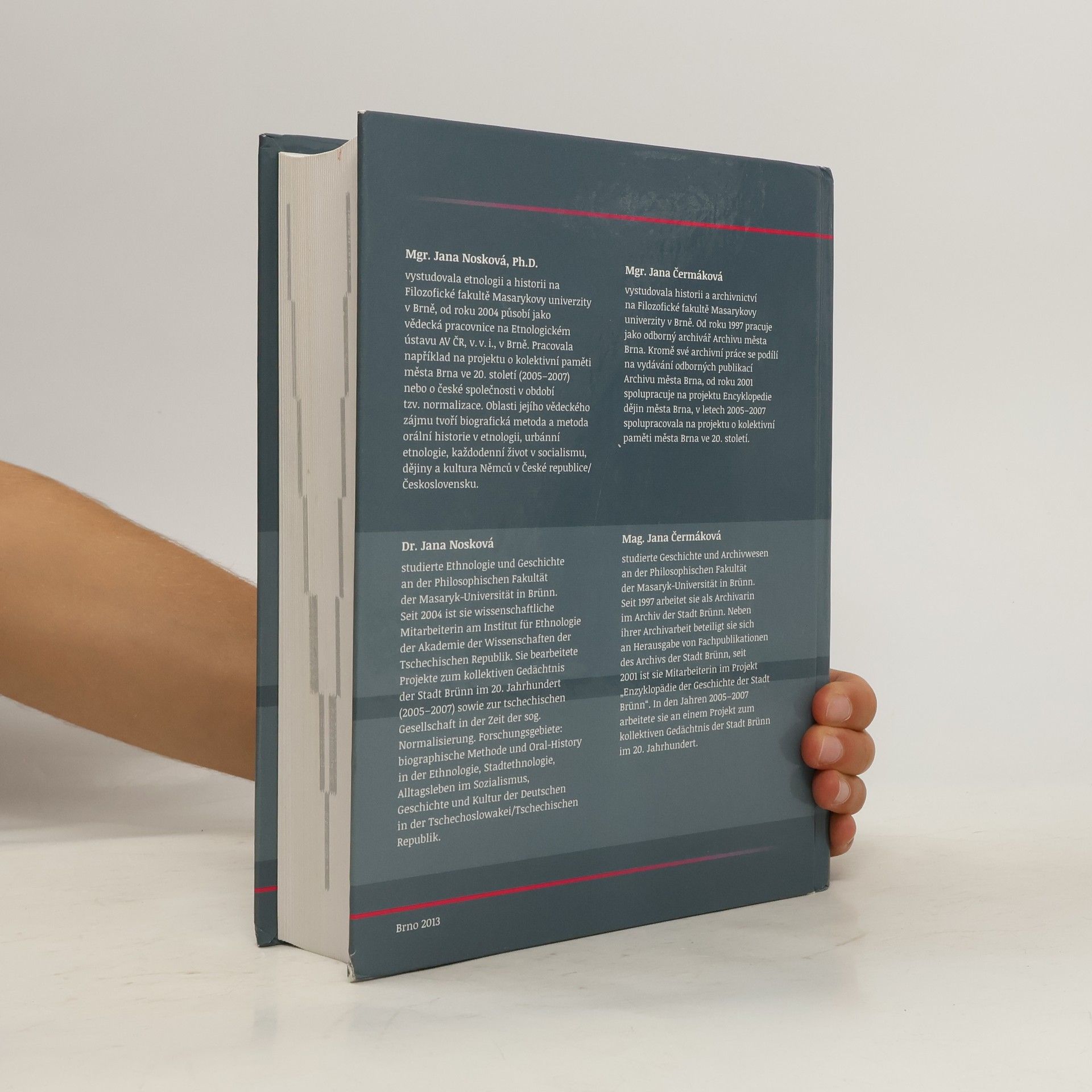 Podtitul: "Vzpomínky německých obyvatel Brna na dětství a mládí ve 20.–40. letech 20. století / Erinnerungen von Brünner Deutschen an ihre Kindheit und Jugend in den 1920er-1940er Jahren". Ve dvojjazyčné (česko-německé) knize je publikováno třinácti upravených interview s obyvateli Brna německého původu. Interview vznikla pomocí metody orální historie a tematicky se zaměřují na každodenní život v multietnickém městě od 20. let 20. století do roku 1945/1946, kdy část narátorek a narátorů musela město Brno opustit. Partnery rozhovorů nahraných v letech 2009–2012 byly osoby narozené v letech 1919–1935, které v současné době žijí v Německu, ve Švýcarsku nebo v Brně. Kniha je uvedena teoretickou studií zabývající se historií Brna, tématem dětství a mládí v etnologické a historické literatuře, metodou orální historie a kontextem vzniku sbírky rozhovorů. Publikace představuje jedinečný pokus o zmapování vzpomínek na každodenní život dětí v československém velkoměstě v meziválečném a válečném období. Součástí knihy jsou životopisné medailony respondentů, glosář, uličník, geografický a jmenný rejstřík a černobílé fotografie.