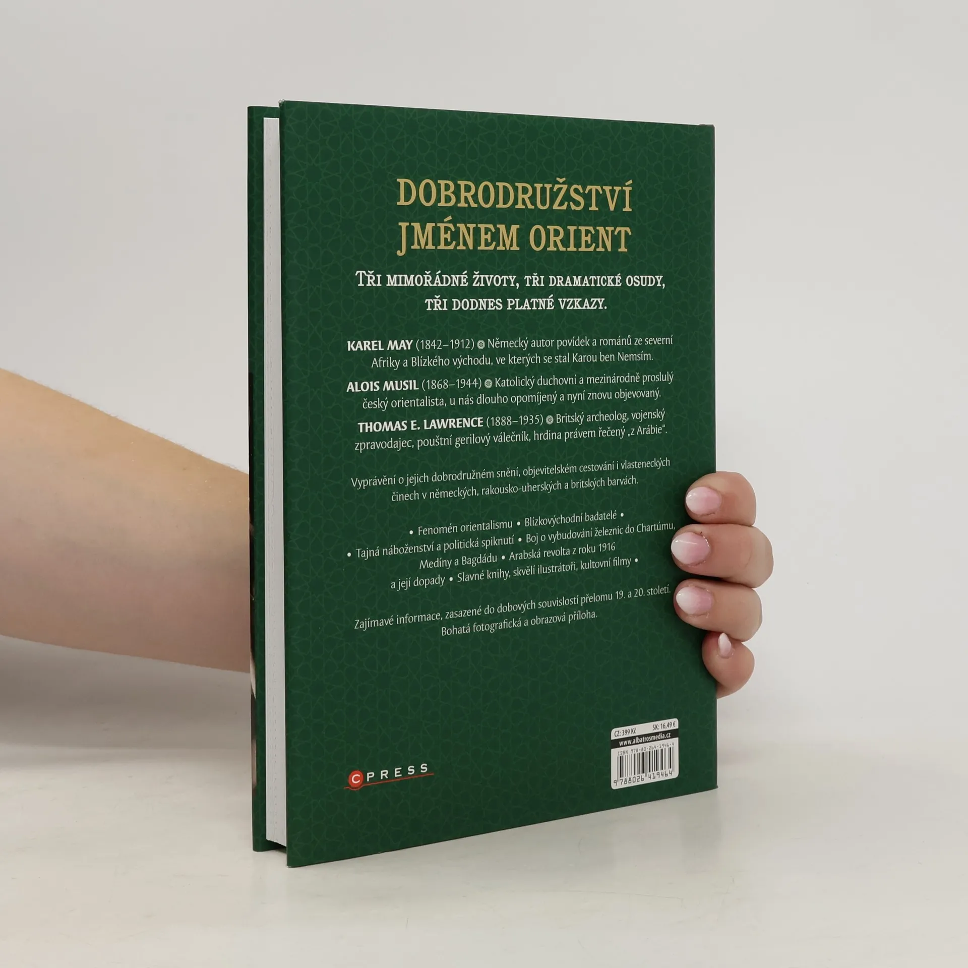 Vítejte u společné biografie tří zajímavých postav éry „belle époque“, krásných časů, které skončily krvavě. Hledejte spojitosti mezi událostmi starými více než sto let a stále výbušnou situací v onom nádherném i nešťastném kusu planety. Vraťte se touto četbou alespoň na chvíli do jen zdánlivě romantických dob odvážných mužů a jejich napínavých příhod. KAREL MAY (1842–1912) • Německý autor povídek a románů ze severní Afriky a Blízkého východu, ve kterých se stal Karou ben Nemsím. ALOIS MUSIL (1868–1944) • Katolický duchovní a mezinárodně proslulý český orientalista, u nás dlouho opomíjený a nyní znovu objevovaný. THOMAS E. LAWRENCE (1888–1935) • Britský archeolog, vojenský zpravodajec, pouštní gerilový válečník, hrdina právem řečený „z Arábie“. Vyprávění o jejich dobrodružném snění, objevitelském cestování i vlasteneckých činech v německých, rakousko-uherských a britských barvách. • Fenomén orientalismu • Blízkovýchodní badatelé • • Tajná náboženství a politická spiknutí • Boj o vybudování železnic do Chartúmu, Medíny a Bagdádu • Arabská revolta z roku 1916 a její dopady • Slavné knihy, skvělí ilustrátoři, kultovní filmy • Zajímavé informace, zasazené do dobových souvislostí přelomu 19. a 20. století. Bohatá fotografická a obrazová příloha.