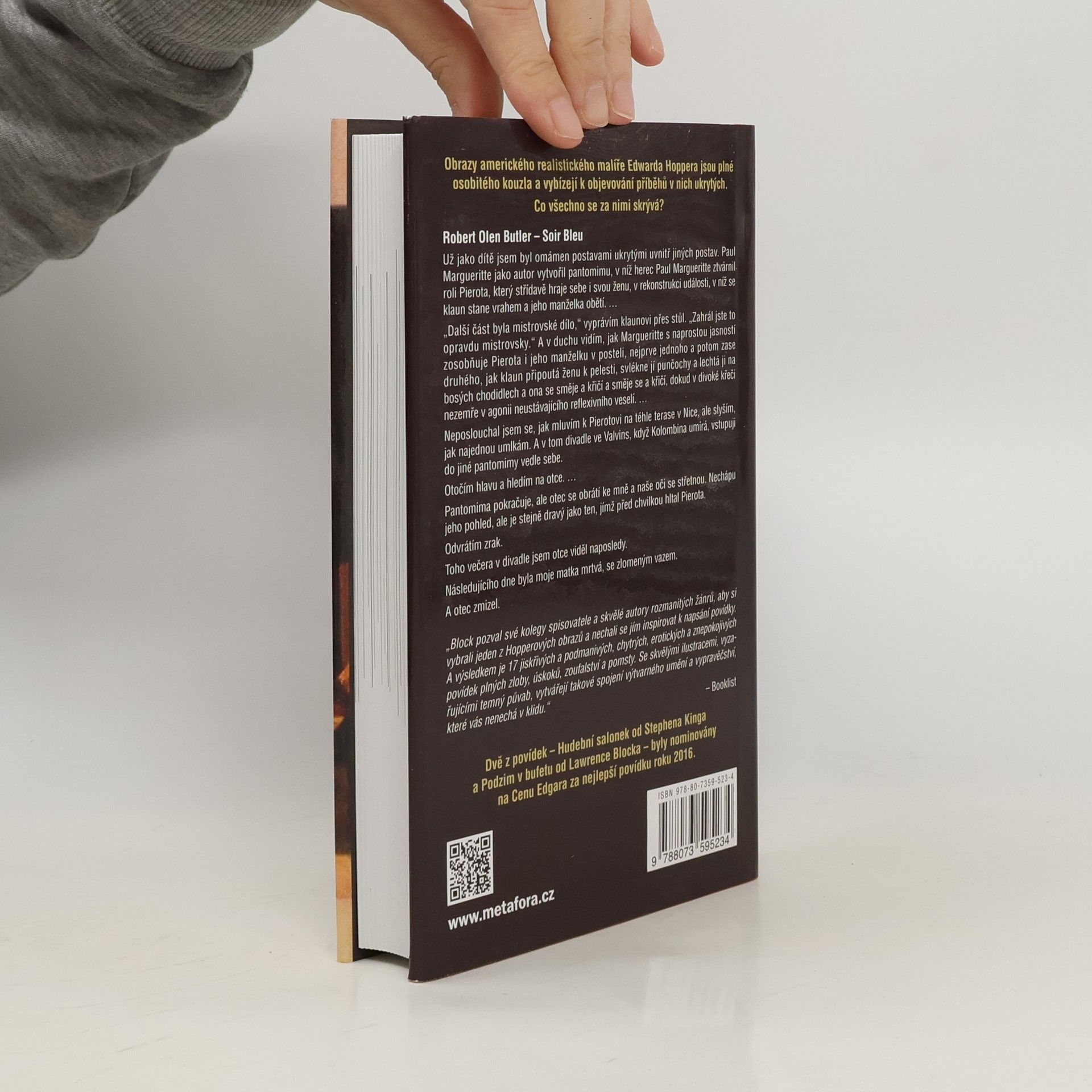 Patnáct světoznámých prozaiků se nechalo inspirovat dílem Edwarda Hoppera a na jeho motivy napsali každý svůj originální příběh. Další připojila Gail Levinová, kunsthistorička a známá odbornice na Hopperovo dílo. Poslední přidal Lawrence Block, autor více než padesáti bestsellerů, který rovněž povídky sestavil do této antologie. Každá ze sedmnácti povídek je uvedena barevnou reprodukcí obrazu, z něhož spisovatel čerpal. Vyprávění se ujali mistři pera a autoři bestsellerů z různých žánrů. Nechybějí ani takoví velikáni, jakými jsou Stephen King, Lee Child či Joyce Carol Oatesová. K nim se přidala i řada dalších, například Michael Connelly, Megan Abbottová, Justin Scott (nazývaný „Dickem Francisem jachtingu“) či mistr detektivního thrilleru Jeffery Deaver. Můžete se těšit na širokou škálu žánrů, od hororu, přes detektivku až po povídky tajemné, fantastické či romantické. Obrazy amerického realistického malíře Edwarda Hoppera jsou plné osobitého kouzla a nejen milovníky umění vybízejí k objevování příběhů v nich ukrytých. Díváme se na ně a jsme vtahováni do jejich světa. Co všechno se za nimi skrývá?