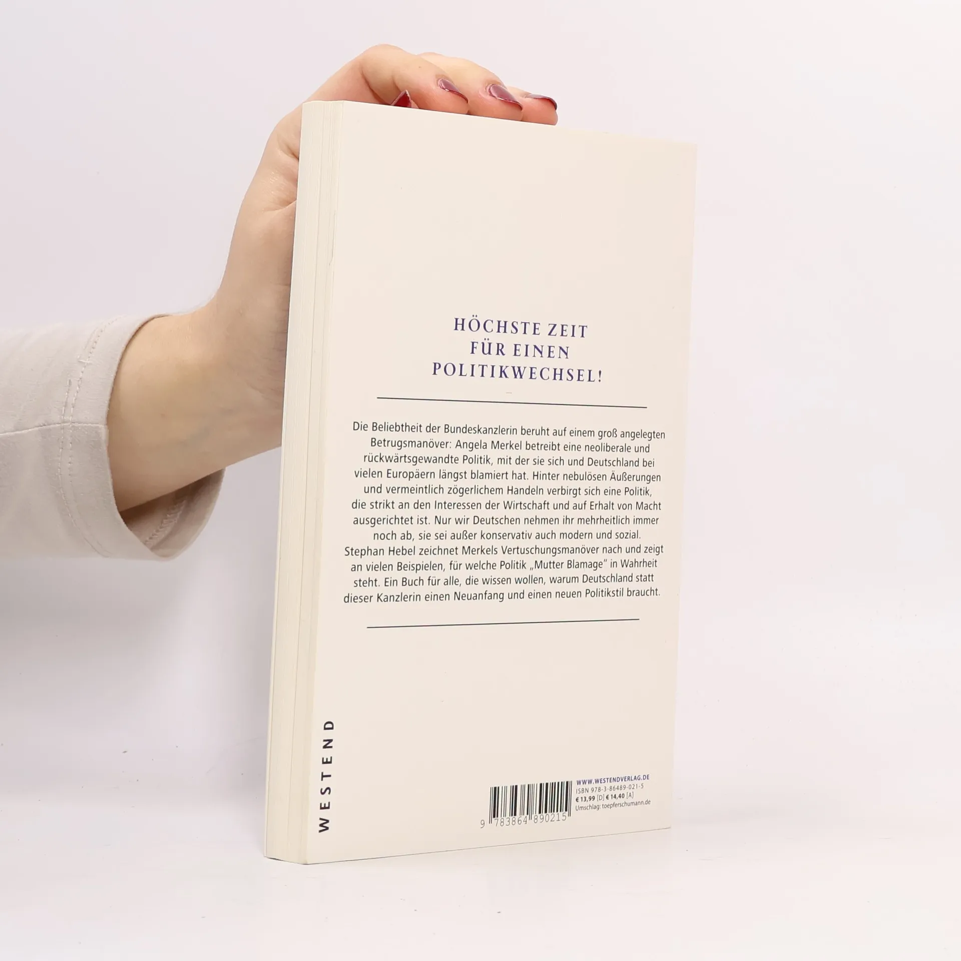 Deutschlands beliebteste Politikerin verdankt ihren Erfolg einem permanenten Betrugsmanöver. Ihre politische Agenda hat keinen Namen und kein Gesicht, ganz Deutschland glaubt deshalb, es gäbe sie nicht. Das ist ein Irrglaube ist: Es gibt eine Agenda, die aber in erster Linie auf Erwerb und Erhalt von Macht ausgerichtet ist. Inhalte werden untergeordnet. Merkel hinterlässt uns – sollte sie endlich abgewählt werden – ein Land im Reformstau. Ein Land, das sich auf Kosten anderer in kleinkariert nationaler Interessenpolitik ergeht und sich damit letztlich selbst schadet. Ein Land, das wichtig tut, aber ständig an Gewicht verliert. Ein Land, in dem die Ungerechtigkeit wächst und Millionen Bürger in Armut leben, auch wenn sie Arbeit haben. Ein Land, in dem die Politik sich selbst zur Erfüllungsgehilfin ökonomischer Interessen degradiert. Höchste Zeit für einen Politikwechsel!