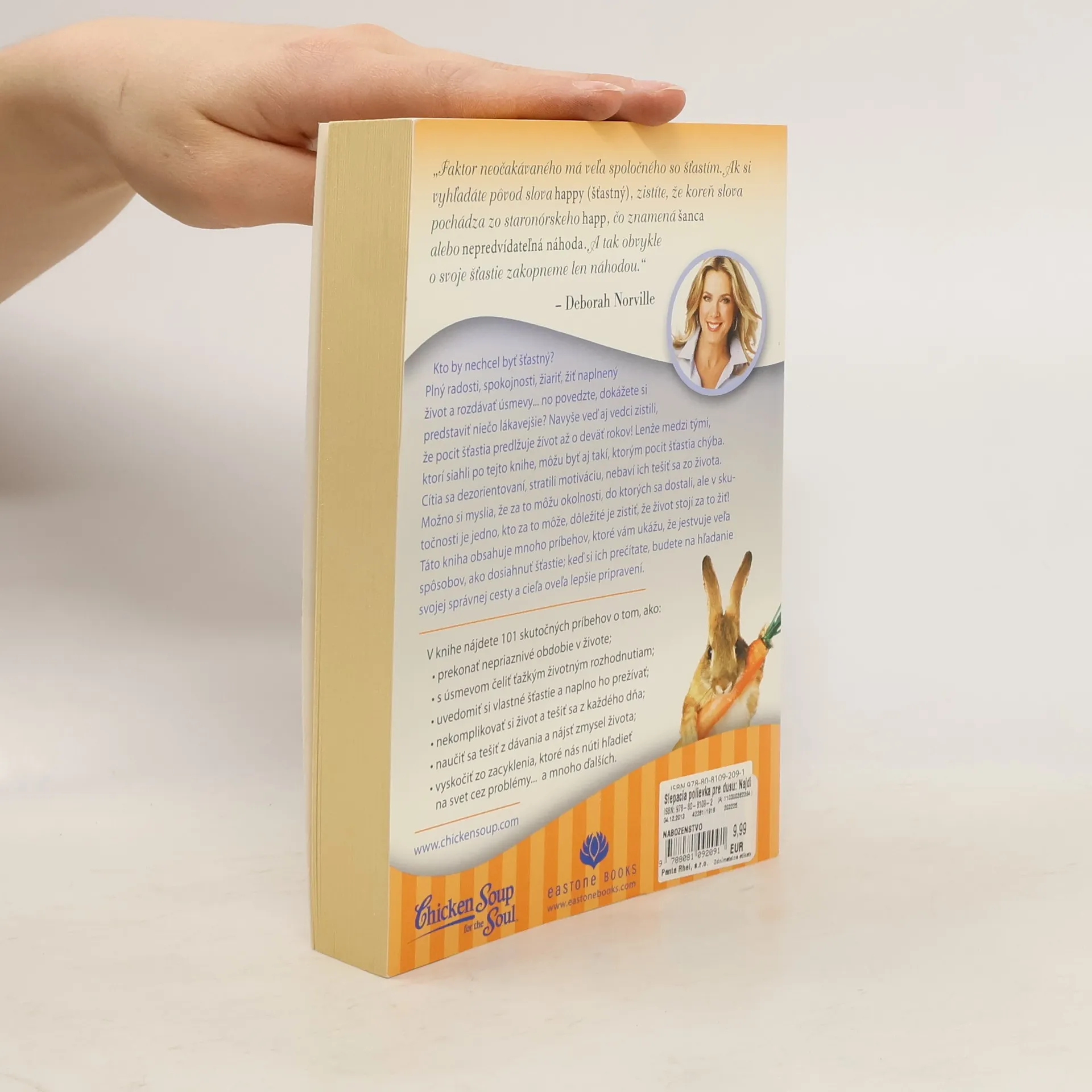 Kto by nechcel byť šťastný? Plný radosti, spokojnosti, žiariť, žiť naplnený život a rozdávať úsmevy... no povedzte, dokážete si predstaviť niečo lákavejšie? Navyše veď aj vedci zistili, že pocit šťastia predlžuje život až o deväť rokov! Lenže medzi tými, ktorí siahli po tejto knihe, môžu byť aj takí, ktorým pocit šťastia chýba. Cítia sa dezorientovaní, stratili motiváciu, nebaví ich tešiť sa zo života. Možno si myslia, že za to môžu okolnosti, do ktorých sa dostali, ale v skutočnosti je jedno, kto za to môže, dôležité je zistiť, že život stojí za to žiť! Táto kniha obsahuje mnoho príbehov, ktoré vám ukážu, že jestvuje veľa spôsobov, ako dosiahnuť šťastie; keď si ich prečítate, budete
