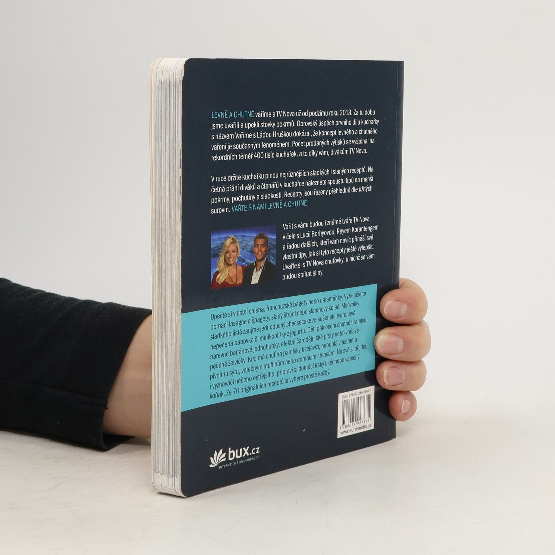 Vařit levně a chutně, to je současný trend všech fanoušků oblíbené rubriky televize Nova, ve které se připravují unikátní recepty za pár korun. Jednoduchý postup, časová nenáročnost a chutný výsledek – to sice zní jako nedostižný ideál, ale s nápaditými pokrmy z této kuchařky to půjde samo! Upečte si vlastní chleba, francouzské bagety nebo dalamánky. Vyzkoušejte domácí lasagne a špagety, slaný štrúdl nebo slaninový koláč. Milovníky sladkého jistě zaujme jednoduchý cheesecake ze sušenek, tvarohová nepečená bábovka či minikoblížky z jogurtu. Děti pak ocení chutné tiramisu, barevné banánové jednohubky, efektní čarodějnické prsty nebo voňavé pečené želvičky. Kdo má chuť na pamlsky k televizi, neodolá vlastnímu pivnímu sýru, vaječným muffinům nebo domácím chipsům. Na své si přijdou i vyznavači něčeho ostřejšího, připraví si domácí irský likér nebo vaječný koňak. Ze 70 originálních receptů si vybere prostě každý. Vařit s vámi budou i známé tváře TV Nova v čele s Lucií Borhyovou, Reyem Korantengem a řadou dalších, kteří vám navíc přináší své vlastní tipy, jak si tyto recepty ještě vylepšit. Uvařte si s TV Nova chuťovky, u nichž se vám budou sbíhat sliny.