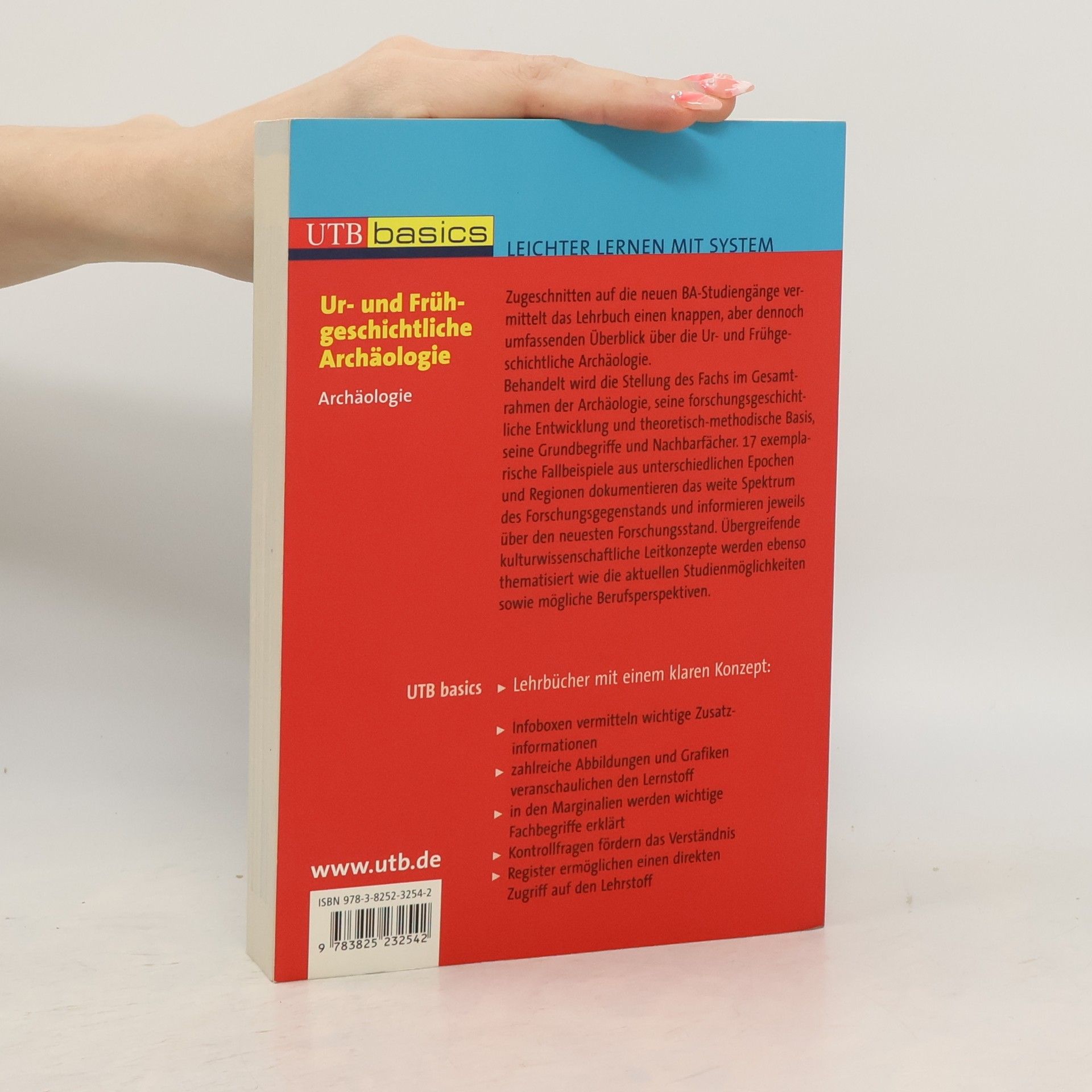 Spektakuläre Grabungsfunde und öffentlichkeitswirksame Ausstellungen haben der Archäologie große Popularität verschafft, aber den Studienanfängern in den archäologischen Fächern fehlt oft das nötige Grundlagenwissen. Das vorliegende Lehrbuch informiert in verständlicher Form über Themen, Methoden und aktuelle Forschungsgebiete der Ur- und Frühgeschichtlichen Archäologie – die perfekte Begleitlektüre zu den Einführungsmodulen im Bachelor-Studium! Behandelt wird die Stellung des Fachs im Gesamtrahmen der Archäologie, seine forschungsgeschichtliche Entwicklung und theoretisch-methodische Basis, seine Grundbegriffe und Nachbarfächer. 18 exemplarische Fallbeispiele aus unterschiedlichen Epochen und Regionen dokumentieren das weite Spektrum des Forschungsgegenstands und informieren jeweils über den neuesten Forschungsstand. Übergreifende kulturwissenschaftliche Leitkonzepte werden ebenso thematisiert wie die aktuellen Studienmöglichkeiten sowie mögliche Berufsperspektiven.