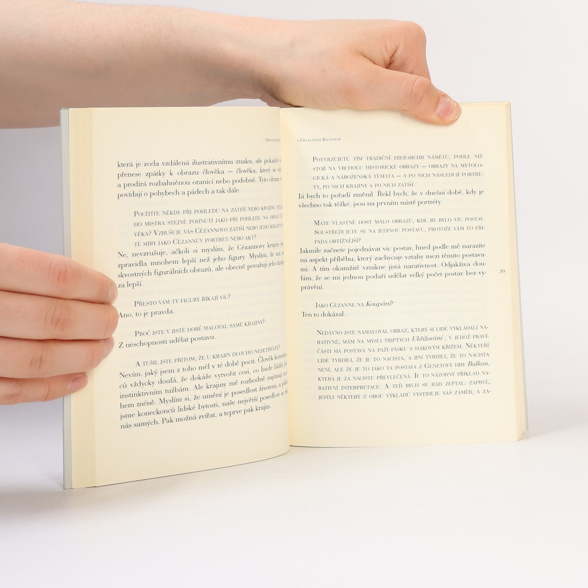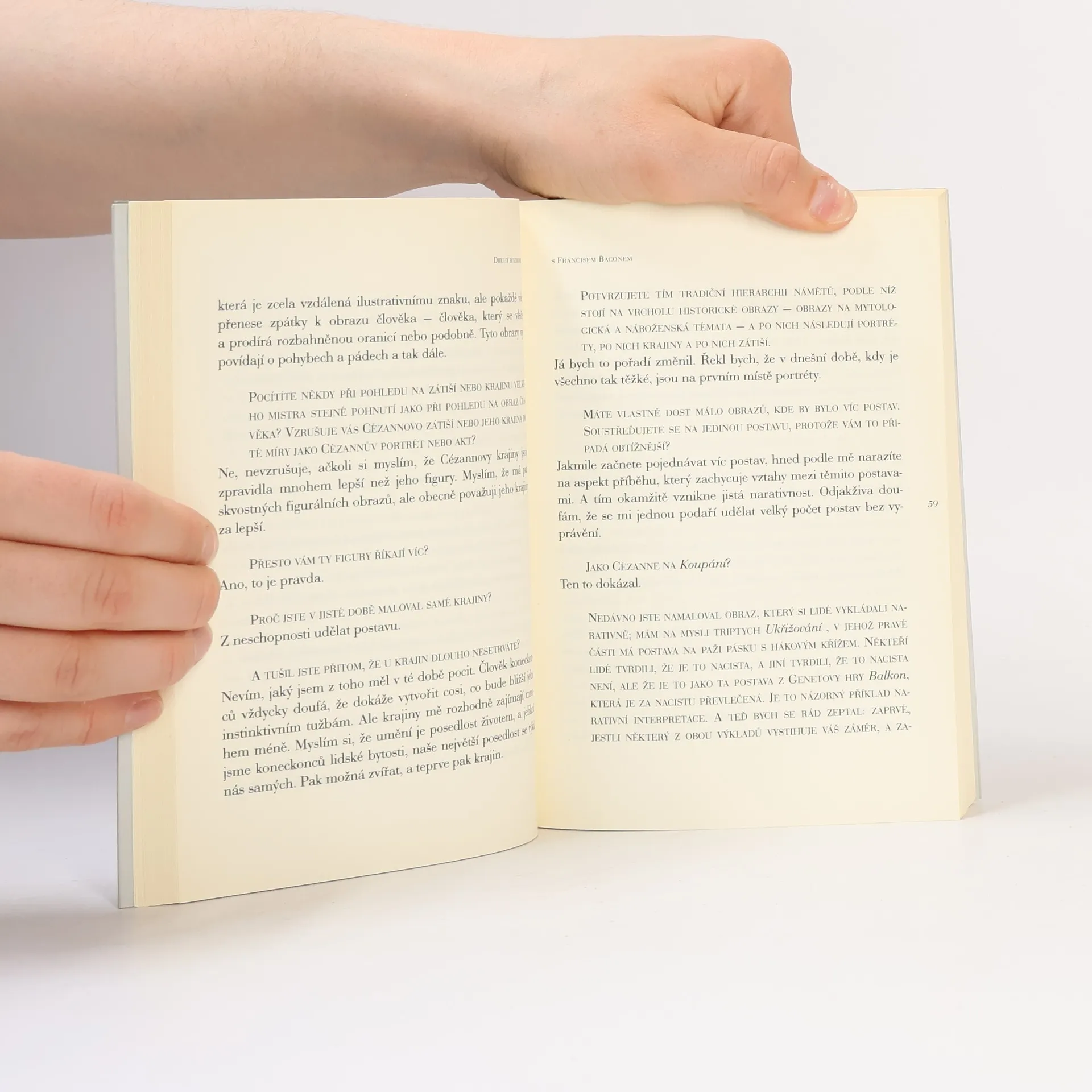 Kniha rozhovorů s Francisem Baconem. Francis Bacon (1909–1992) zvolil v třiceti pěti letech, uprostřed poválečných vln op-artu, monochronní malby a konceptuálního umění, návrat k tradiční technice, k postavám a dějům. Vytvořil monumentální dílo, které je, v druhé polovině 20. století, zcela ojedinělé. Edice De arte přináší překlad Baconových rozhovorů se známým anglickým kritikem Davidem Sylvestrem. Rozhovory vznikaly postupně v rozmezí let 1962–1979. Nacházíme zde reakce na surrealismus a kubismus, stejně jako na Eliota či Valéryho, Michelangela či Duchampa, Rembrandta či Muncha. Bacon – piják, hráč a divoch – velmi přesně a dopodrobna analyzuje pozadí umělecké tvorby. Je to dokonalý klíč k pochopení jedné z největších postav tohoto století. Graham Greene napsal, že „je to vzrušující dokument, srovnatelný s Delacroixovým deníkem“.