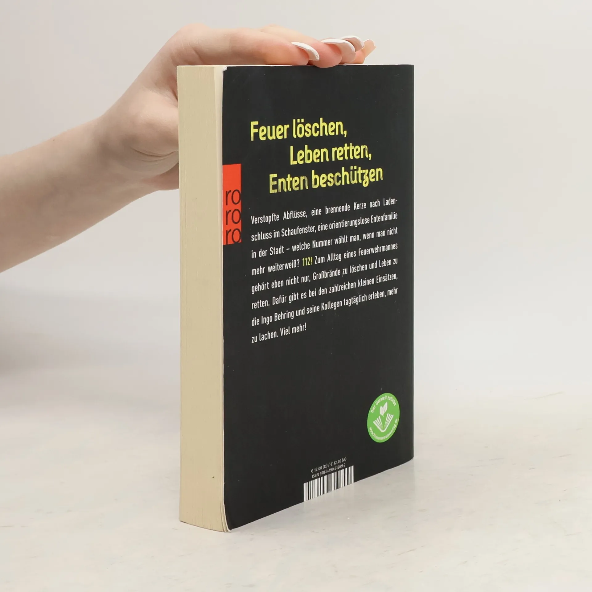 Feuer löschen, Leben retten, Enten beschützen Verstopfte Abflüsse, eine brennende Kerze nach Ladenschluss im Schaufenster, eine orientierungslose Entenfamilie in der Stadt – welche Nummer wählt man, wenn man nicht mehr weiterweiß? 112! Zum Alltag eines Feuerwehrmannes gehört eben nicht nur, Großbrände zu löschen und Leben zu retten. Dafür gibt es bei den zahlreichen kleinen Einsätzen, die Ingo Behring und seine Kollegen tagtäglich erleben, mehr zu lachen. Viel mehr!