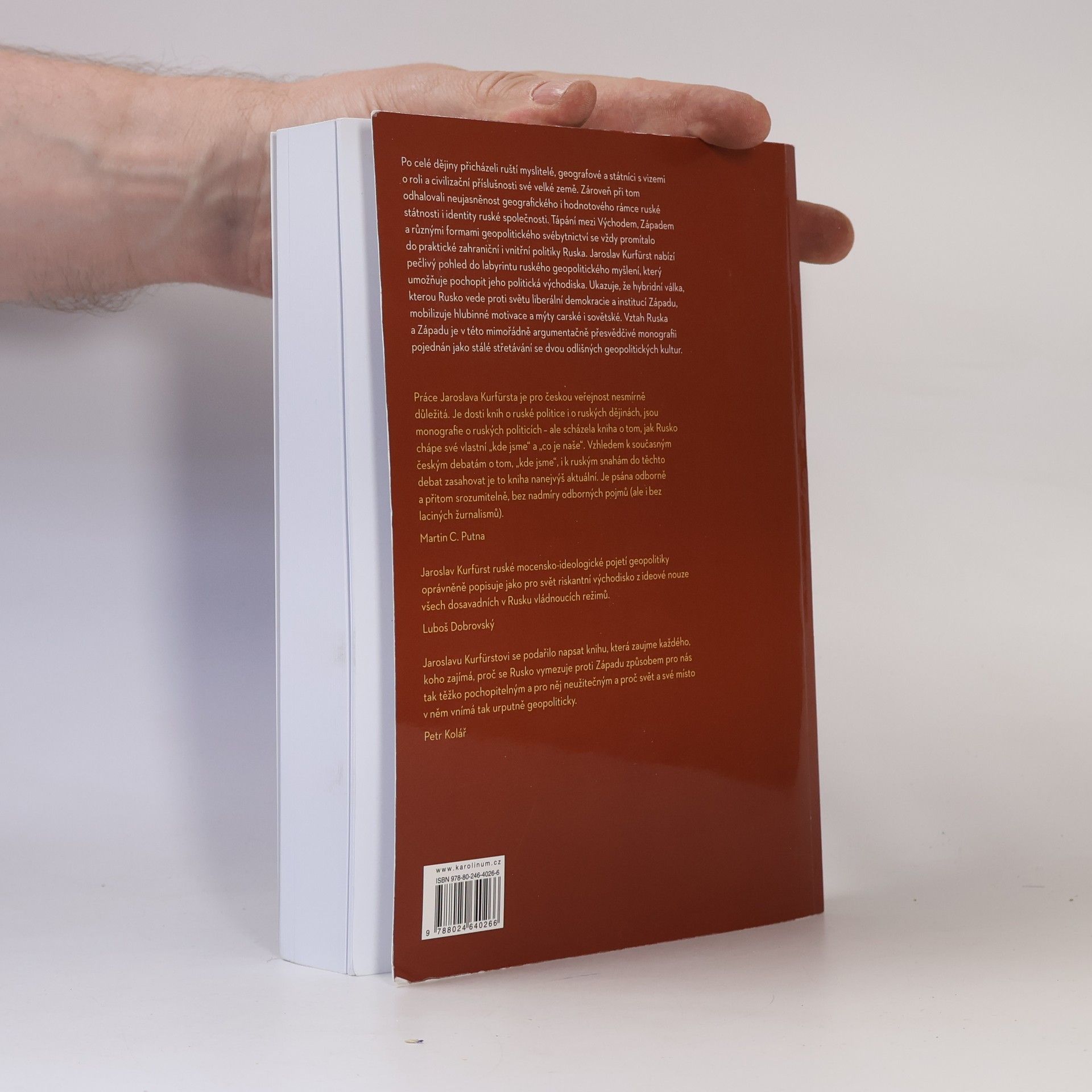 Po celé dějiny přicházeli ruští myslitelé, geografové a státníci s vizemi o roli a civilizační příslušnosti své velké země. Zároveň při tom odhalovali neujasněnost geografického i hodnotového rámce ruské státnosti i identity ruské společnosti. Tápání mezi Východem, Západem a různými formami geopolitického svébytnictví se vždy promítalo do praktické zahraniční i vnitřní politiky Ruska. Jaroslav Kurfürst nabízí pečlivý pohled do labyrintu ruského geopolitického myšlení, který umožňuje pochopit jeho politická východiska. Ukazuje, že hybridní válka, kterou Rusko vede proti světu liberální demokracie a institucí Západu, mobilizuje hlubinné motivace a mýty carské i sovětské. Vztah Ruska a Západu je v této mimořádně argumentačně přesvědčivé monografii pojednán jako stálé střetávání se dvou odlišných geopolitických kultur.