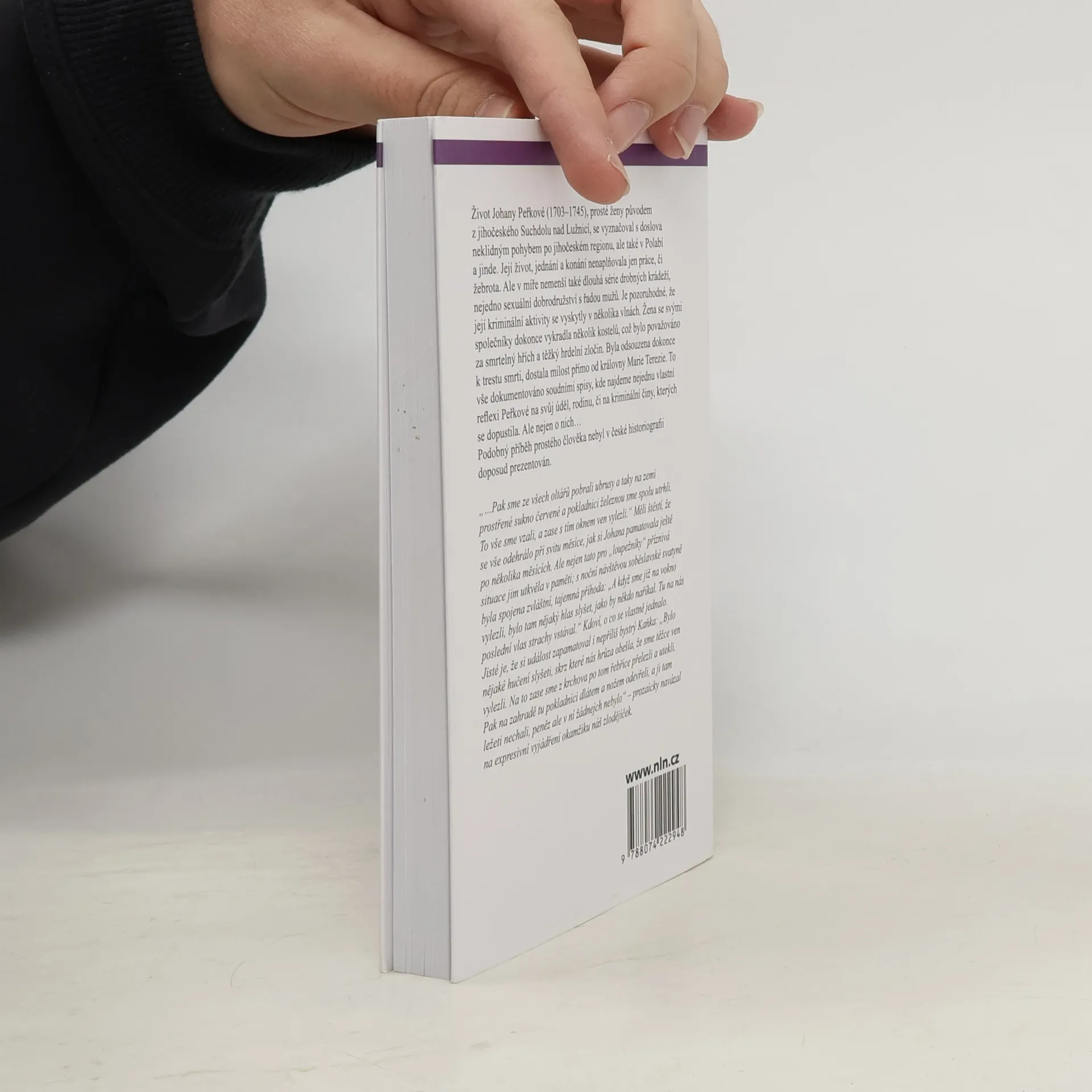 Život Johany Peřkové (1703–1745), prosté ženy původem z jihočeského Suchdolu nad Lužnicí, se vyznačoval s doslova neklidným pohybem po jihočeském regionu, ale také v Polabí a jinde. Její život, jednání a konání nenaplňovala jen práce, či žebrota. Ale v míře nemenší také dlouhá série drobných krádeží, nejedno sexuální dobrodružství s řadou mužů. Je pozoruhodné, že její kriminální aktivity se vyskytly v několika vlnách. Žena se svými společníky dokonce vykradla několik kostelů, což bylo považováno za smrtelný hřích a těžký hrdelní zločin. Byla odsouzena dokonce k trestu smrti, dostala milost přímo od královny Marie Terezie. To vše dokumentováno soudními spisy, kde najdeme nejednu vlastní reflexi Peřkové na svůj úděl, rodinu, či na kriminální činy, kterých se dopustila. Ale nejen o nich... Podobný příběh prostého člověka nebyl v české historiografii doposud prezentován.