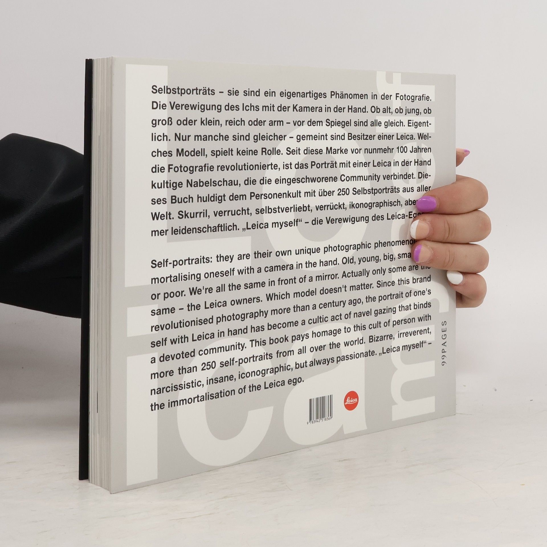 Selbstporträts – sie sind ein eigenartiges Phänomen in der Fotografie. Die Verewigung des Ichs mit der Kamera in der Hand. Ob alt, ob jung, ob groß oder klein, reich oder arm – vor dem Spiegel sind alle gleich. Eigentlich. Nur manche sind gleicher – gemeint sind Besitzer einer Leica. Welches Modell spielt keine Rolle. Seit diese Marke vor nunmehr 100 Jahren die Fotografie revolutionierte, ist das Porträt mit einer Leica in der Hand kultige Nabelschau, die die eingeschworene Community verbindet. Dieses Buch huldigt dem Personenkult mit über 250 Selbstporträts aus aller Welt. Skurril, verrucht, selbstverliebt, verrückt, ikonographisch, aber immer leidenschaftlich. Leica Myself – die Verewigung des LeicaEgos