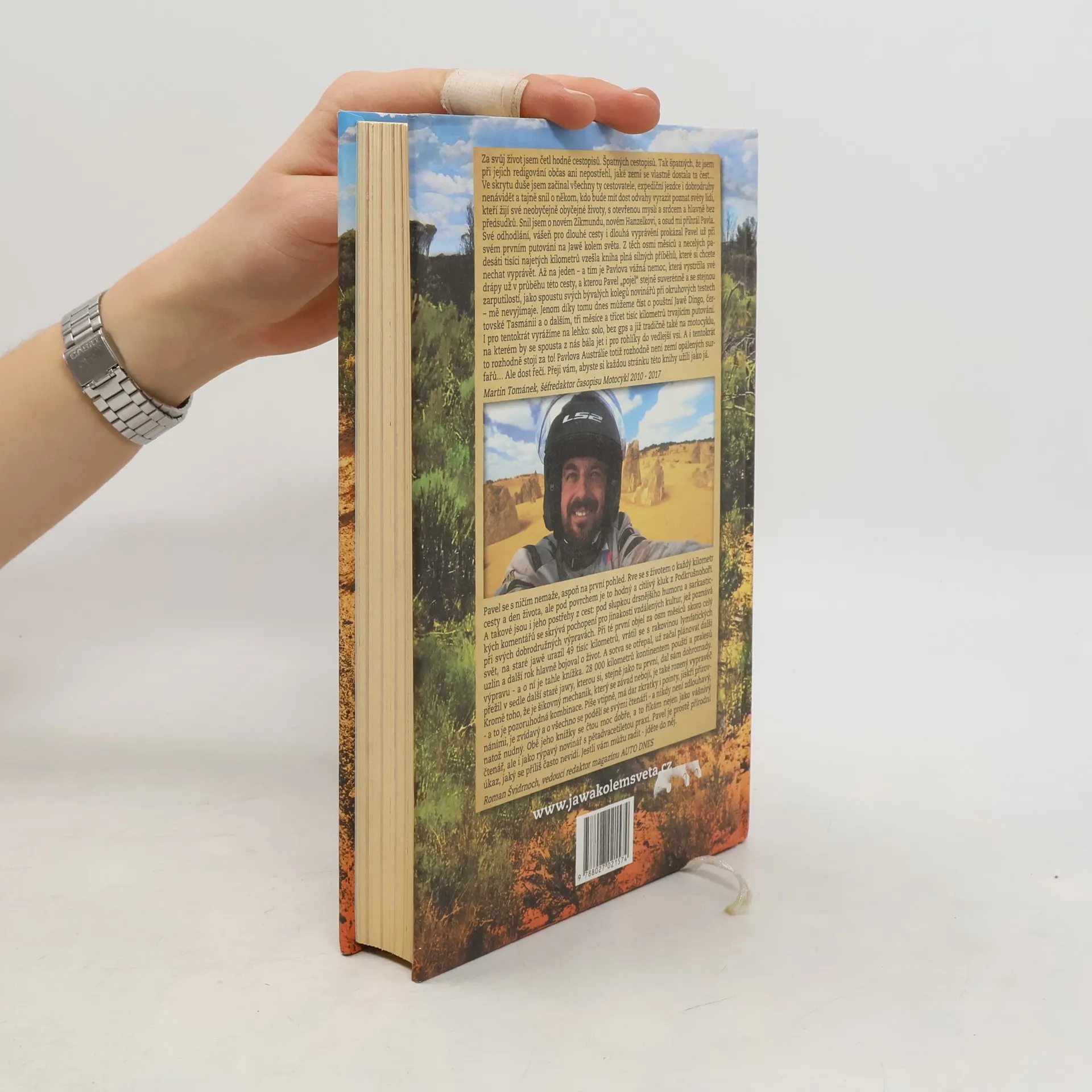 Pavel Suchý (1974) se v letech 2013/2014 objel se starou Jawou 350 kolem světa a v roce 2016 se vydal na další dobrodružství, tentokrát do Van Diemenovy země. Opět cestoval sám, pouze s papírovou mapou. Z téměř 30 000 km australskou pouští a tasmánskými pralesy vytvořil 274 stran poutavého vyprávění, které obohatil o vedlejší příběhy, postřehy a kapitolu o přípravách svého motocyklu. Kniha obsahuje 127 barevných fotografií, 8 černobílých technických obrázků a 9 podrobných map australských států a Tasmánie. Autor s typickou nadsázkou a ironií popisuje nebezpečí australského outbacku, opuštěné cesty a život současných Austrálců, přičemž hledá stopy svého předchůdce Potužníka, který Austrálii projel v roce 1974. Jako motocyklový novinář na volné noze, s dlouholetou praxí jako technický redaktor a šéfredaktor renomovaných časopisů, najezdil 600 000 kilometrů a navštívil všechny obydlené kontinenty. Je prvním Čechem, který na motocyklu objel svět. Po boji s rakovinou lymfatických uzlin se k poslední cestě vyjadřuje: „Dostal jsem čas navíc, tak je přece dobrý ho pořádně využít!“