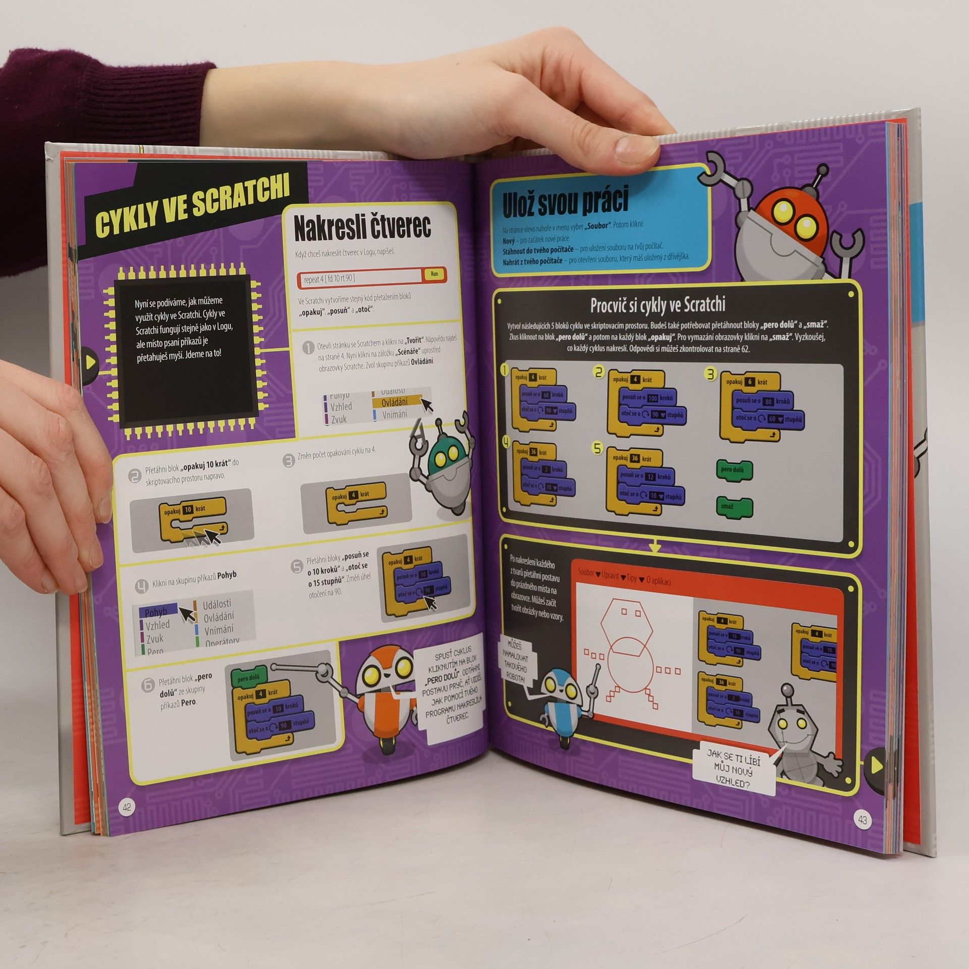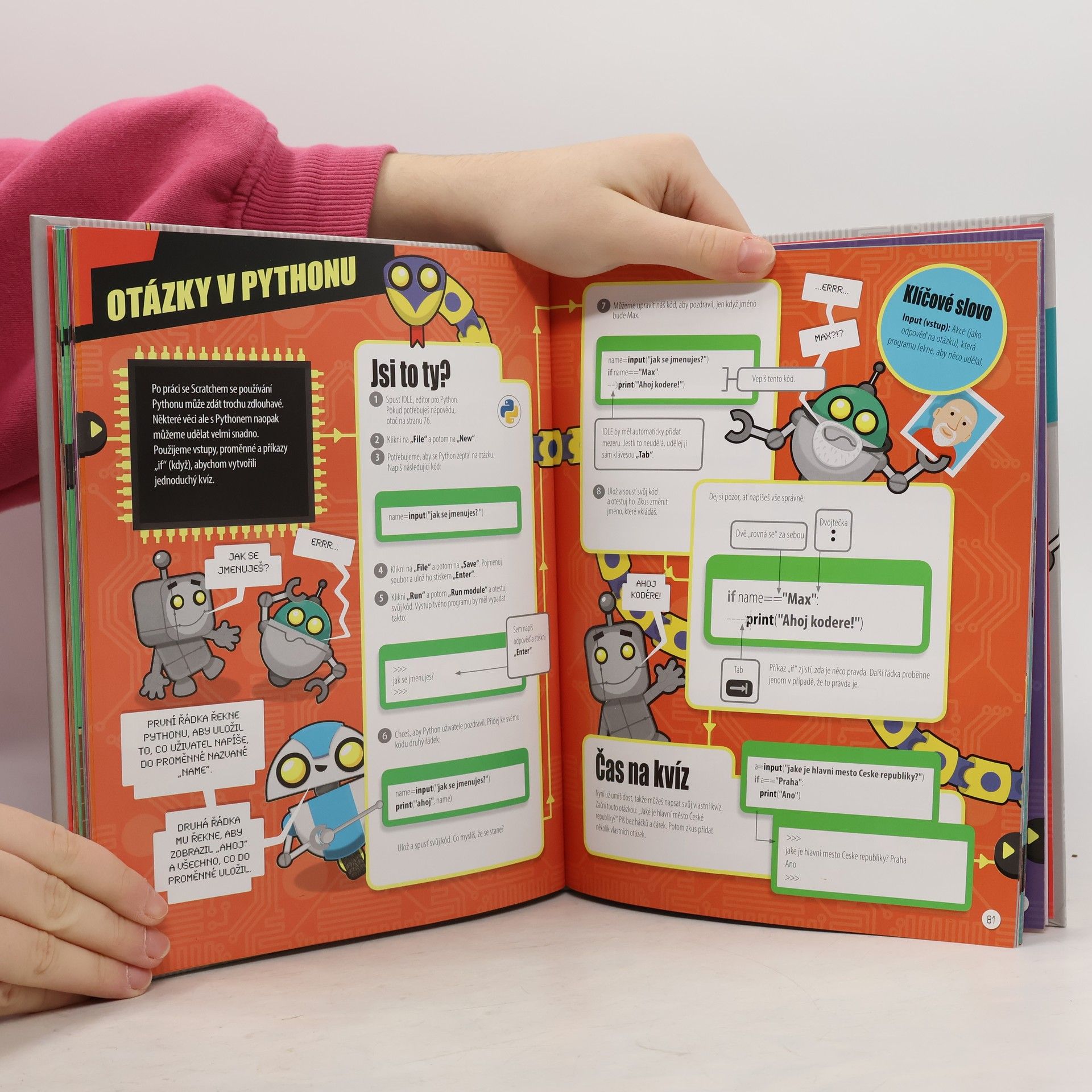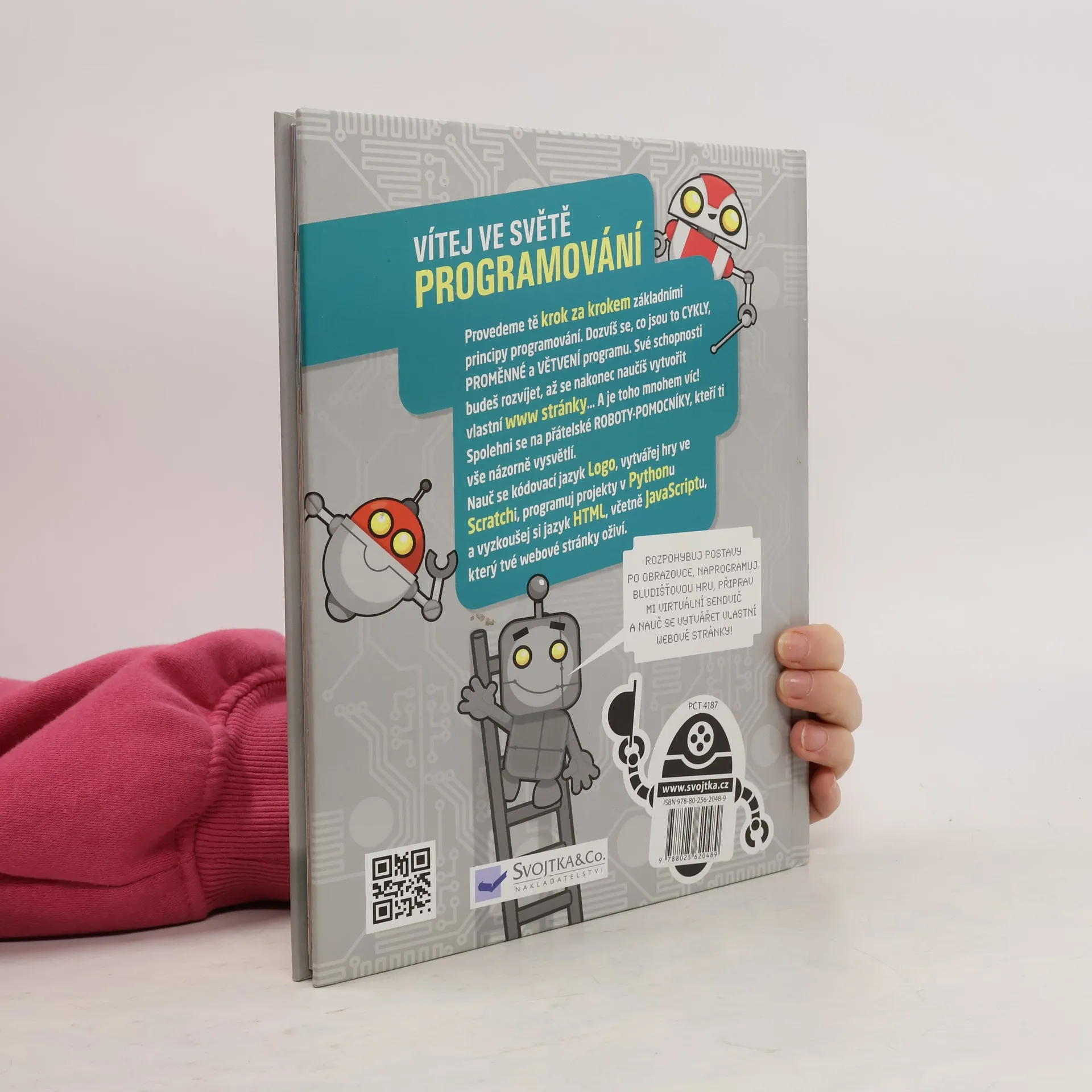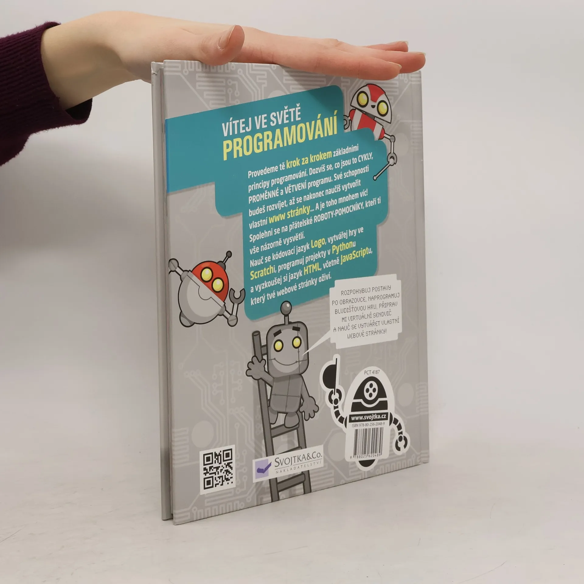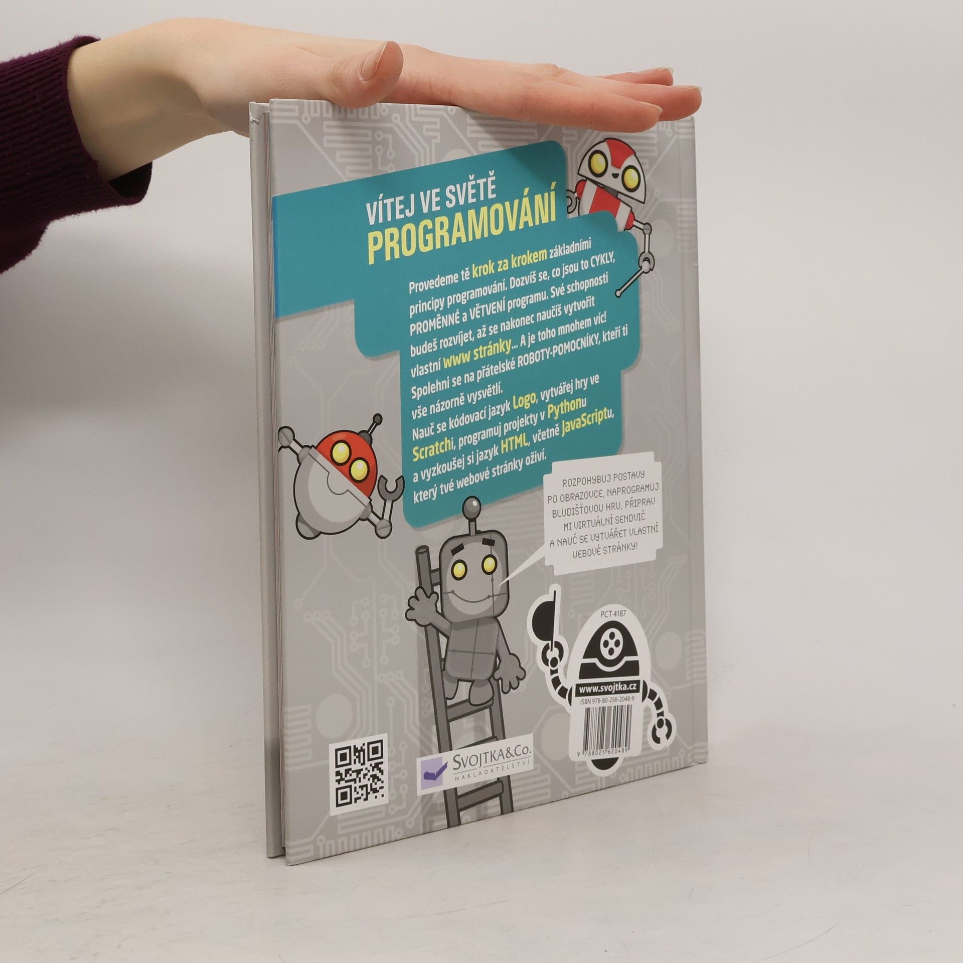 Rozpohybuj postavy po obrazovce, naprogramuj bludišťovou hru, připrav virtuální sendvič a nauč se vytvářet webové stránky. Zkrátka, vítej ve světě programování! Vítej ve světě programů, kódů a programování. Chceš se naučit programovat? Tato knížka tě provede krok za krokem základními principy programování. Dozvíš se, co jsou to cykly, proměnné a větvení programů. Své programátorské schopnosti budeš rozvíjet, až se nakonec naučíš vytvořit vlastní www stránky… A je toho mnohem víc! Spolehni se na přátelské roboty-pomocníky, kteří ti vše názorně vysvětlí. Nauč se kódovací jazyk Logo, vytvářej hry ve Scratchi, programuj projekty v Pythonu a vyzkoušej si jazyk HTML, včetně JavaScriptu, který tvé webové stránky oživí.