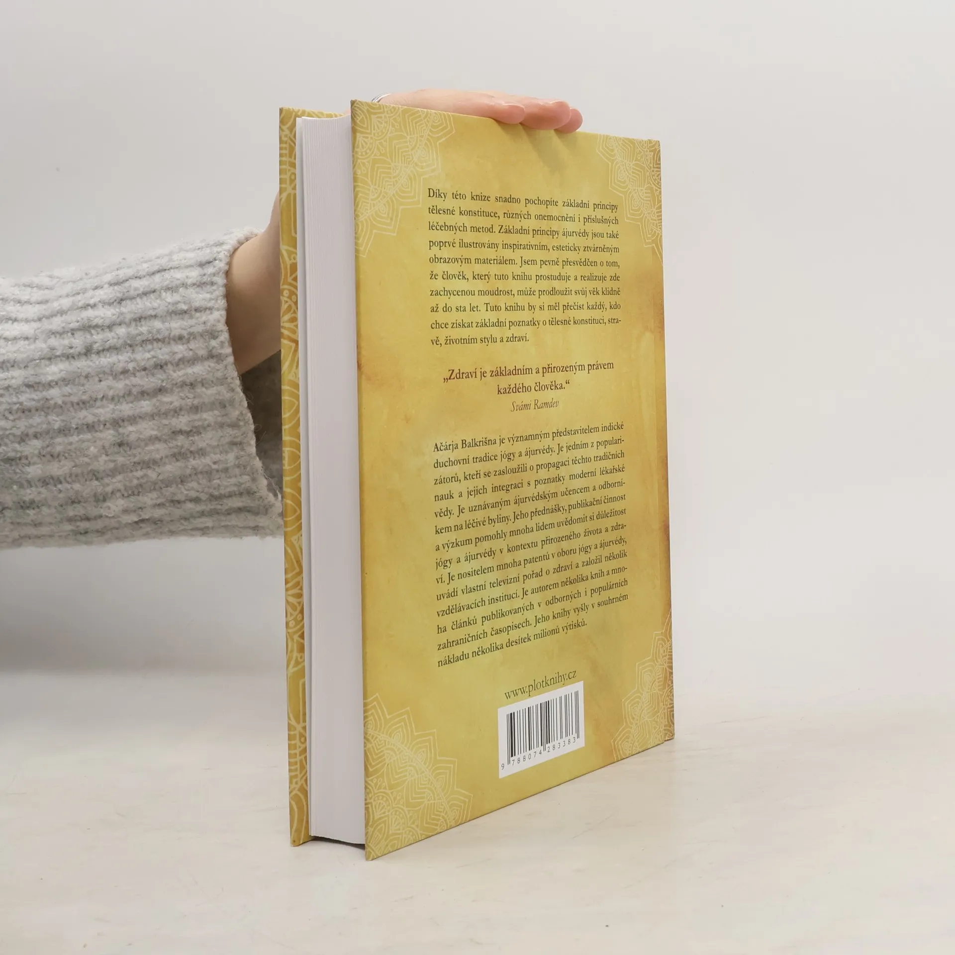 Tato kniha vám umožní snadno pochopit základní principy tělesné konstituce, onemocnění a léčebných metod. Principy ájurvédy jsou zde poprvé ilustrativně ztvárněny estetickým obrazovým materiálem. Věřím, že ten, kdo tuto knihu prostuduje a aplikuje její moudrost, může prodloužit svůj věk až do sta let. Je určena každému, kdo chce získat znalosti o tělesné konstituci, stravě, životním stylu a zdraví. „Arogja (zdraví) je základním a přirozeným právem každého člověka.“ Svámi Ramdev Ačárja Balkrišna, významný představitel indické tradice jógy a ájurvédy, se zasloužil o propagaci těchto nauk a jejich integraci s moderní medicínou. Je uznávaným ájurvédským učencem a odborníkem na léčivé byliny. Jeho přednášky a publikace pomohly mnoha lidem uvědomit si důležitost jógy a ájurvédy pro přirozený život a zdraví. Je autorem mnoha patentů a knih, včetně renomované práce o ájurvédské léčbě „Aushad Dashan“, která se prodala v pěti milionech výtisků. Je zakladatelem vzdělávacích institucí, jako je Patanjali University a Patanjali Ayurveda College, a jeho televizní show vzbudila zájem o bylinnou léčbu a ájurvédu.