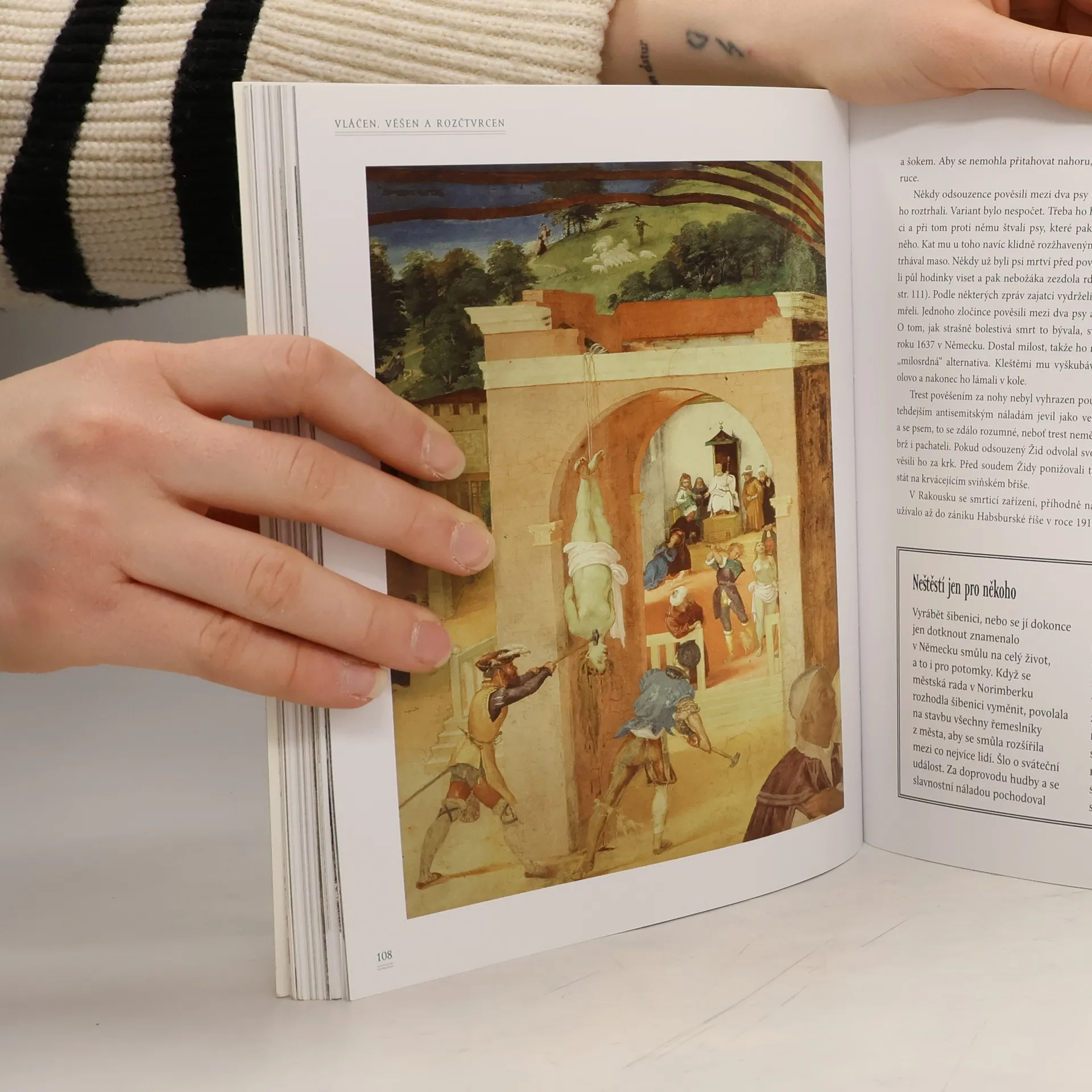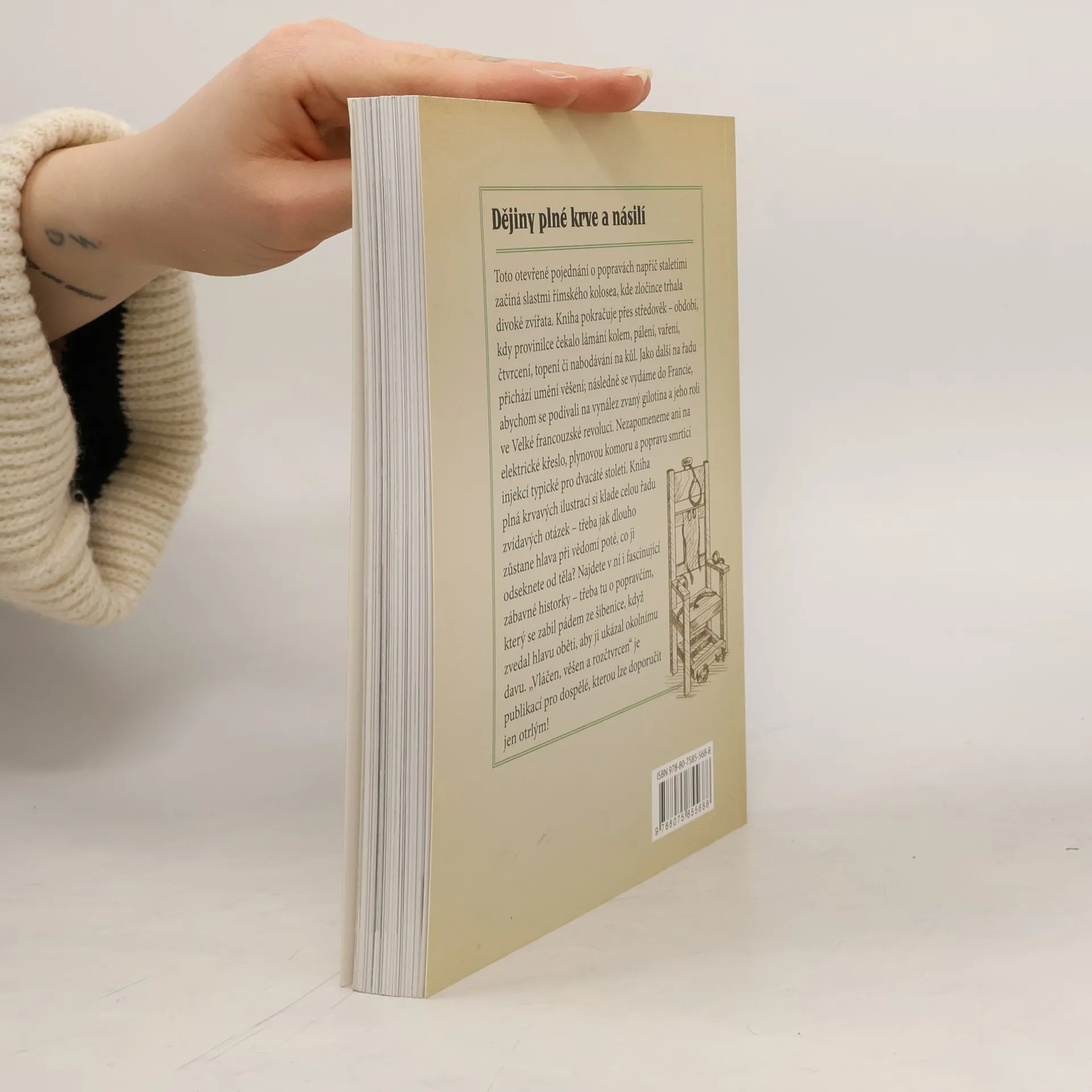 Toto otevřené pojednání o popravách napříč staletími začíná slastmi římského Kolosea, kde zločince trhala divoká zvířata. Kniha pokračuje přes středověk – období, kdy zločince čekalo lámání kolem, pálení, vaření, čtvrcení, topení či nabodávání na kůl. Jako další na řadu přichází umění věšení; následně se vydáme do Francie, abychom se podívali na vynález zvaný gilotina a jeho roli ve Velké francouzské revoluci. Nezapomeneme ani na elektrické křeslo, plynovou komoru a popravu smrtící injekcí typické pro dvacáté století.
