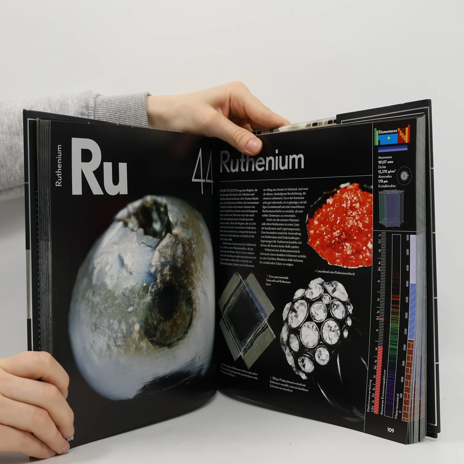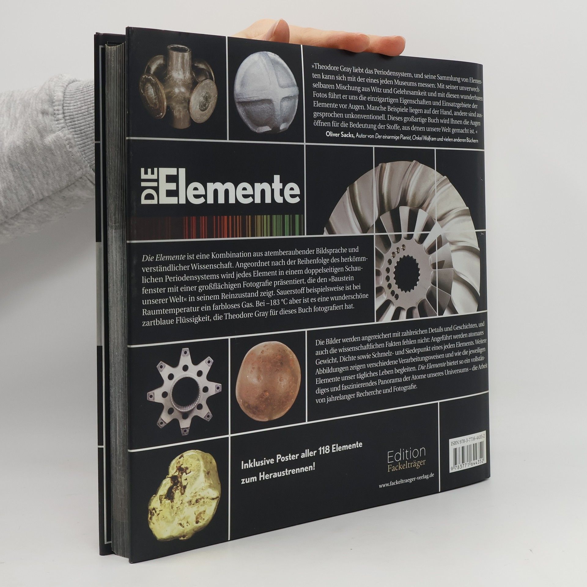 Die Elemente ist eine Kombination aus atemberaubender Bildsprache und verständlicher Wissenschaft. Angeordnet nach der Reihenfolge des herkömmlichen Periodensystems, bekommt jedes Element ein doppelseitiges Schaufenster mit einer großflächigen Fotografie, die den 'Baustein unserer Welt' in seiner ursprünglichen Form zeigt. Sauerstoff beispielsweise ist bei Raumtemperatur ein farbloses Gas. Bei –183 Grad aber ist es eine wunderschöne zartblaue Flüssigkeit, die Theodore Gray für dieses Buch fotografiert hat. Die Bilder werden angereichert mit zahlreichen Details und Geschichten, etwa über die heilenden Kräfte von Kupfer. Und auch die wissenschaftlichen Fakten fehlen nicht: Angeführt werden atomares Gewicht, Dichte sowie Schmelz- und Siedepunkt eines jeden Elements. Weitere Abbildungen zeigen verschiedene Verarbeitungsweisen und wie die jeweiligen Elemente unser tägliches Leben begleiten. Die Elemente bietet so ein vollständiges und faszinierendes Panorama der Atome unseres Universums – die Arbeit von jahrelanger Recherche und Fotografie.