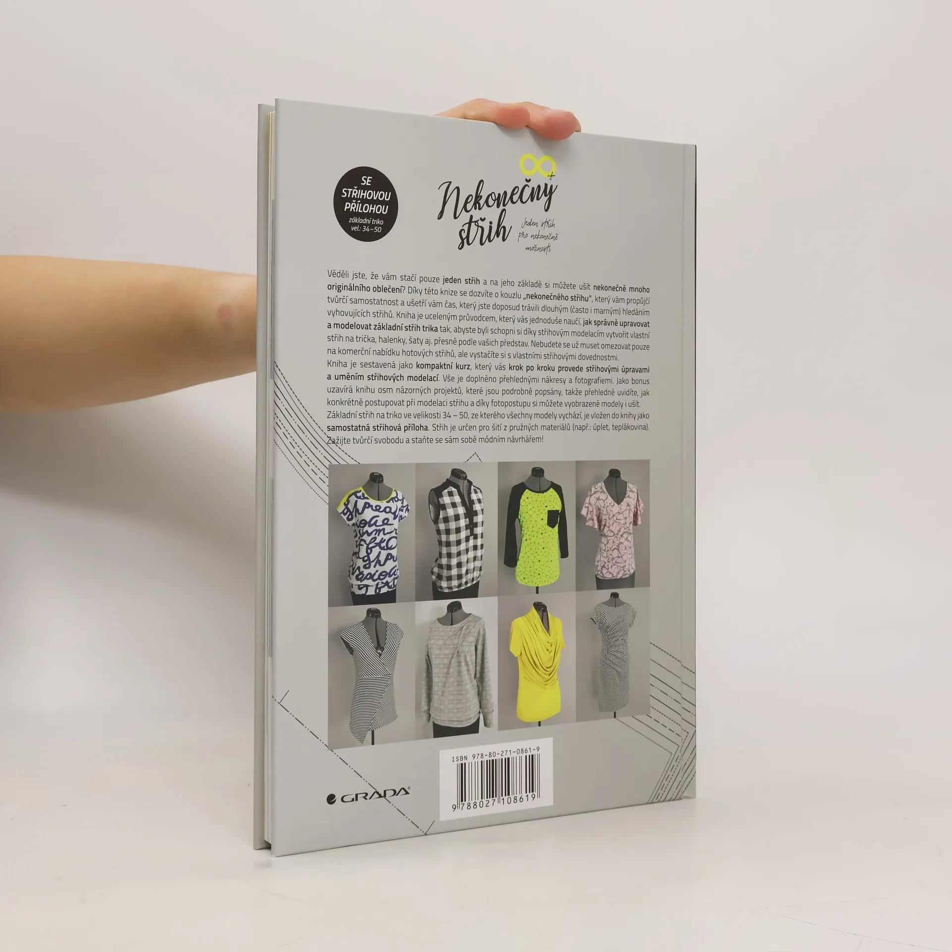 Věděli jste, že stačí pouze jeden střih, na jehož základě si můžete ušít nejen trička, ale dalšího mnoho originálního oblečení? Díky této knize, se dozvíte o kouzlu „nekonečného“ střihu, který vám propůjčí tvůrčí samostatnost a ušetří vám čas, který jste doposud trávili dlouhým (často i marným) hledáním vyhovujících střihů. Kniha je uceleným průvodcem, který vás jednoduše naučí, jak pracovat, upravovat a modelovat základní střih trika tak, abyste byli díky střihovým modelacím schopni si vytvořit vlastní střih na trika, halenky, šaty apod. přesně podle vašich představ a ve velikostech 34 – 50.