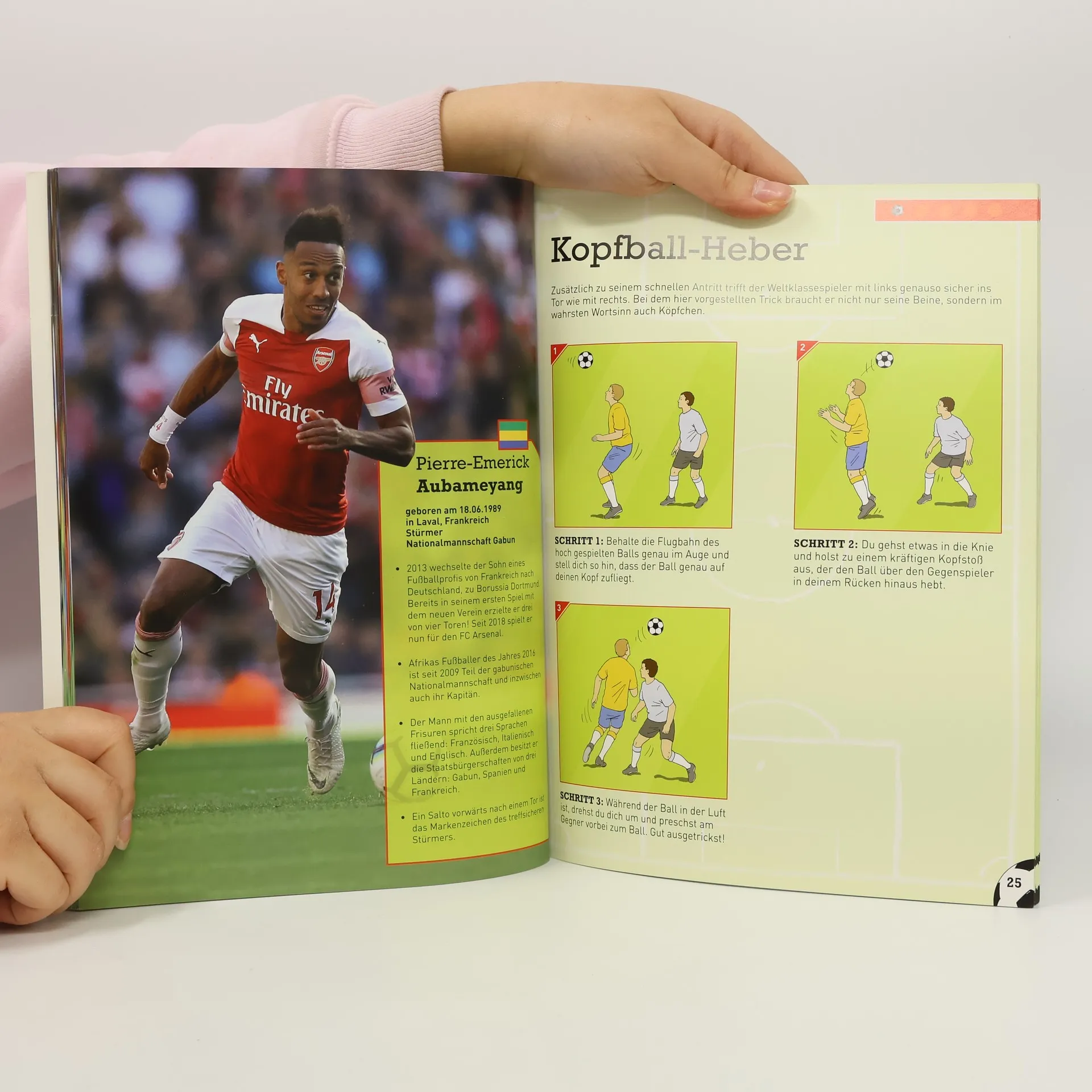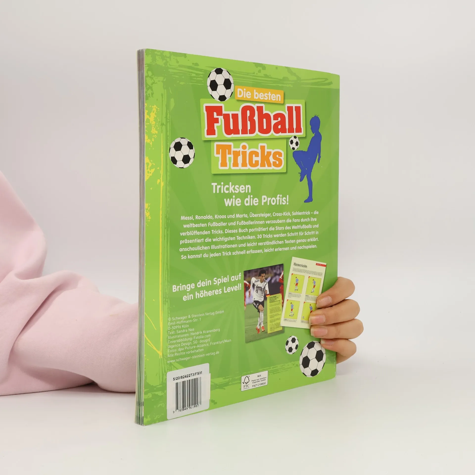 Tricksen wie die Profis • 30 Fußballtricks step-by-step erklärt • Steckbriefe der internationalen Fußballstars • So bringst du dein Spiel auf ein neues Level! Messi, Lewandowski, Kroos und Marta, Boateng, Robben, Pogba und De Bruyne: Die weltbesten Fußballer und Fußballerinnen verzaubern die Fans durch ihre verblüffenden Tricks. Auf den 64 Seiten werden die Besten der Besten mit einem Steckbrief und ganzseitigem Foto vorgestellt. Welcher Fußballstar beherrscht welchen Trick am besten? Übersteiger, Cross-Kick, Verzögerungsdribbling, Sohlentrick oder eine 360 Grad-Drehung um die eigene Achse, Haken schlagen, Kopfball-Heber und Rückzieher. Mit diesem Anleitungsbuch kannst du diese Tricks ganz schnell lernen und deine Technik verbessern. 30 Tricks werden Schritt für Schritt erklärt: Mit anschaulichen Illustrationen und leicht verständlichen Texten. So können schon junge Fußballer die Tricks schnell erfassen, leicht erlernen und nachspielen. Besonderes Extra: ein großformatiges Poster mit den Top-Tricks und vielen weiteren Infos zu WM, EM und den Fußballhelden! Los geht’s – Übung macht den Meister!