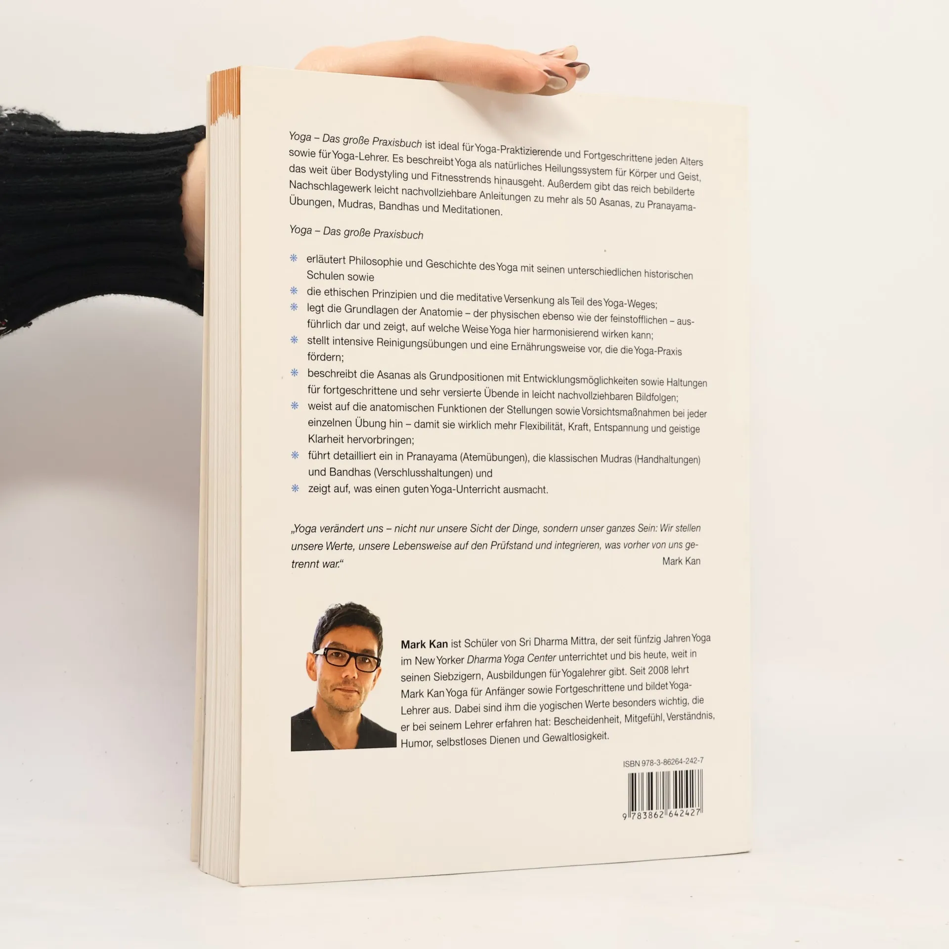 Das Praxisbuch ist ideal für Yoga-Praktizierende und Lehrer jeden Alters. Es beschreibt Yoga als ganzheitliches Heilungssystem für Körper und Geist, das über Fitness-Trends hinausgeht. Das reich bebilderte Nachschlagewerk bietet leicht nachvollziehbare Anleitungen zu über 50 Asanas, Pranayama-Übungen, Mudras, Bandhas und Meditationen. Es erläutert die Philosophie und Geschichte des Yoga sowie ethische Prinzipien und meditative Versenkung als Teil des Yoga-Weges. Die Grundlagen der Anatomie, sowohl physisch als auch feinstofflich, werden ausführlich erklärt, und es wird gezeigt, wie Yoga harmonisierend wirken kann. Intensive Reinigungsübungen und eine förderliche Ernährungsweise werden vorgestellt. Die Asanas werden als Grundpositionen mit Entwicklungsmöglichkeiten beschrieben, einschließlich Haltungen für Fortgeschrittene, unterstützt durch leicht nachvollziehbare Bildfolgen. Anatomische Funktionen und Vorsichtsmaßnahmen werden für jede Übung hervorgehoben, um Flexibilität, Kraft, Entspannung und geistige Klarheit zu fördern. Zudem wird detailliert auf Pranayama, klassische Mudras und Bandhas eingegangen und erklärt, was einen guten Yoga-Unterricht ausmacht. „Yoga verändert uns – nicht nur unsere Sicht der Dinge, sondern unser ganzes Sein.“