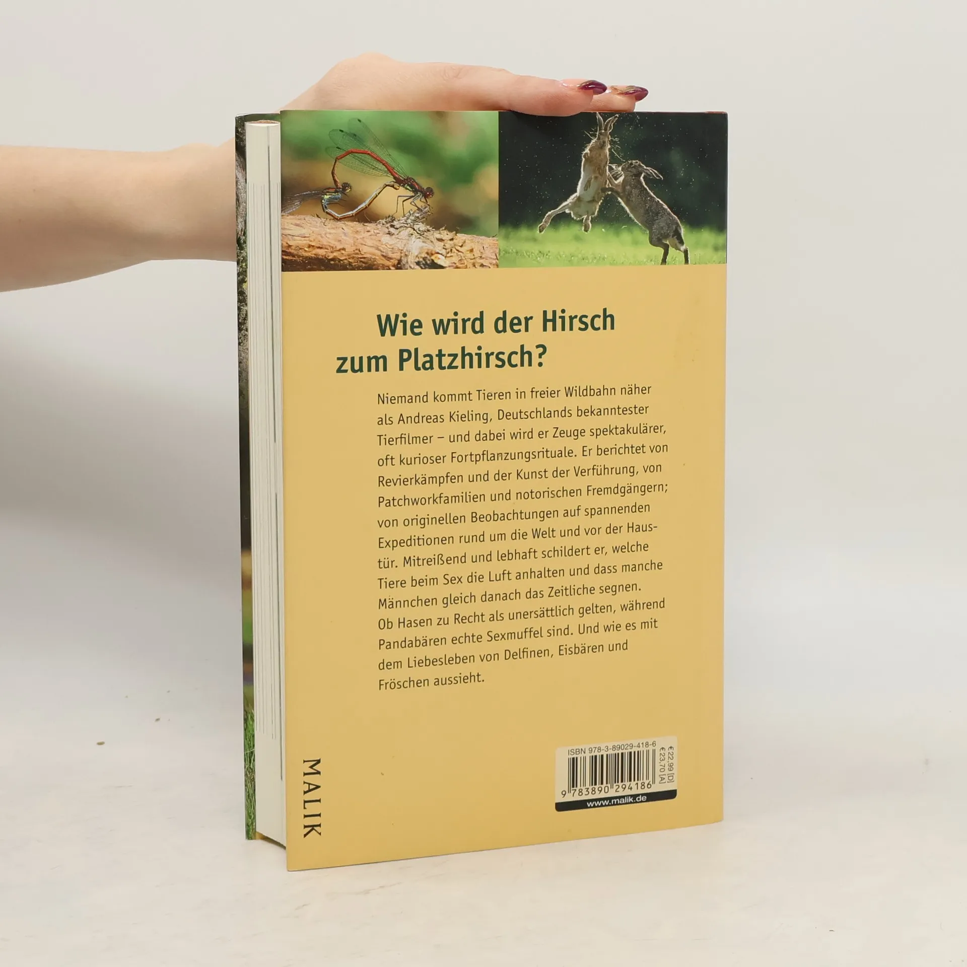 Als Dokumentarfilmer verbringt Andreas Kieling monatelang mit Tieren und erlebt den Kreislauf der Natur aus nächster Nähe. Er ist bei der Hirschbrunft in der Eifel dabei; im Kongo beobachtet er, wie fürsorglich sich stattliche Berggorillamännchen um ihren Nachwuchs kümmen. Er erzählt von seinen spannendsten Reisen, die ihn zu liebestollen Löwen, zu Flussdelfinen und seltenen Wüstenelefanten führen, aber auch von heimischen Arten: vom Liebesleben der Frösche und Feldhasen, davon, wie sich Auerhähne, Bergmolche oder Igel paaren. Welche Tiere monogam leben und welche lieber einen Harem um sich scharen. Ob es im Tierreich Familienplanung oder Eifersucht gibt. Und welche Arten dem Menschen in ihrem Sexualverhalten am ähnlichsten sind.