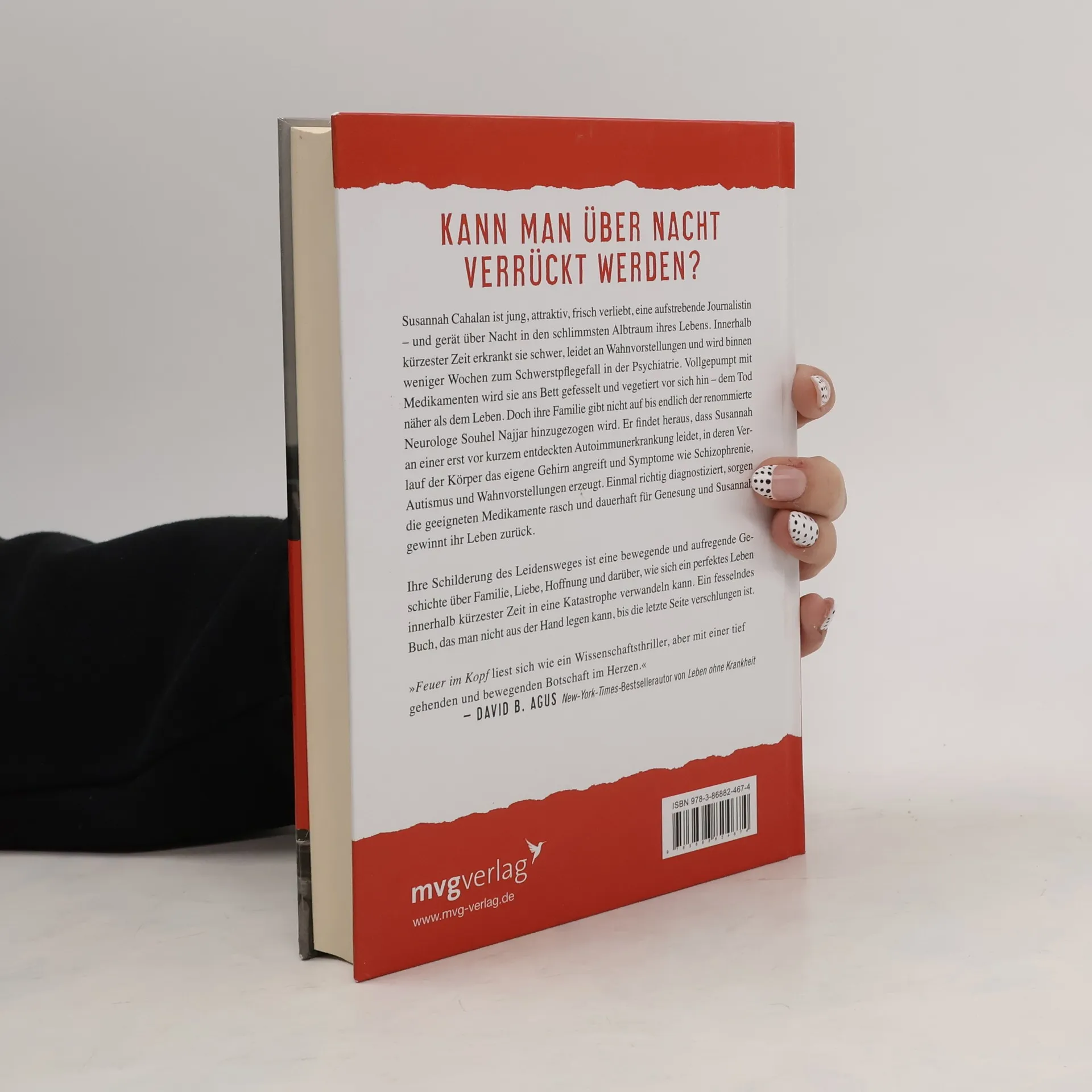 Susannah Cahalan ist jung, attraktiv, frisch verliebt, eine aufstrebende Journalistin – und gerät über Nacht in den schlimmsten Albtraum ihres Lebens. Innerhalb kürzester Zeit erkrankt sie schwer, leidet an Wahnvorstellungen und wird binnen weniger Wochen zum Schwerstpflegefall in der Psychiatrie. Vollgepumpt mit Medikamenten wird sie ans Bett gefesselt und vegetiert vor sich hin – dem Tod näher als dem Leben. Doch ihre Familie gibt nicht auf bis endlich der renommierte Neurologe Souhel Najjar hinzugezogen wird. Er findet heraus, dass Susannah an einer erst vor kurzem entdeckten Autoimmunerkrankung leidet, in deren Verlauf der Körper das eigene Gehirn angreift und Symptome wie Schizophrenie, Autismus und Wahnvorstellungen erzeugt. Einmal richtig diagnostiziert, sorgen die geeigneten Medikamente rasch und dauerhaft für Genesung und Susannah gewinnt ihr Leben zurück. Ihre Schilderung des Leidensweges ist eine bewegende und aufregende Geschichte über Familie, Liebe, Hoffnung und darüber, wie sich ein perfektes Leben innerhalb kürzester Zeit in eine Katastrophe verwandeln kann. Ein fesselndes Buch, das man nicht aus der Hand legen kann, bis die letzte Seite verschlungen ist.