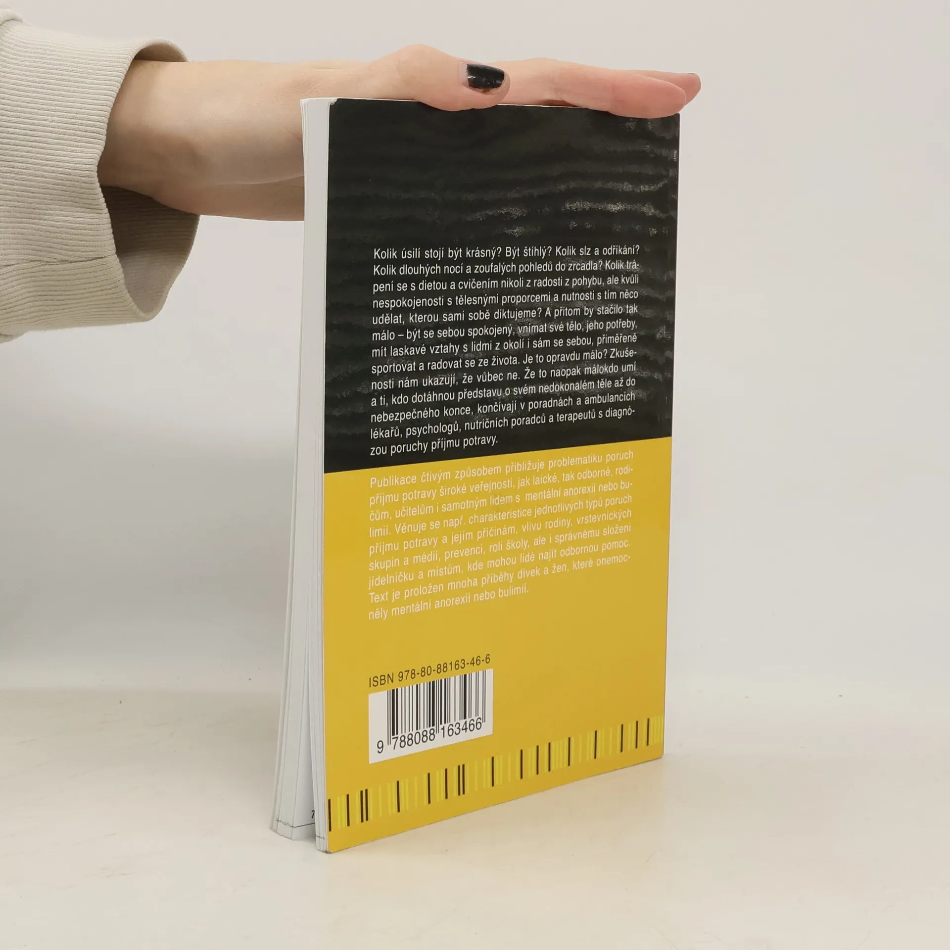 Kolik úsilí stojí být krásný? Být štíhlý? Kolik slz a odříkání? Kolik dlouhých nocí a zoufalých pohledů do zrcadla? Kolik trápení se s dietou a cvičením nikoli z radosti z pohybu, ale kvůli nespokojenosti s tělesnými proporcemi a nutnosti s tím něco udělat, kterou sami sobě diktujeme? A přitom by stačilo tak málo – být se sebou spokojený, vnímat své tělo, jeho potřeby, mít laskavé vztahy s lidmi z okolí i sám se sebou, přiměřeně sportovat a radovat se ze života. Je to opravdu málo? Zkušenosti nám ukazují, že vůbec ne. Že to naopak málokdo umí a ti, kdo dotáhnou představu o svém nedokonalém těle až do nebezpečného konce, končívají v poradnách a ambulancích lékařů, psychologů, nutričních poradců a terapeutů s diagnózou poruchy příjmu potravy. Publikace čtivým způsobem přibližuje problematiku poruch příjmu potravy široké veřejnosti, jak laické, tak odborné, rodičům, učitelům i samotným lidem trpícím mentální anorexií nebo bulimií. Věnuje se např. charakteristice jednotlivých typů poruch příjmu potravy a jejím příčinám, vlivu rodiny, vrstevnických skupin a médií, prevenci, roli školy, ale i správnému složení jídelníčku a místům, kde mohou lidé najít odbornou pomoc. Text je proložen mnoha příběhy.