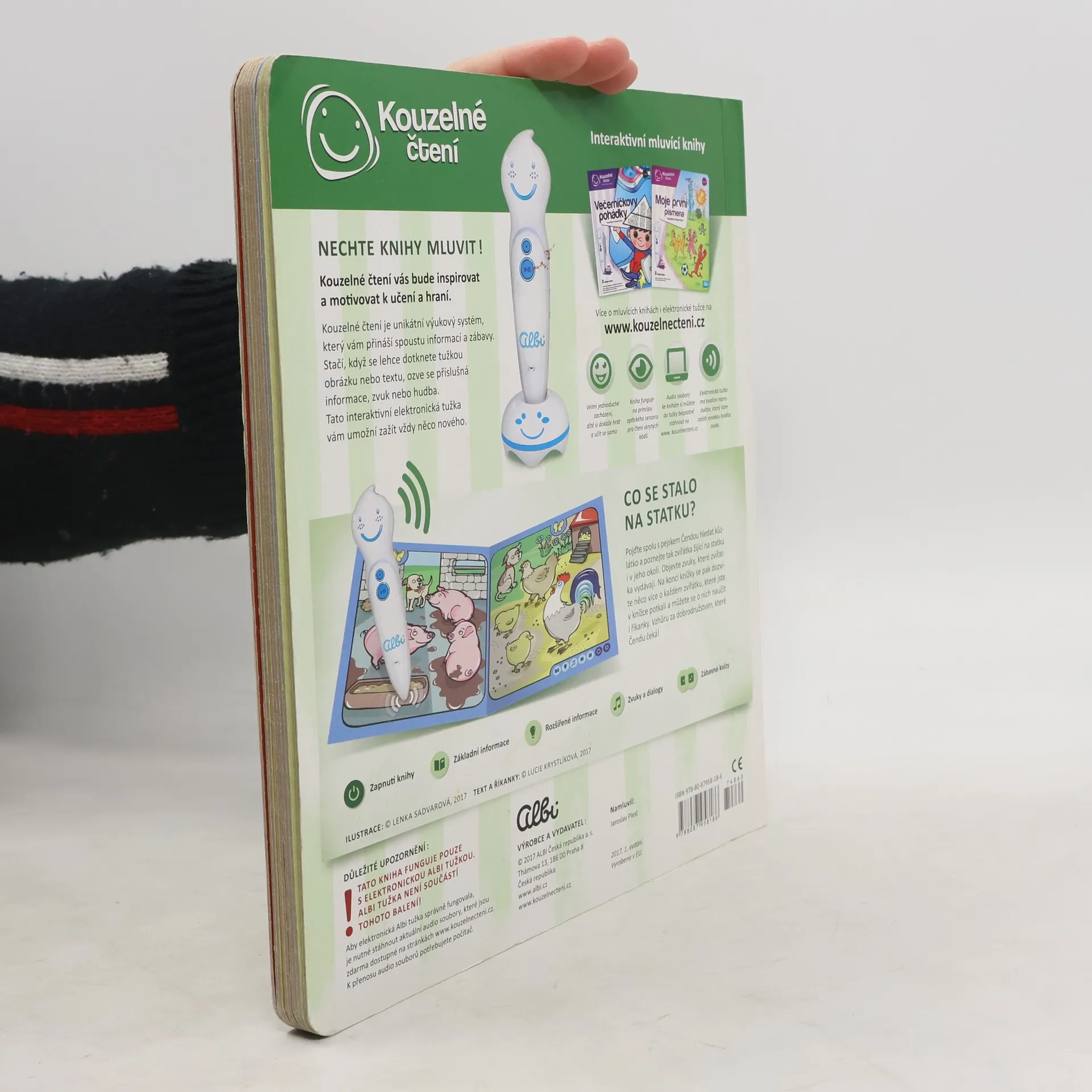 Interaktivní kniha Zvířátka na statku pozve nejmenší děti na dobrodružnou výpravu pejska Čendy za ztraceným kůzlátkem. Kniha z edice Kouzelné čtení je plná zábavných říkanek a informací o tom, co zažil malý pejsek na statku a kousek za ním. V naučné knize Zvířátka na statku objeví zvuky, které zvířátka vydávají. Na konci knížky se pak dozví více informací o každém zvířátku, které v knížce potkali a můžou se o nich naučit i říkanky. Vzhůru za dobrodružstvím, které Čendu čeká! Namluvil Jaroslav Plesl. Ilustrace Lenka Sadvarová. Text a říkanky Lucie Krystlíková. Kniha obsahuje přes 1000 zvuků a textů.