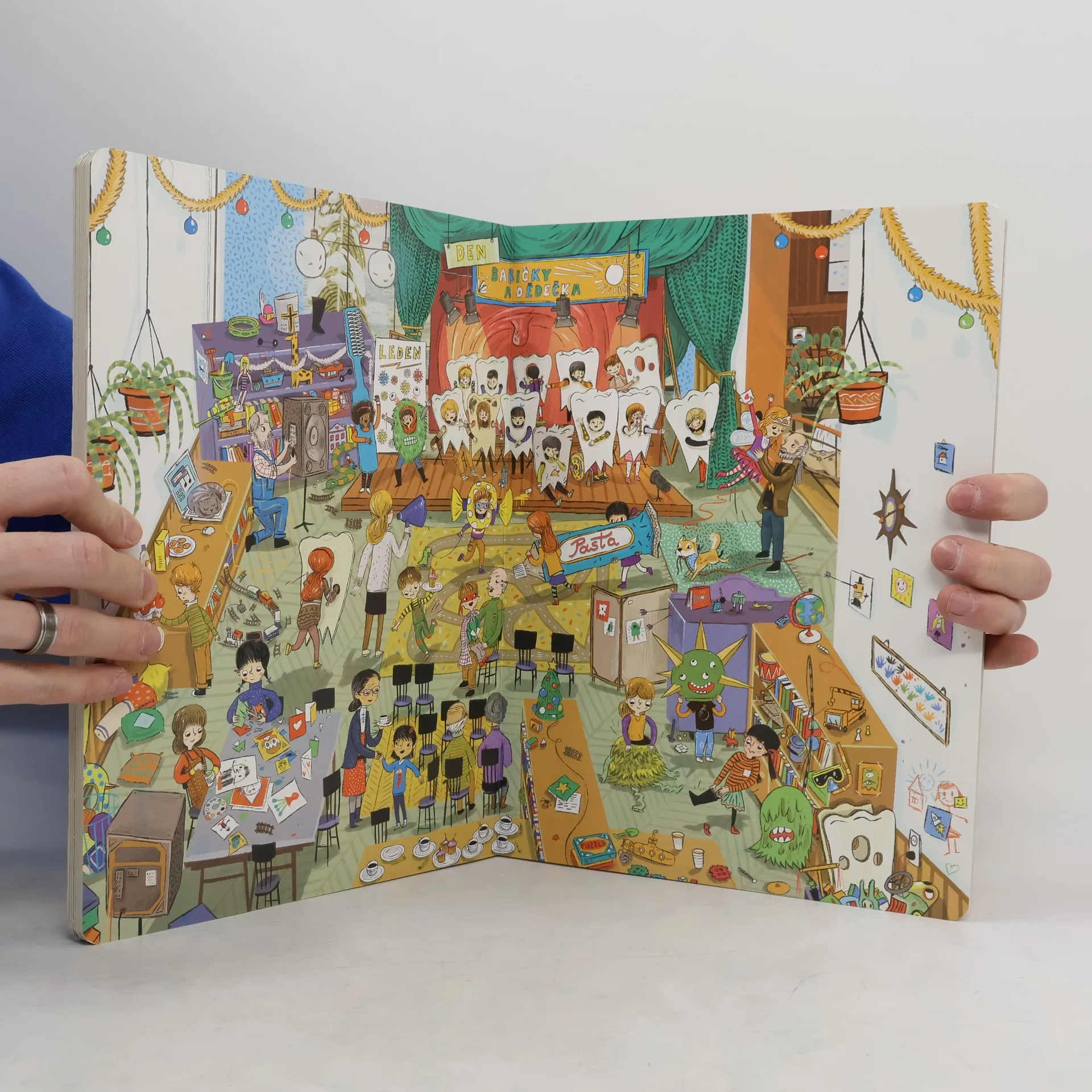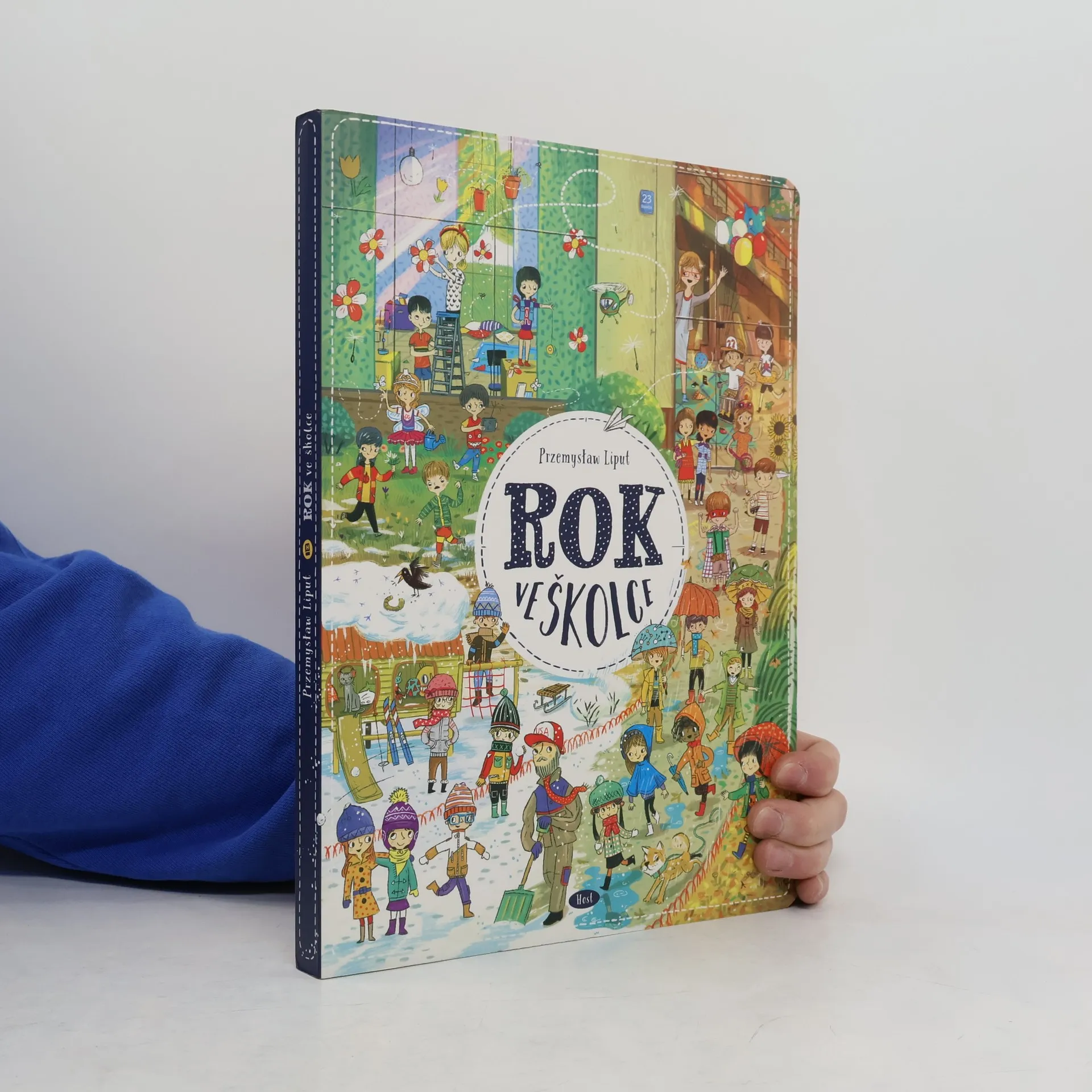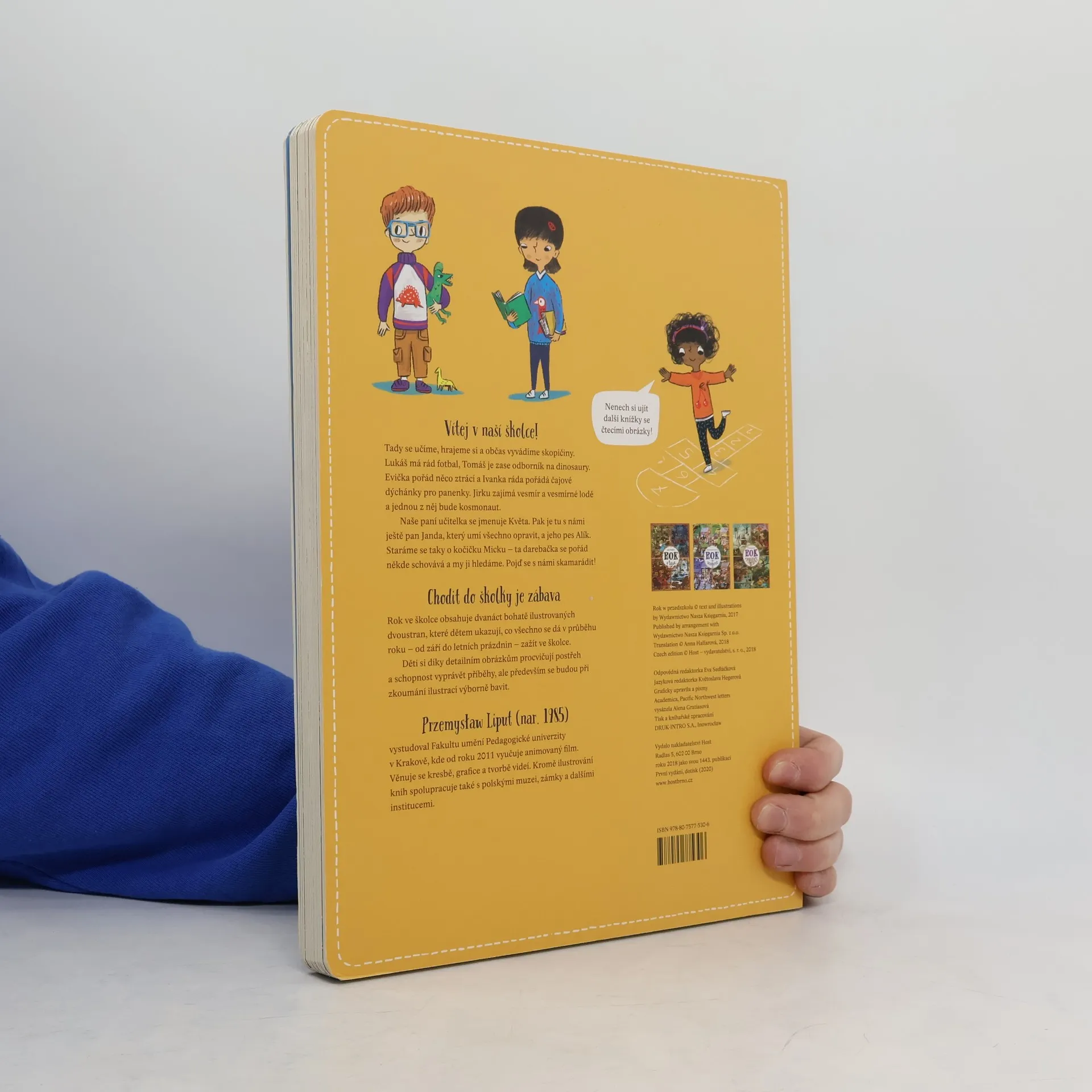 Vítej v naší školce! Tady se učíme, hrajeme si a občas vyvádíme skopičiny. Lukáš má rád fotbal, Tomáš je zase odborník na dinosaury. Evička pořád něco ztrácí a Ivanka ráda pořádá čajové dýchánky pro panenky. Jirku zajímá vesmír a vesmírné lodě a jednou z něj bude kosmonaut. Naše paní učitelka se jmenuje Květa. Pak je tu s námi ještě pan Janda, který umí všechno opravit, a jeho pes Alík. Staráme se taky o kočičku Micku – ta darebačka se pořád někde schovává a my ji hledáme. Pojď se s námi skamarádit! Chodit do školky je zábava. Rok ve školce obsahuje dvanáct bohatě ilustrovaných dvoustran, které dětem ukazují, co všechno se dá v průběhu roku – od září do letních prázdnin – zažít ve školce. Děti si díky detailním obrázkům procvičují postřeh a schopnost vyprávět příběhy, ale především se budou při zkoumání ilustrací výborně bavit.