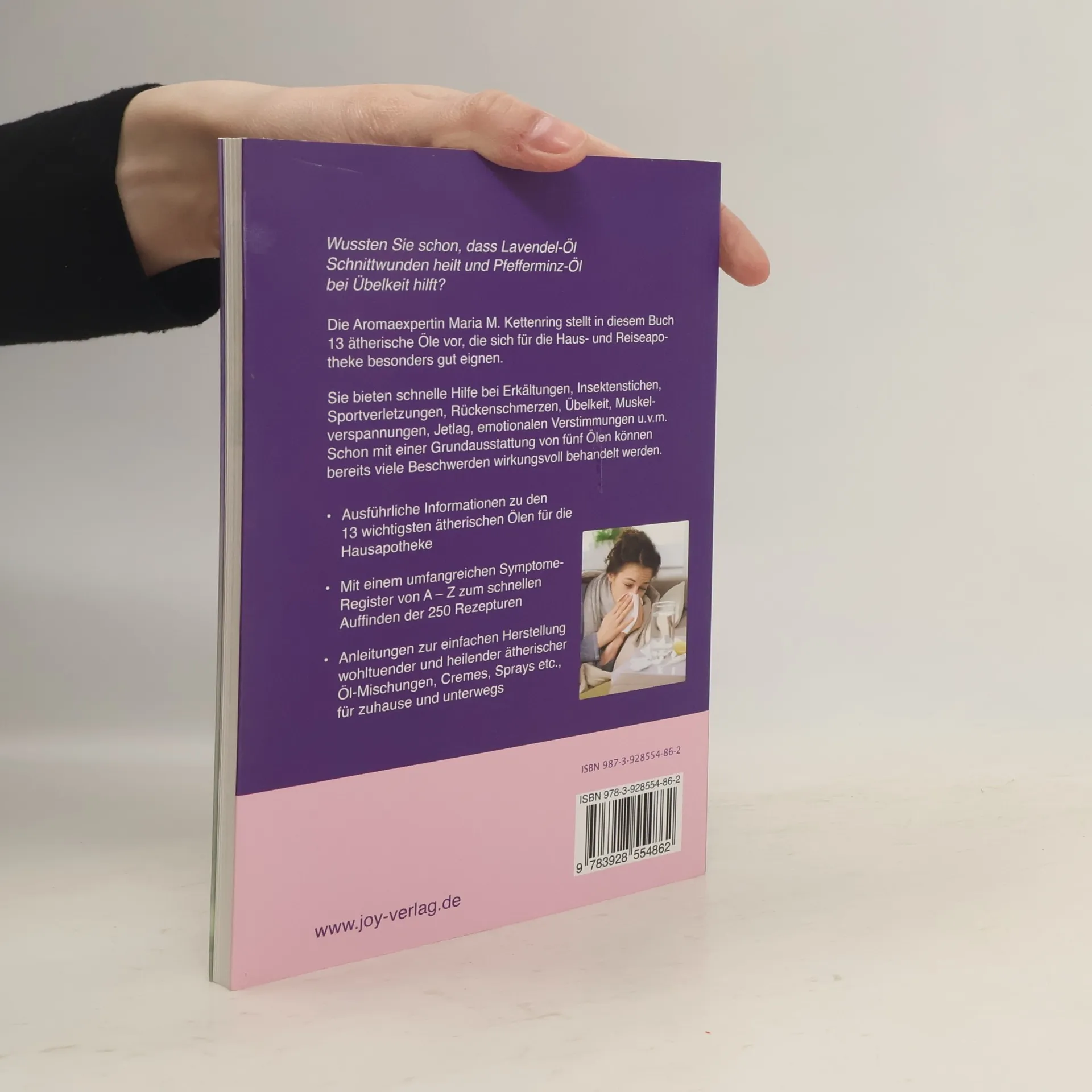 Die Aromaexpertin Maria M. Kettenring stellt in ihrem neuen Buch 13 ätherische Öle vor, die sich für die Haus- und Reiseapotheke besonders gut eignen. Sie bieten schnelle Hilfe bei Erkältungen, Insektenstichen, Sportverletzungen, Muskelverspannungen, Rückenschmerzen, Übelkeit, Jetlag, emotionalen Verstimmungen u. v. m. Schon mit einer Grundausstattung von fünf Ölen können bereits viele Beschwerden wirkungsvoll behandelt werden. - Ausführliche Informationen zu den 13 wichtigsten ätherischen Ölen für die Hausapotheke - Mit einem umfangreichen Symptome-Register von A–Z für den schnellen Zugriff auf über 250 Rezepturen - Anleitungen zur einfachen Herstellung wohltuender und heilender ätherischer Öl-Mischungen, Cremes, Sprays etc., für zuhause und unterwegs