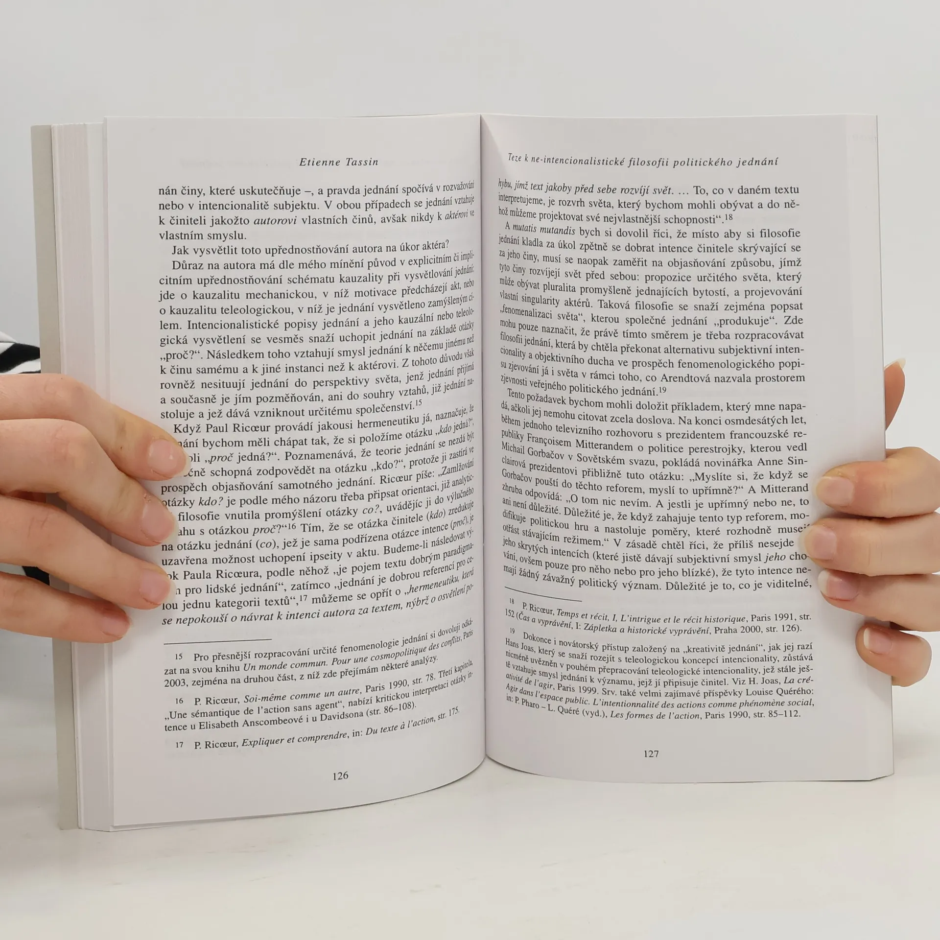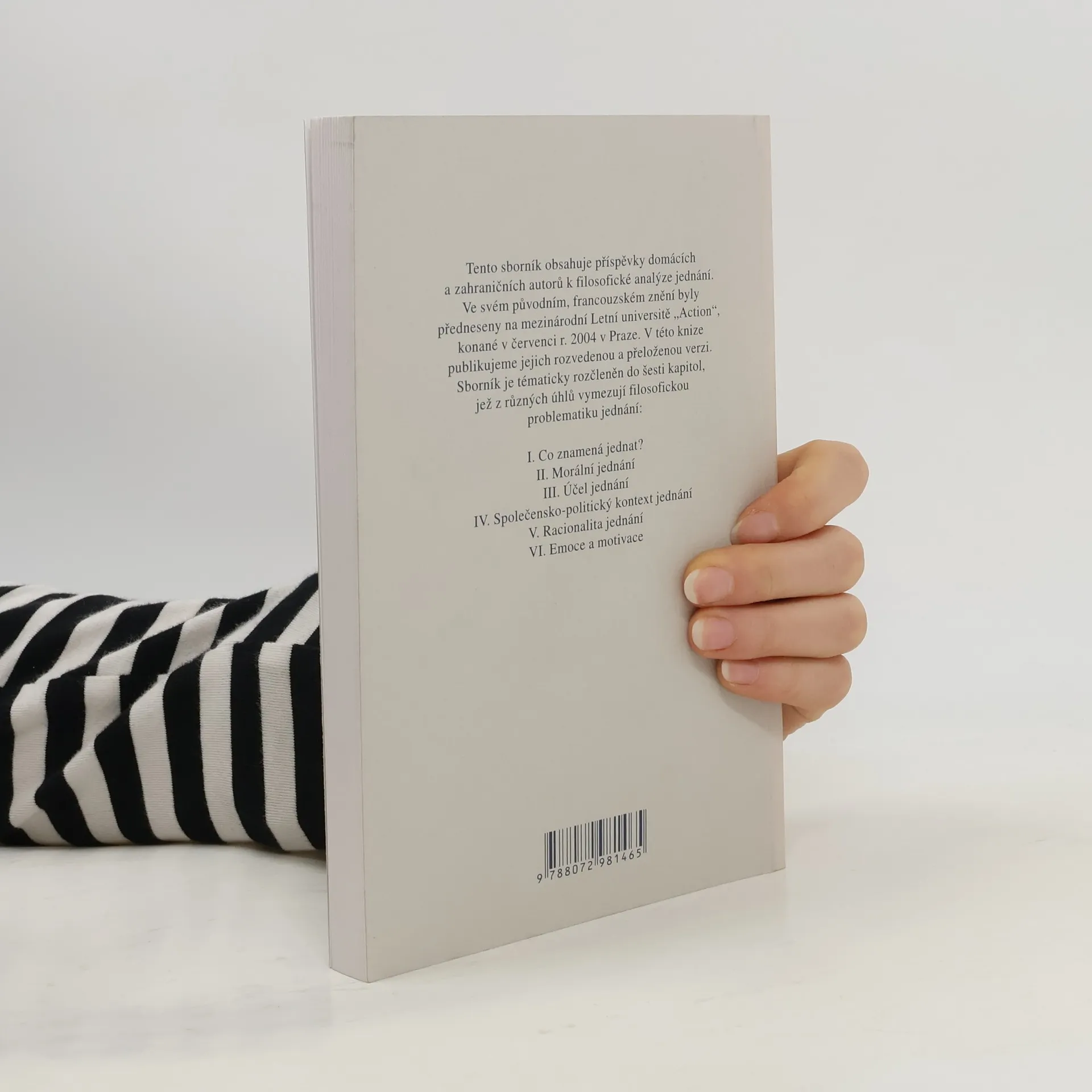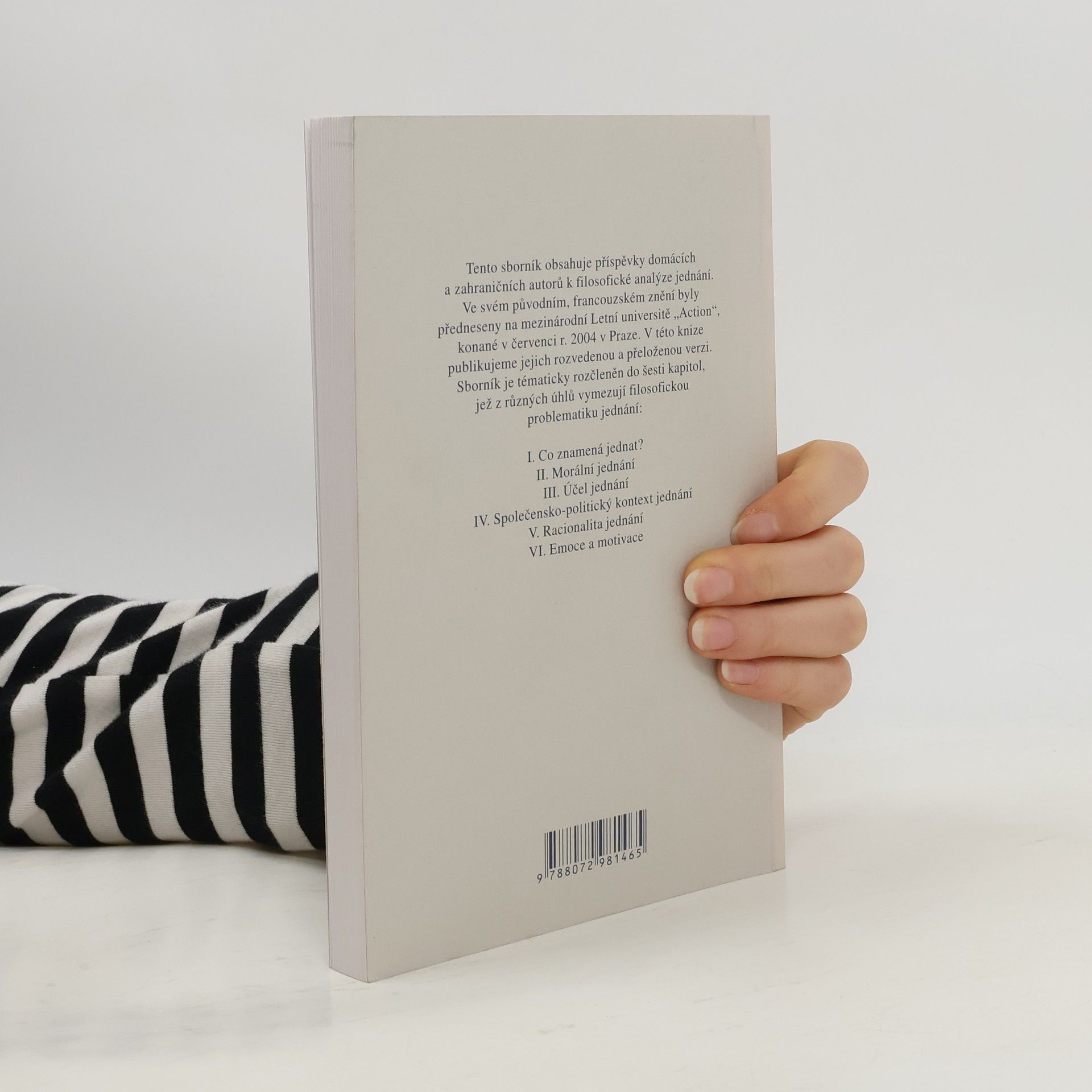Sborník příspěvků k filosofickému rozboru jednání se člení do pododdílu “motivace a emoce”, “pravidla a kontext”, “racionalita jednaní”, “mluvit a jednat”. Jejich autoři v nich shrnují výsledky své práce k danému problému (F. Karfík, J. Sokol, J. Čapek, O. Švec, F. Wolff, P. Canivez, B. Znepolski, S. Virvidakis, P. Kontos).
