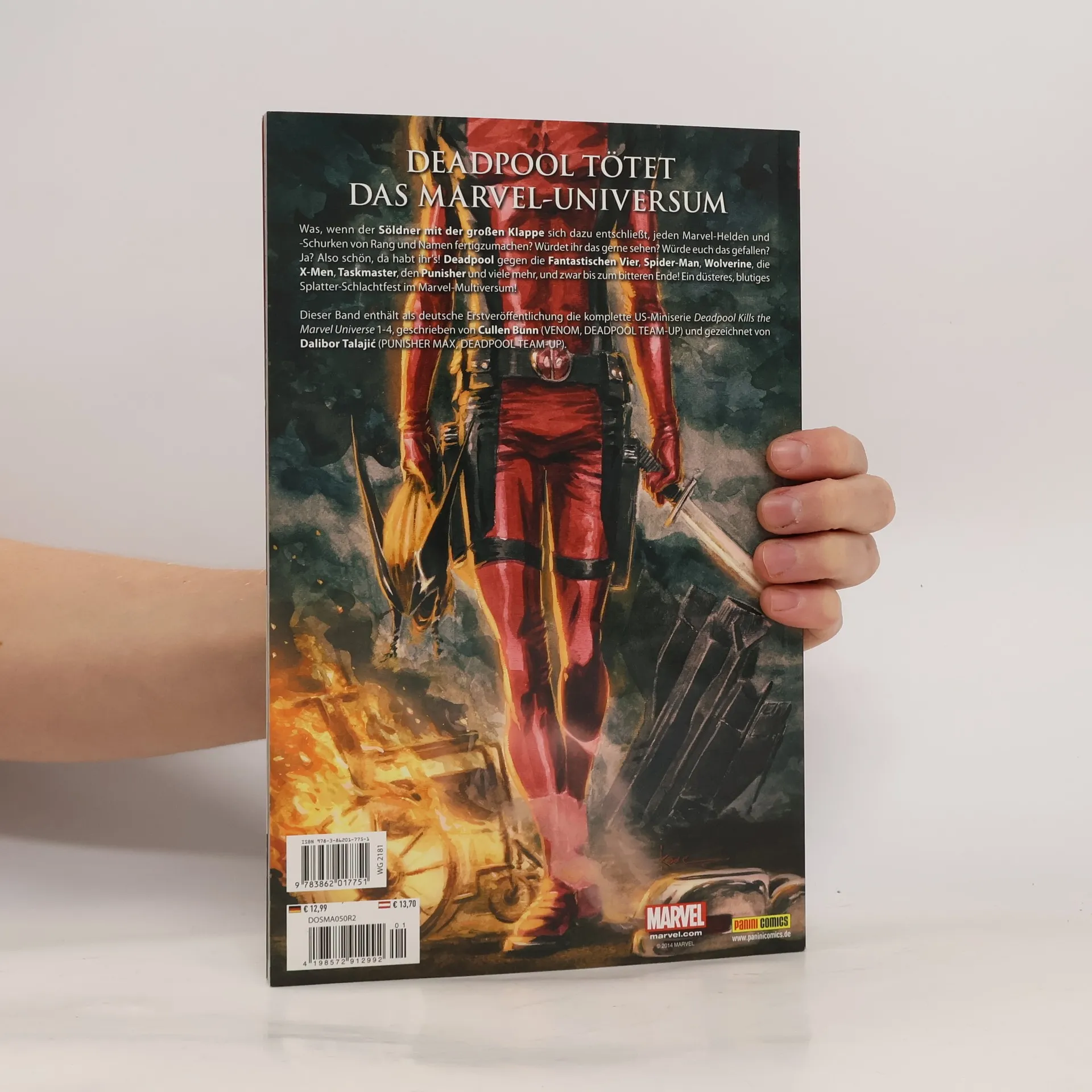 Das Marvel-Multiversum! Unendliche Weiten voller Helden und Schurken! Was passiert allerdings, wenn Deadpool sich entschließt, es mit ihnen allen aufzunehmen? Wenn der Söldner mit der großen Klappe loszieht, um die Fantastischen Vier, Spider-Man, Wolverine, die X-Men und den ganzen Rest plattzumachen? Dann wirds ein blutiges Splatter-Schlachtfest. Die komplette Splatter-Miniserie in einem Band!