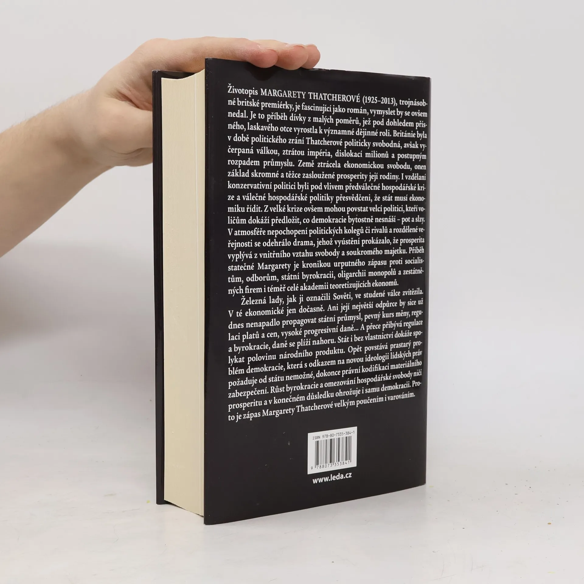 Životopis Margarety Thatcherové (1925–2013), trojnásobné britské premiérky, je fascinujícím příběhem dívky z malých poměrů, která se pod dohledem přísného, avšak laskavého otce vypracovala k významné historické roli. V době jejího politického zrání byla Británie svobodná, ale vyčerpaná válkou a ztrátou impéria, což vedlo k postupnému úpadku průmyslu a ekonomické svobody. Vzdělaní konzervativní politici byli ovlivněni předválečnou krizí a věřili, že stát musí řídit ekonomiku. Z krize však mohou povstat velcí politici, kteří voličům předloží, co demokracie nesnáší – pot a slzy. V atmosféře nepochopení a rozdělené veřejnosti se odehrálo drama, které ukázalo, že prosperita vychází z vnitřního vztahu svobody a soukromého majetku. Margareta se statečně postavila socialistům, odborům a státní byrokracii. Sověti ji označili za „Železnou lady“, která ve studené válce zvítězila. I když dnes už nikdo nepropaguje státní průmysl, regulace a byrokracie se opět zvyšují, ohrožující ekonomickou svobodu a tím i demokracii. Zápas Margarety Thatcherové je proto důležitým poučením a varováním pro současnost.
