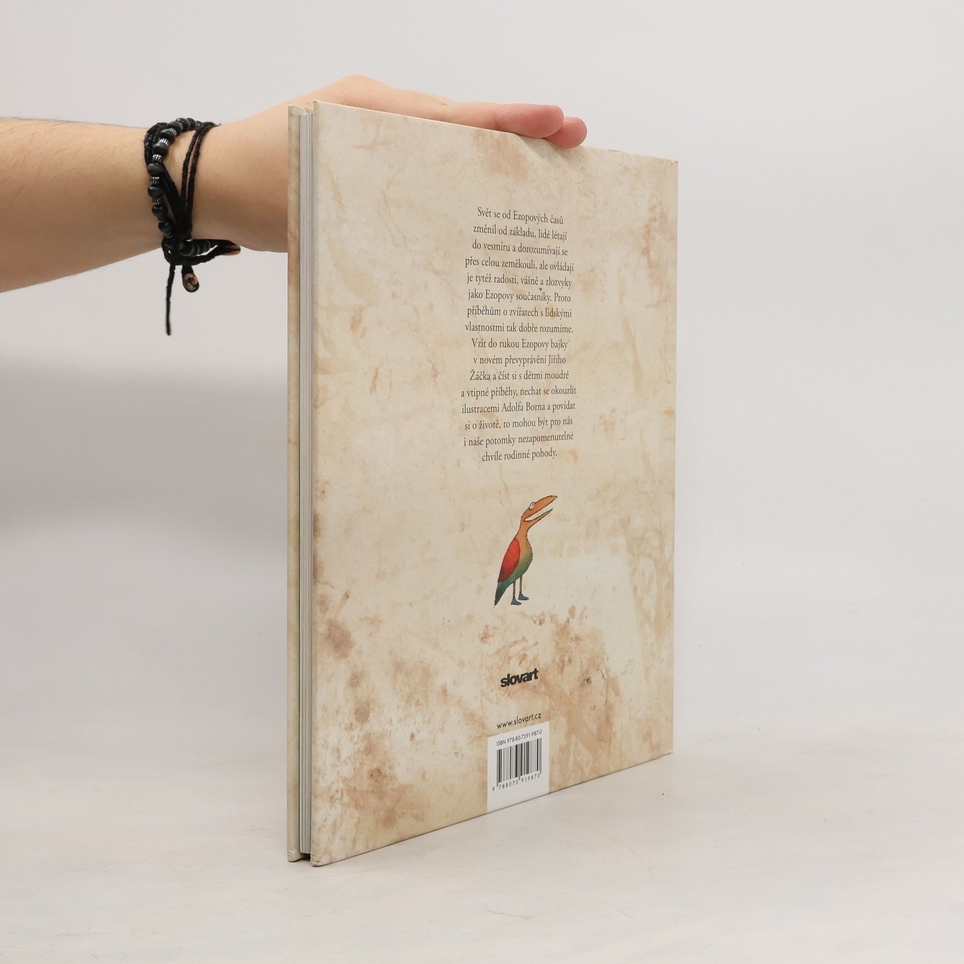 Podle dějepisce Herodota žil v Malé Asii v 6. století před Kristem otrok Aisopos čili Ezop. Byl prý hrbatý, znetvořený a koktavý, ale hlavu měl bystřejší a myšlení pronikavější než lidé urostlí a zdraví. Uměl pobavit posluchače zvířecími bajkami a vtipnými příběhy, ale zdaleka ne všichni jeho současníci byli jeho obdivovatelé. Traduje se, že byl v Delfách popraven za údajné rouhání bohům. Ezopovi byla připisována většina starověkých bajek, zapsány však byly až po třech stoletích od jeho smrti. Mnohokrát byly převyprávěny prózou i ve verších a najde se jen málo těch, co by nevěděli, kdo byl Ezop. Ale ať už se ten moudrý muž jmenoval Ezop, nebo jinak, ať už žil v 6. století před Kristem, anebo jindy, ať už byl thráckého původu, nebo jného, hlavní je, že jeho bajky dodnes nezestárly. Svět se za tu dobu změnil od základu, lidé létají do vesmíru a dorozumívají se přes celou zeměkouli, ale ovládají je tytéž radosti, vášně a zlozvyky jako Ezopovy současníky. Proto jim tak dobře rozumíme - dospělí i děti. Vzít do rukou převyprávění Ezopových bajek od Jiřího Žáčka a číst si s dětmi moudré a vtipné příběhy, prohlížet si ilustrace Adolfa Borna a povídat si o životě, to může být chvíle, která se nám zapíše do paměti.
