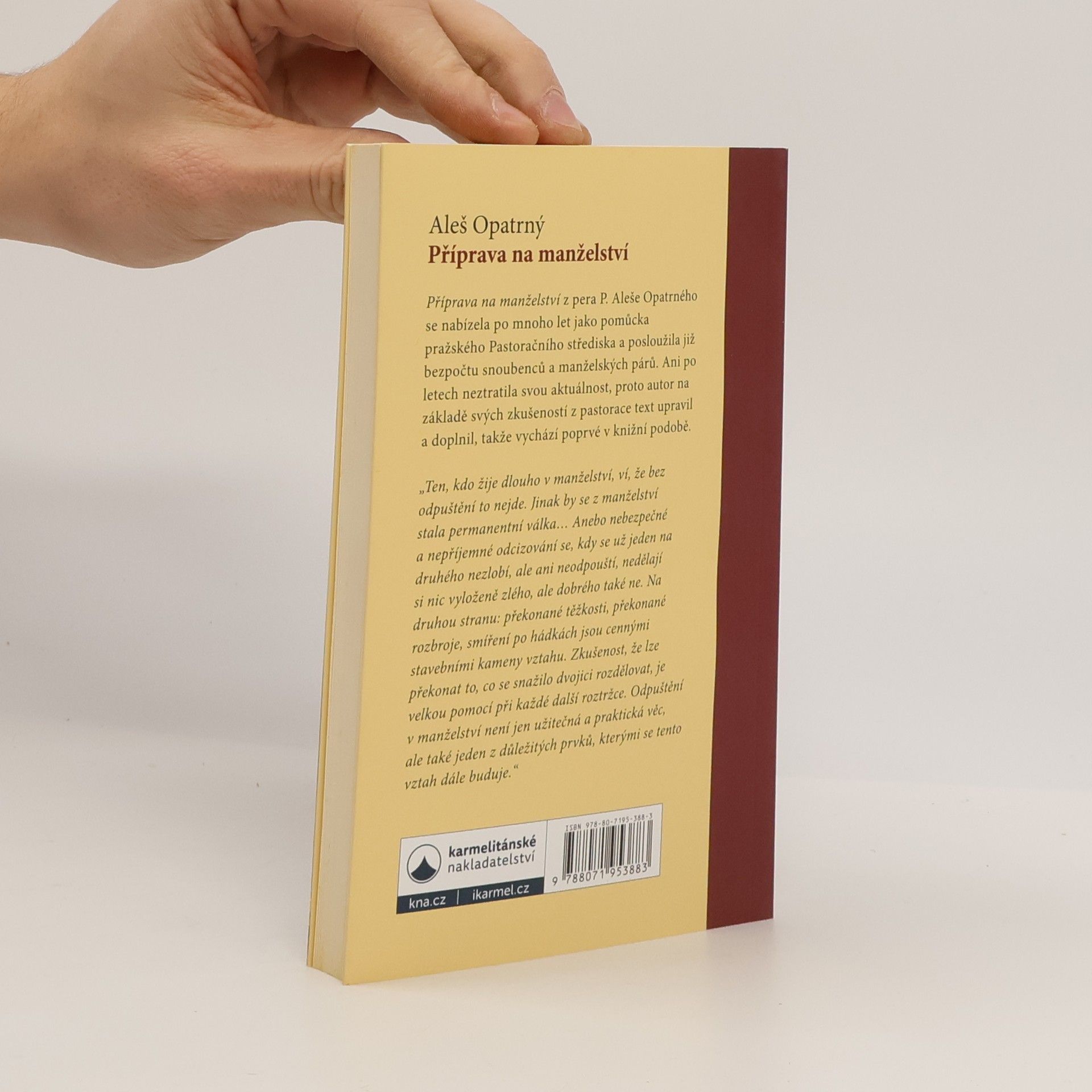„Ten, kdo žije dlouho v manželství, ví, že bez odpuštění to nejde. Jinak by se z manželství stala permanentní válka... Anebo nebezpečné a nepříjemné odcizování se, kdy se už jeden na druhého nezlobí, ale ani neodpouští, nedělají si nic vyloženě zlého, ale dobrého také ne. Na druhou stranu: překonané těžkosti, překonané rozbroje, smíření po hádkách jsou cennými stavebními kameny vztahu. Zkušenost, že lze překonat to, co se snažilo dvojici rozdělovat, je velkou pomocí při každé další roztržce. Odpuštění v manželství není jen užitečná a praktická věc, ale také jeden z důležitých prvků, kterými se tento vztah dále buduje.“ Příprava na manželství z pera P. Aleše Opatrného se nabízela po mnoho let jako pomůcka pražského Pastoračního střediska a posloužila již bezpočtu snoubenců a manželských párů. Ani po letech neztratila svou aktuálnost, proto autor na základě svých zkušeností z pastorace text upravil a doplnil, takže vychází poprvé v knižní podobě.