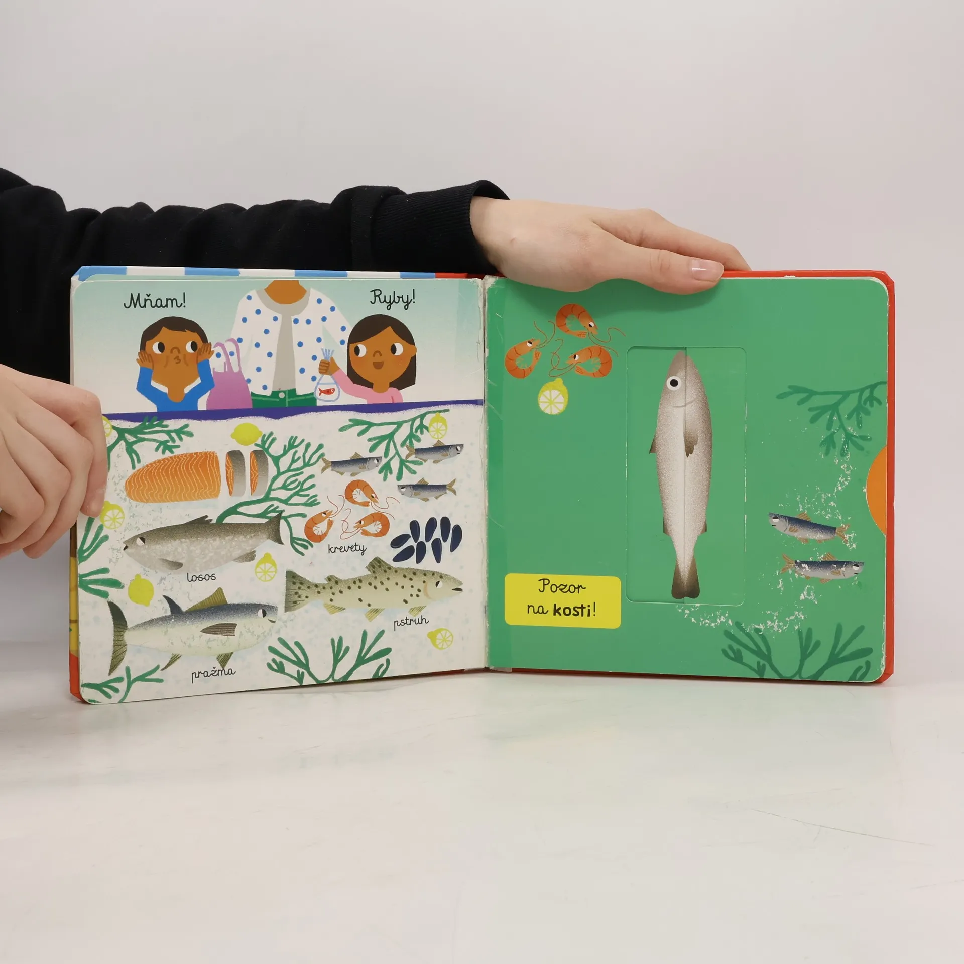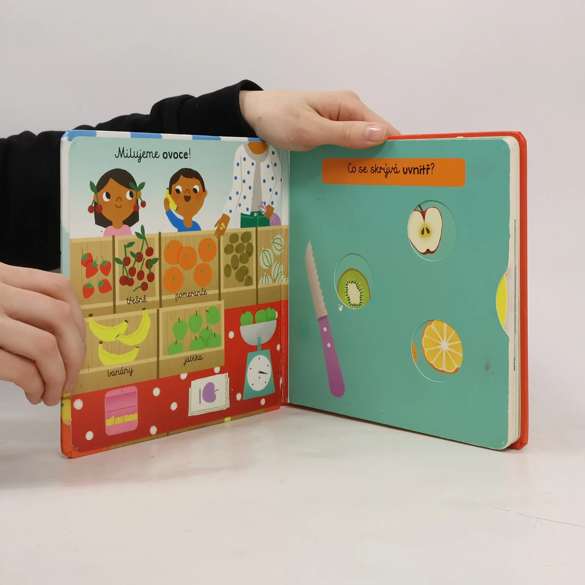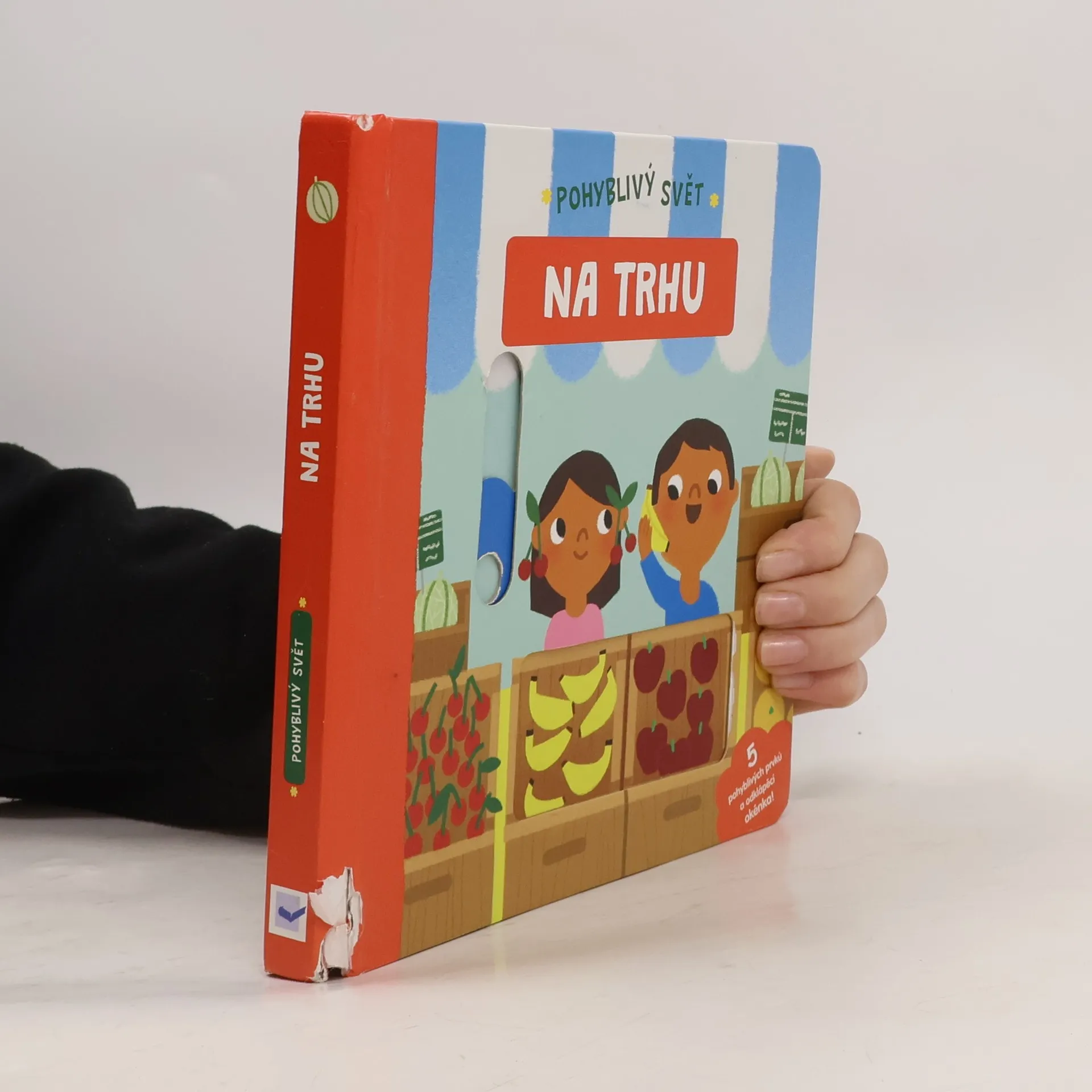Leporelo s pohyblivými prvky seznámí malého čtenáře s čerstvými potravinami, které se dají na trhu koupit a pomůže mu se mezi jednotlivými stánky orientovat.