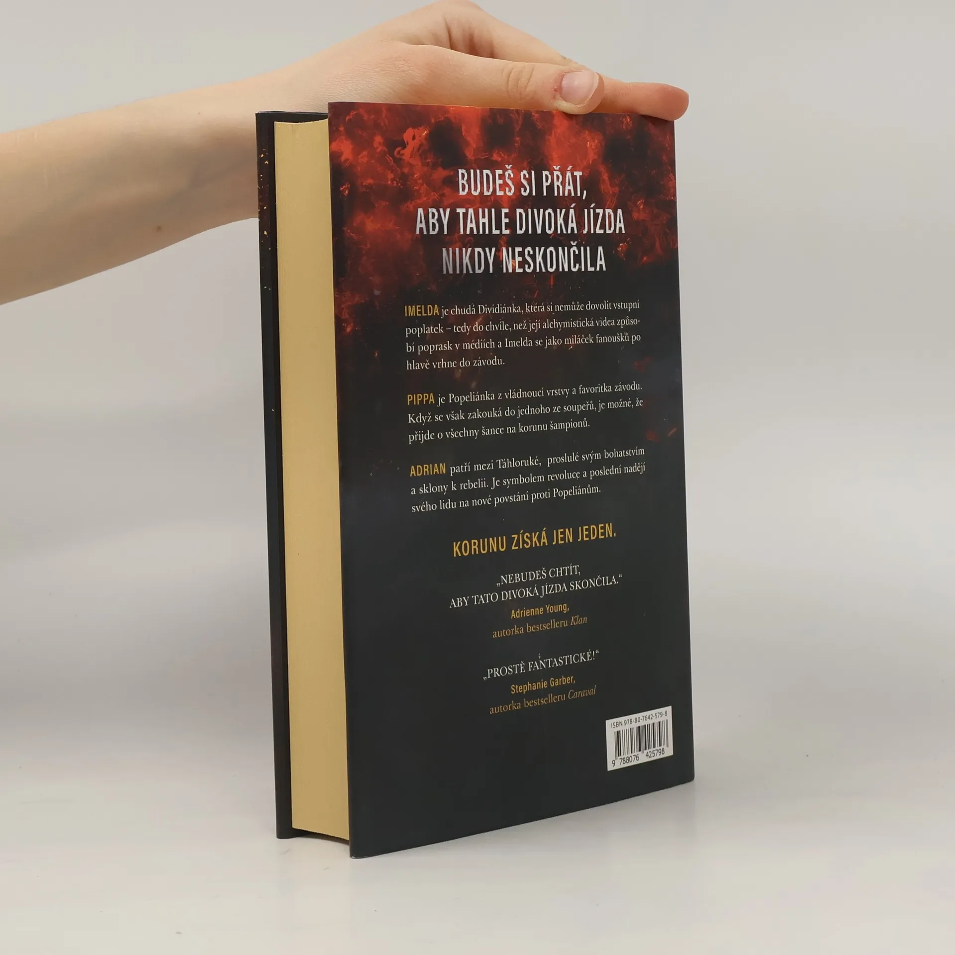 Už odedávna, kdy Popeliáni dostali od svých božstev fénixy, na nich jezdí do bitev, na lov a zejména na proslulém Dostihu. Elitní jezdci ze znepřátelených kultur touží po vítězství, a tak pilují dávné umění vytvářet a ovládat fénixy – koně, kteří se za pomoci alchymie rodí z popela. Každé ráno znovu povstávají, aby večer opět shořeli v ničivých plamenech. Dobrá alchymie ovšem není k ničemu, pokud jezdec nepřežije brutální noční souboje. Vražda je sice nezákonná, ale lámat kosti a otrávit popel je legální – publikum to dokonce vyžaduje. V letošním závodě soutěží jedenáct jezdců, ale tři z nich riskují víc než ostatní – dcera dvou bývalých šampionů, nadějná stipendistka a syn revolucionáře. Kterému z nich se podaří splnit si svůj velký sen o slávě a získat moc ve prospěch svého lidu? Anebo všichni shoří v drtivé porážce? VÍTĚZEM SE ČLOVĚK NERODÍ, VÍTĚZEM SE MUSÍ STÁT. IMELDA je chudá Dividiánka, která si nemůže dovolit vstupní poplatek – tedy do chvíle, než její alchymistická videa způsobí poprask v médiích a Imelda se jako miláček fanoušků po hlavě vrhne do závodu. PIPPA je Popeliánka z vládnoucí vrstvy a favoritka závodu. Když se však zakouká do jednoho ze soupeřů, je možné, že přijde o všechny šance na korunu šampionů. ADRIAN patří mezi Táhloruké, známé svým bohatstvím, ale také zmařenými povstáními. Je symbolem revoluce a poslední nadějí svého lidu na nové povstání proti Popeliánům. KORUNU ZÍSKÁ JEN JEDEN.