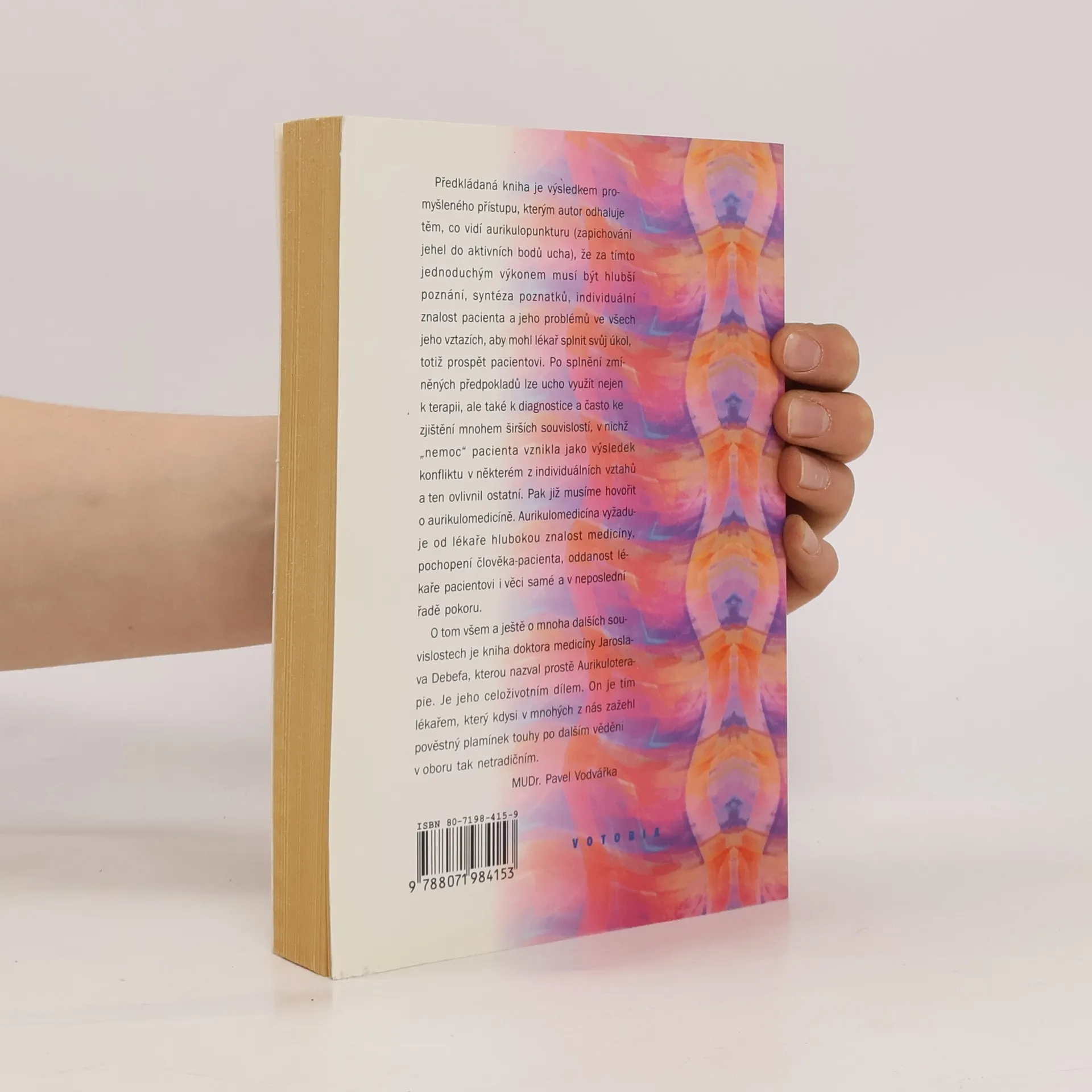 Předkládaná kniha je výsledkem promyšleného přístupu, kterým autor odhaluje těm, co vidí aurikulopunkturu (zapichovnání jehel do aktivních bodů ucha), že za tímto jednoduchým výkonem musí být hlubší poznání, syntéza poznatků, individuální znalost pacienta a jeho problémů ve všech jeho vztazích, aby mohl lékař splnit svůj úkol, totiž prospět pacientovi...