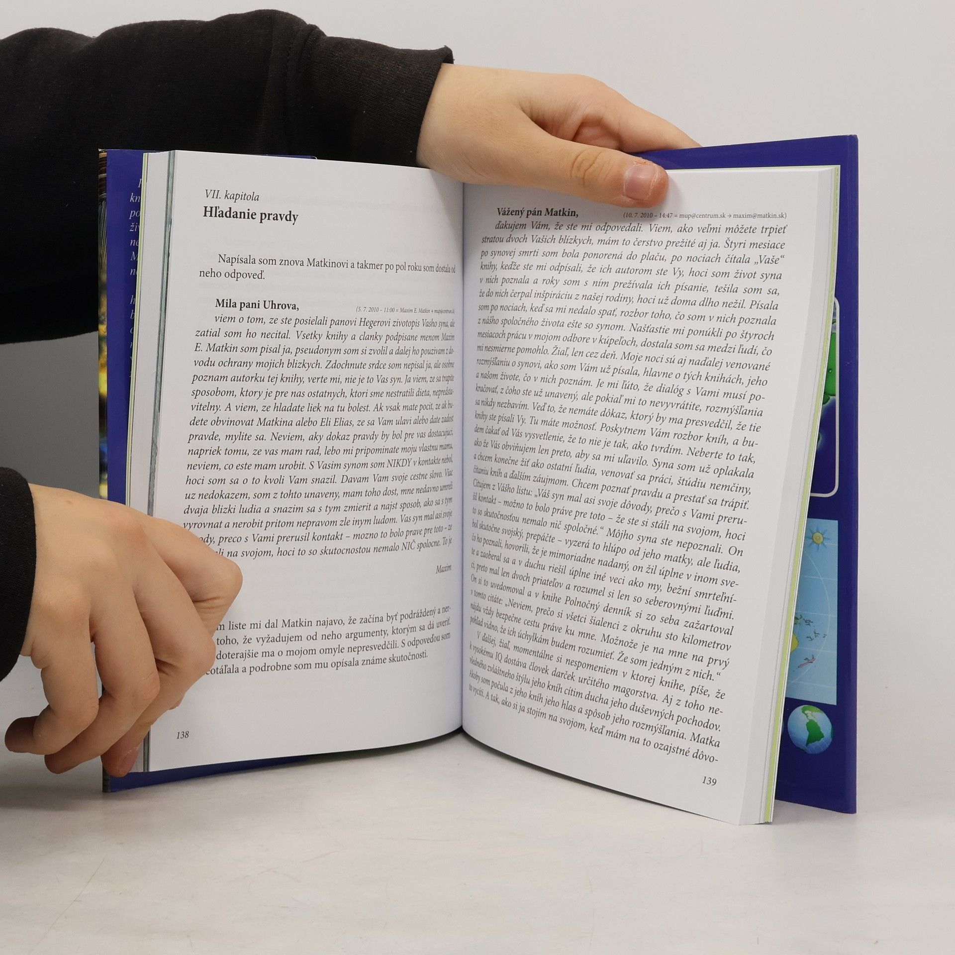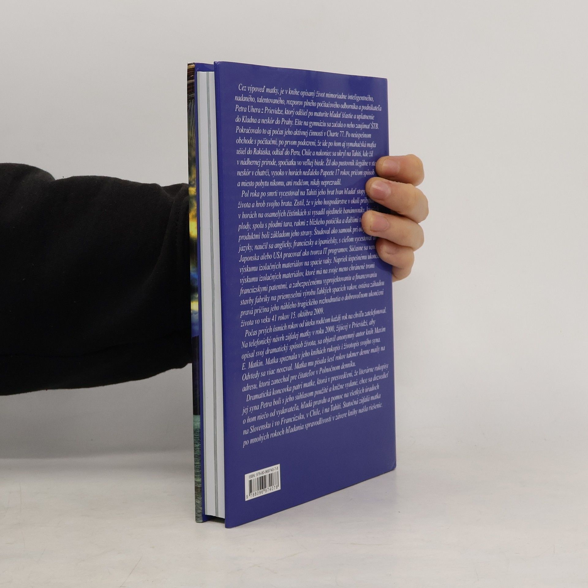 V knihe je cez výpoveď matky opísaný život mimoriadne inteligentného, talentovaného, rozporov plného počítačového odborníka a podnikateľa Petra Uhera z Prievidze, ktorý odišiel po maturite hľadať šťastie a uplatnenie do Kladna a neskôr do Prahy. Ešte na gymnáziu sa o neho začala zaujímať ŠTB. Pokračovalo to aj počas jeho aktívnej činnosti v Charte 77. Po neúspešnom obchode s počítačmi, po prvom podozrení, že ide po ňom aj vymáhačská mafia ušiel do Rakúska, odtiaľ do Peru, Chile a nakoniec sa ukryl na Tahiti, kde žil v nádhernej prírode. Žil ako pustovník ilegálne, v stane, neskôr v chatrči 17 rokov, pričom spôsob a miesto pobytu nikomu, ani rodičom neprezradil. Pol roka po Petrovej smrti vycestoval na Tahiti jeho brat Ivan hľadať hrob svojho brata a stopy života. Zistil, že študoval ako samouk pri olejovej lampe, venoval sa výskumu izolačných materiálov. Zostáva záhadou pravá príčina jeho náhleho tragického rozhodnutia dobrovoľného ukončenia života vo veku 41 rokov.