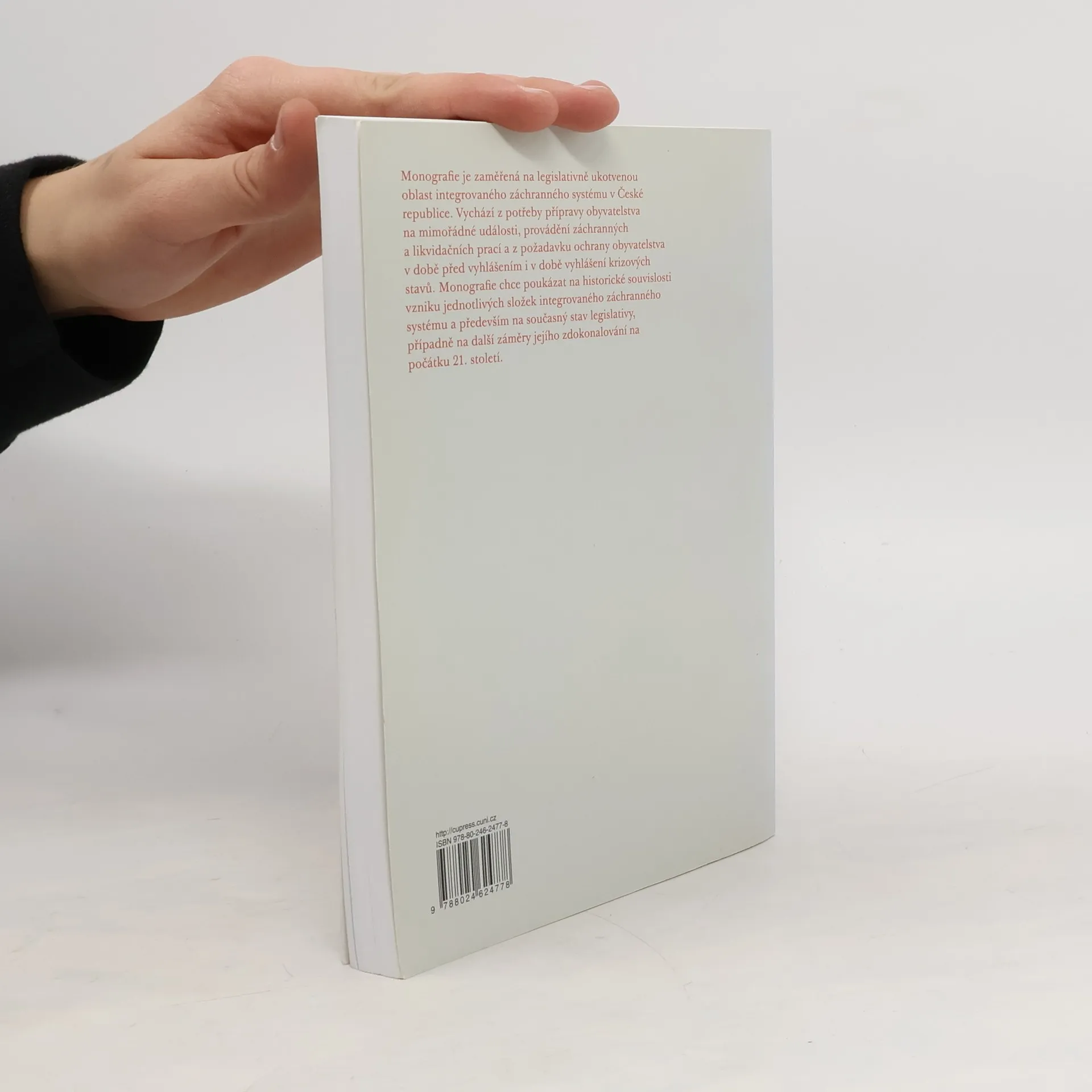 Monografie je zaměřená na legislativně ukotvenou oblast integrovaného záchranného systému v ČR. Vychází z potřeby přípravy obyvatelstva na mimořádné události, provádění záchranných a likvidačních prací a z požadavku ochrany obyvatelstva v době před vyhlášením i v době vyhlášení krizových stavů. Monografie chce poukázat na historické souvislosti vzniku jednotlivých složek integrovaného záchranného systému a především na současný stav legislativy, případně na další záměry jejího zdokonalování na počátku 21. století.