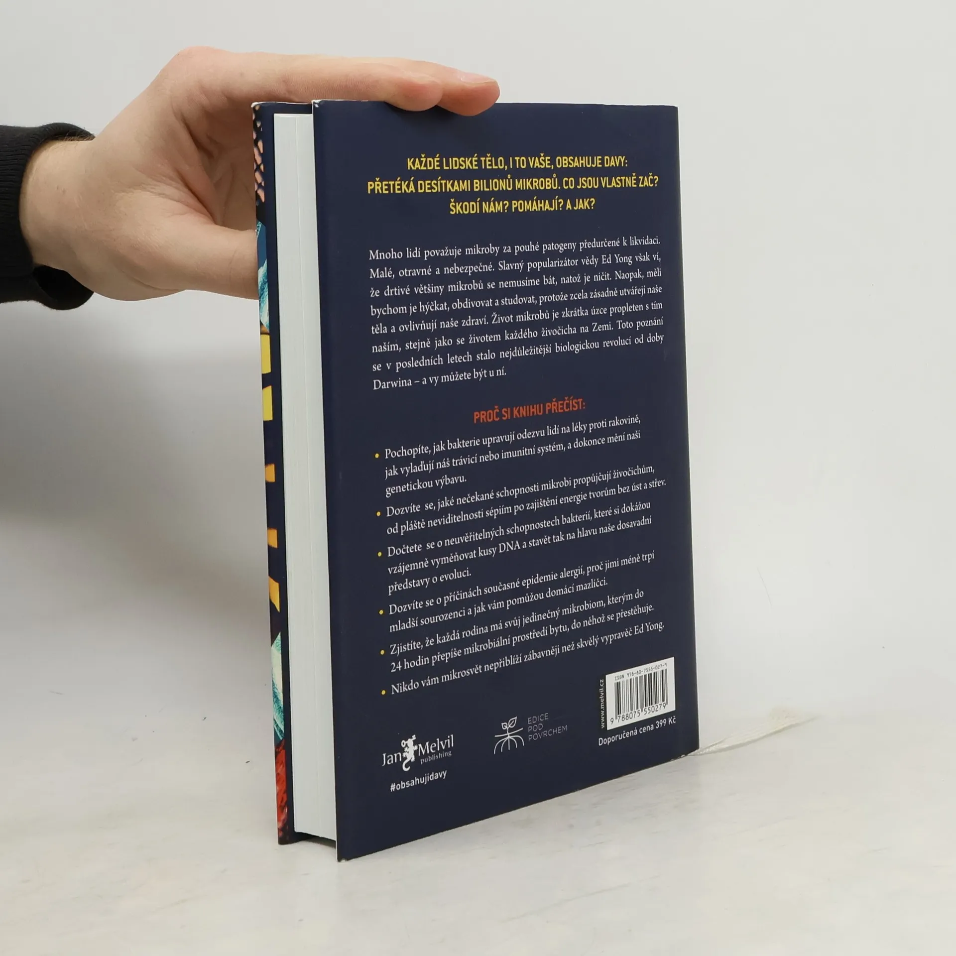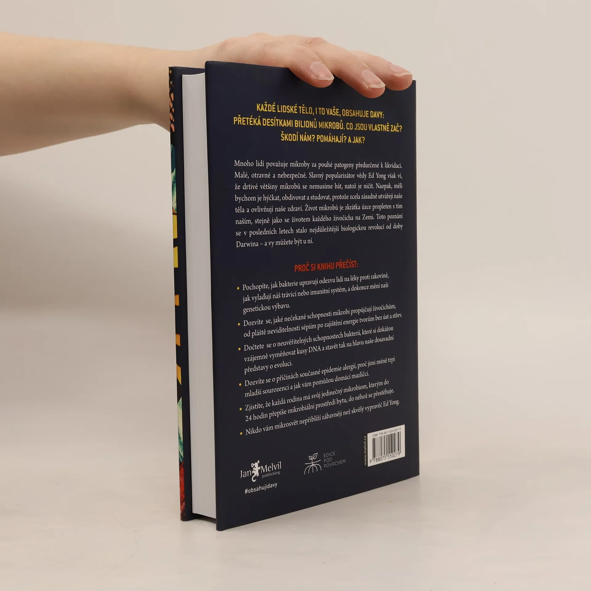 Přelomové, nádherně poučné a velmi zábavné pojednání o nejzásadnější revoluci v biologii od dob Darwina - pohled na svět „očima mikroba“, který odhaluje kouzelný a radikálně přestavěný obraz života na Zemi. Každý živočich, ať už člověk, sépie nebo vosa, je domovem milionů bakterií a dalších mikrobů. Ed Yong, jehož humor je stejně evidentní jako jeho vzdělání, nás ponouká k tomu, abychom se na sebe a své zvířecí společníky podívali v novém světle - ne jako na jedince, ale spíše jako na vzájemně propojené a závislé davy, kterými nepochybně jsme. Mikrobi v našem těle jsou součástí našeho imunitního systému a chrání nás před chorobami. V hlubokých oceánech se nacházejí záhadní tvorové bez úst a střev, kterým veškerou energii zajišťují mikrobi. Bakterie poskytují sépiím pláště neviditelnosti, pomáhají škůdcům likvidovat lesy a umožňují parazitům způsobovat nemoci postihující miliony lidí. Mnoho lidí mikroby považuje za patogeny předurčené k likvidaci, ale ti, kteří s námi žijí - mikrobiom - formují naše tělo, chrání naše zdraví, utvářejí naši identitu a zaručují nám neuvěřitelné schopnosti. V této ohromující knize vás Ed Yong zavede na velkolepou výpravu za našimi mikrobiálními partnery a představí vám vědce v předních liniích vývoje. Změní váš pohled na přírodu a zároveň i vnímání našeho místa v ní.