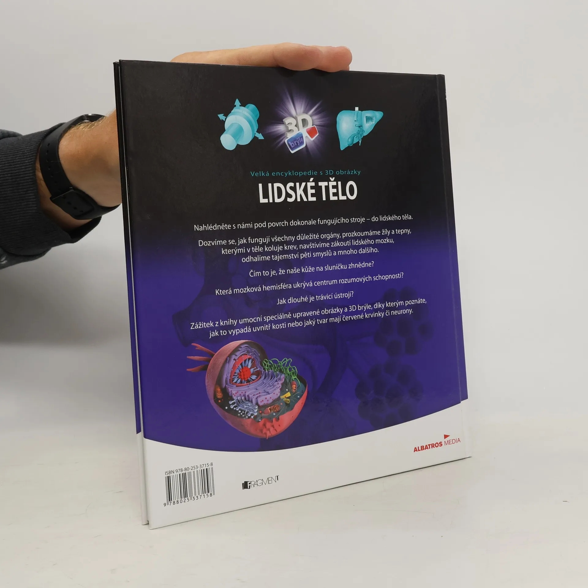 Nahlédněne s námi pod povrch dokonale fungujícího stroje - do lidského těla. Dozvíme se, jak fungují všechny důležité orgány, prozkoumáme žíly a tepny, kterými v těle koluje krev, navštívíme zákoutí lidského mozku, odhalíme tajemství pěti smyslů a mnoho dalšího. Čím to je, že naše kůže na sluníčku zhnědne? Která mozková hemisféra ukrývá centrum rozumových schopností? Jak dlouhé je trávicí ústrojí? Zážitek z knihy umocní speciálně upravené obrázky a 3D brýle, díky kterým poznáte, jak to vypadá uvnitř kosti nebo jaký tvar mají červené krvinky či neurony.