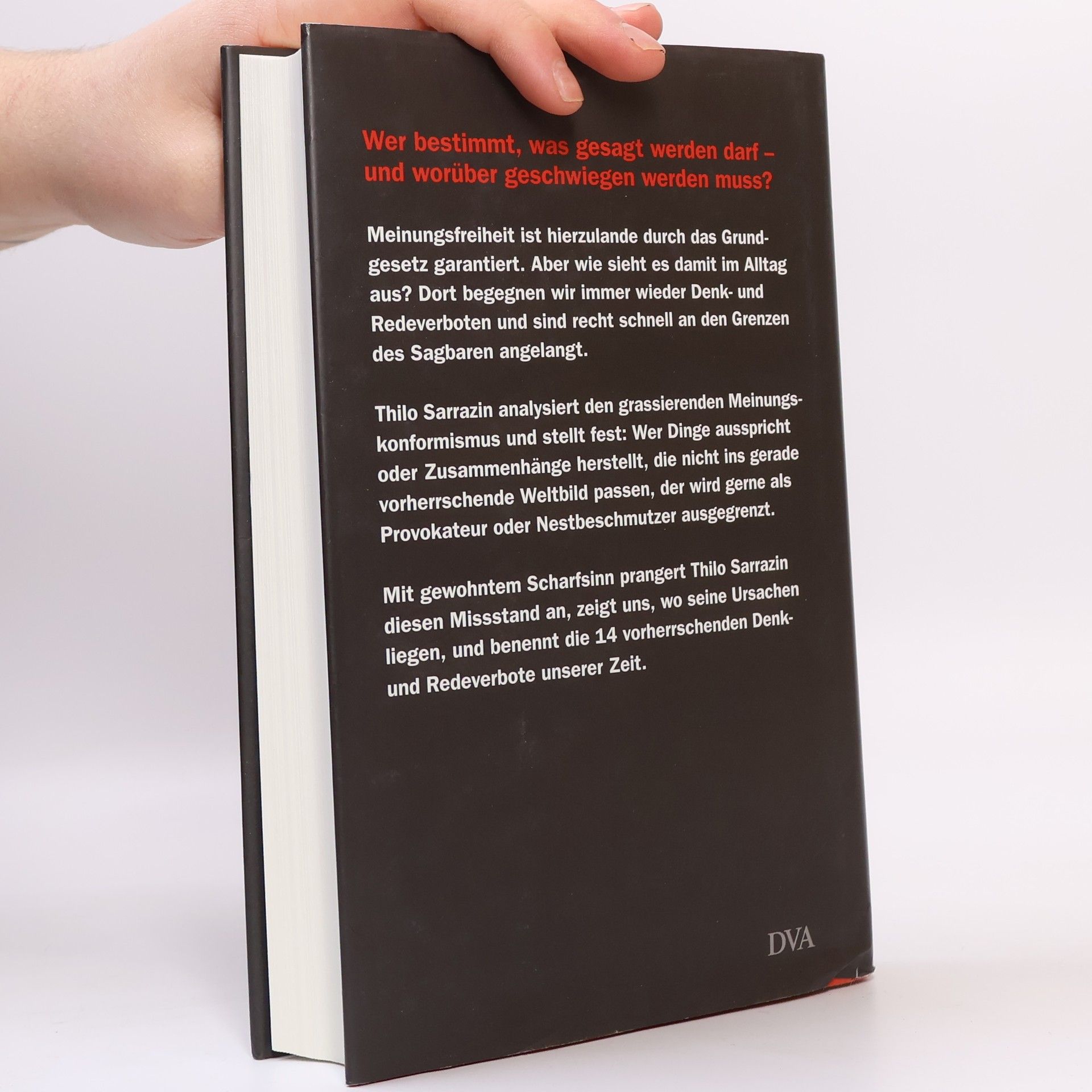 Meinungsfreiheit ist ein Grundrecht. Doch im Alltag begegnet man so manchem Denk- und Redeverbot. Thilo Sarrazin analysiert in seinem neuen Buch den grassierenden Meinungskonformismus. Wer Dinge ausspricht, die nicht ins gerade vorherrschende Weltbild passen, der wird gerne als Provokateur oder Nestbeschmutzer ausgegrenzt. Mit gewohntem Scharfsinn prangert Thilo Sarrazin diesen Missstand an, zeigt auf, wo seine Ursachen liegen, und benennt die 14 vorherrschenden Denk- und Redeverbote unserer Zeit.